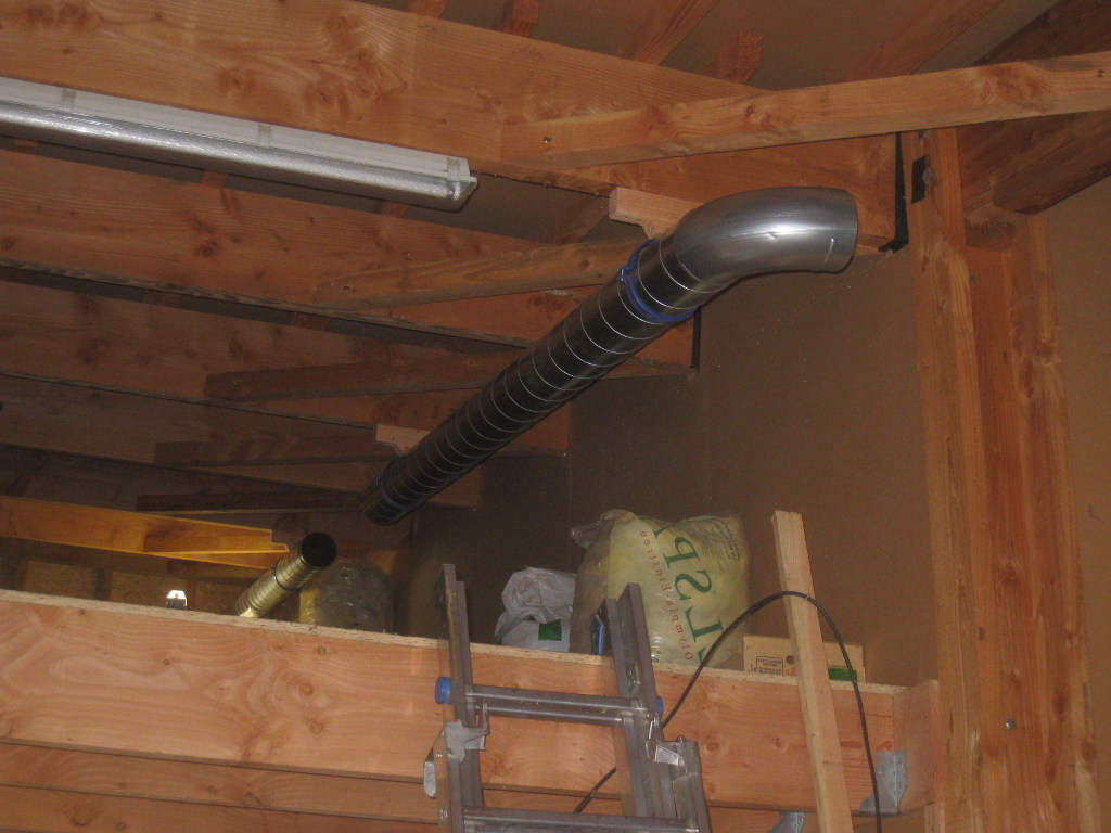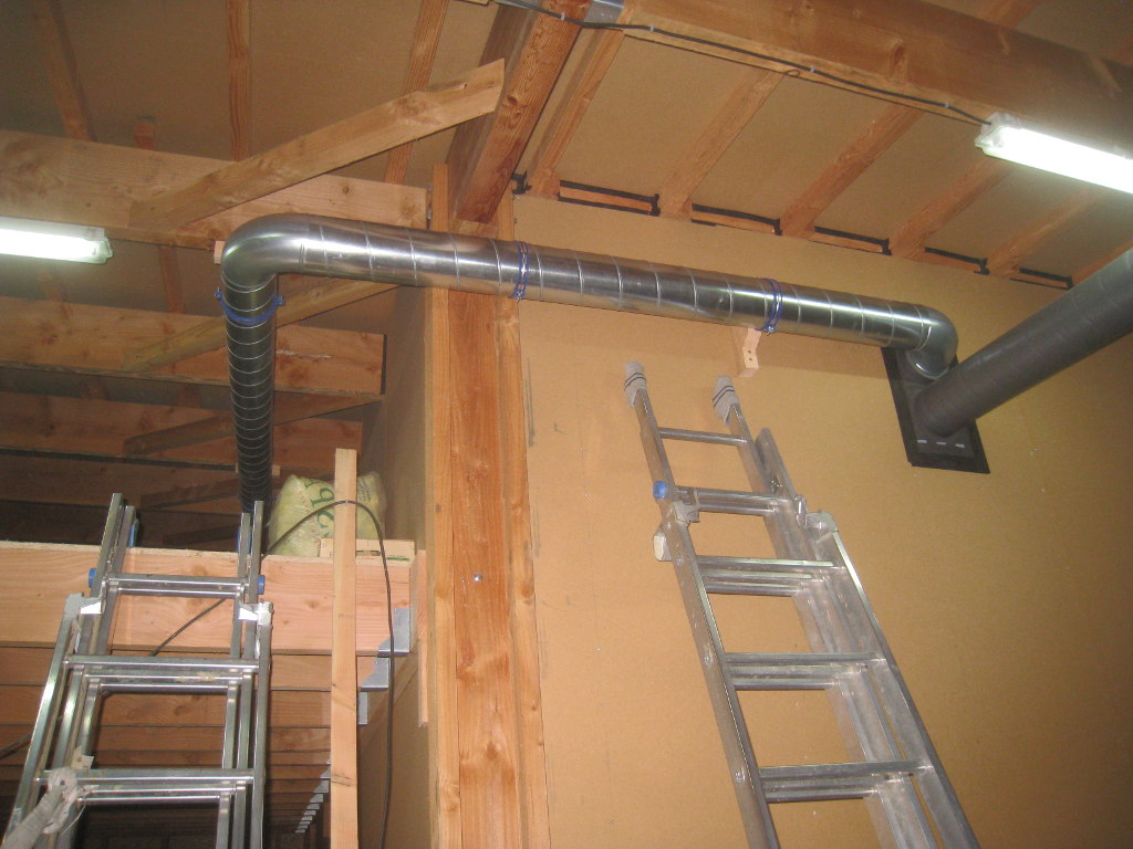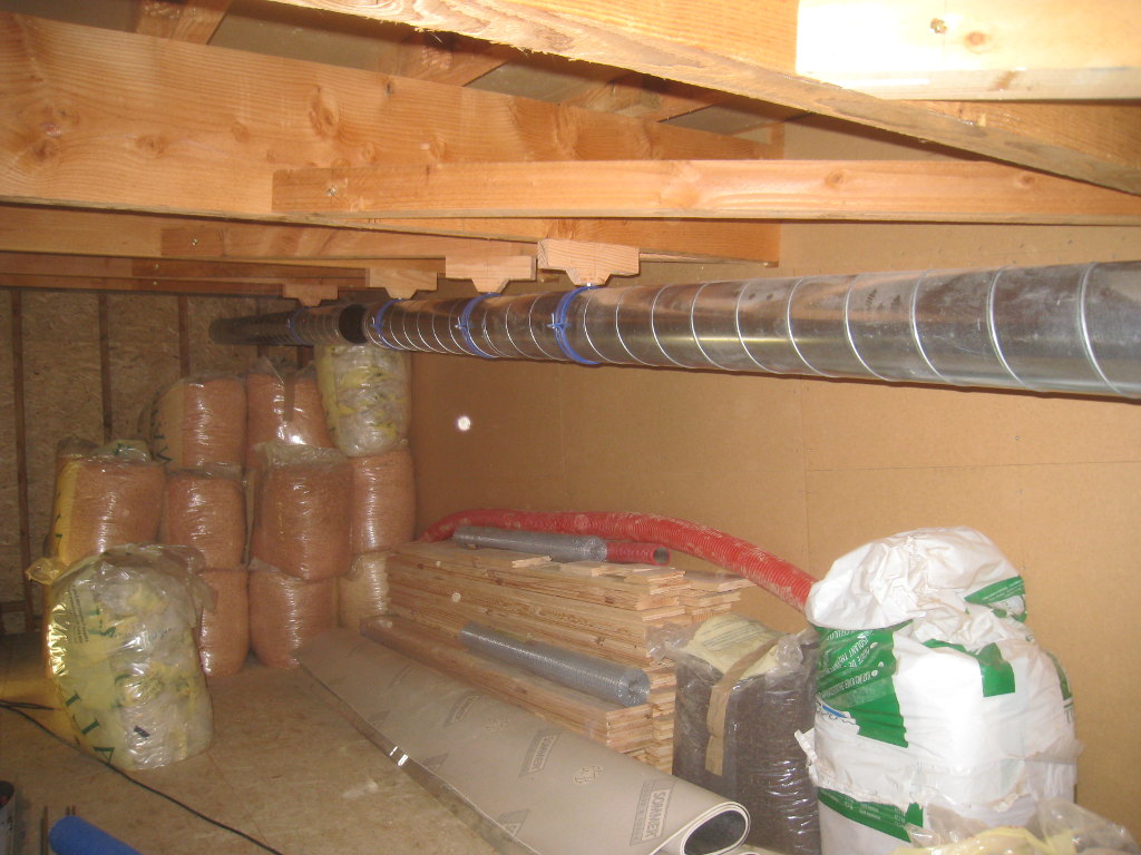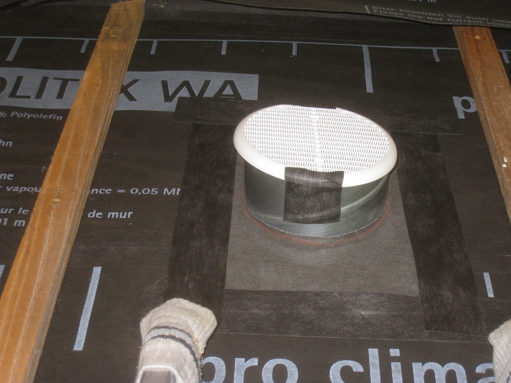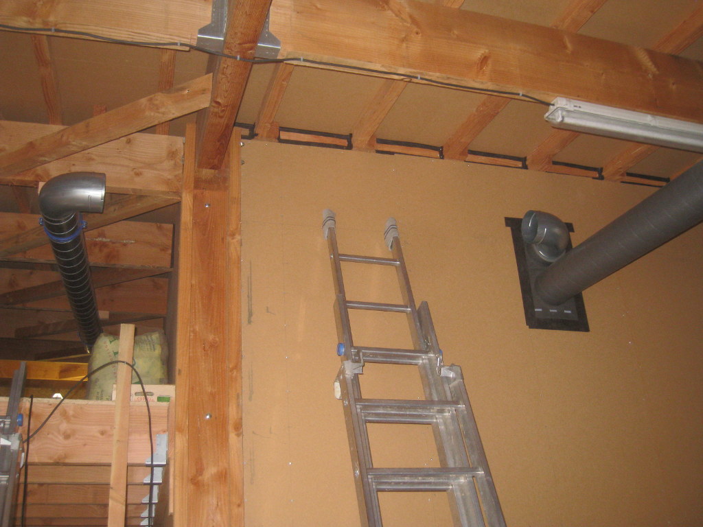 2013/04/02 : Ventilation (8) - EntréeMis à jour : 23 février 2016 | Imprimer | Affichages : 2357Nous continuons avec le réseau d'aspiration depuis l'extérieur : Le tuyau passe dans la buanderie et le grenier pour rejoindre la façade Sud : L'aspiration se fera au Sud sous le brise-soleil : Note : la grille n'est pas définitive ...