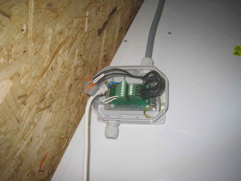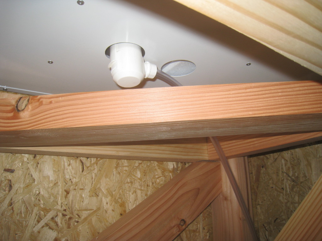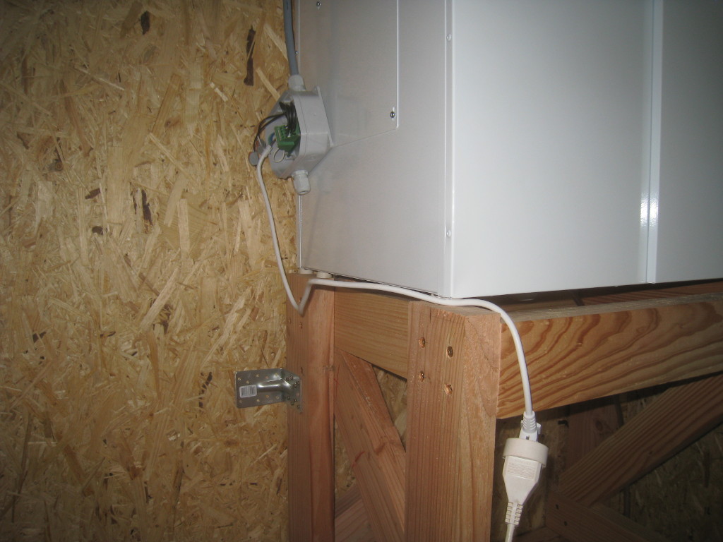 2013/04/06 : Ventilation (12) - Run !Mis à jour : 23 février 2016 | Imprimer | Affichages : 2092Ça y est, la ventilation fonctionne : Même si le raccordement est temporaire, tant pour l'électricité : Que pour l'évacuation des condensats :
