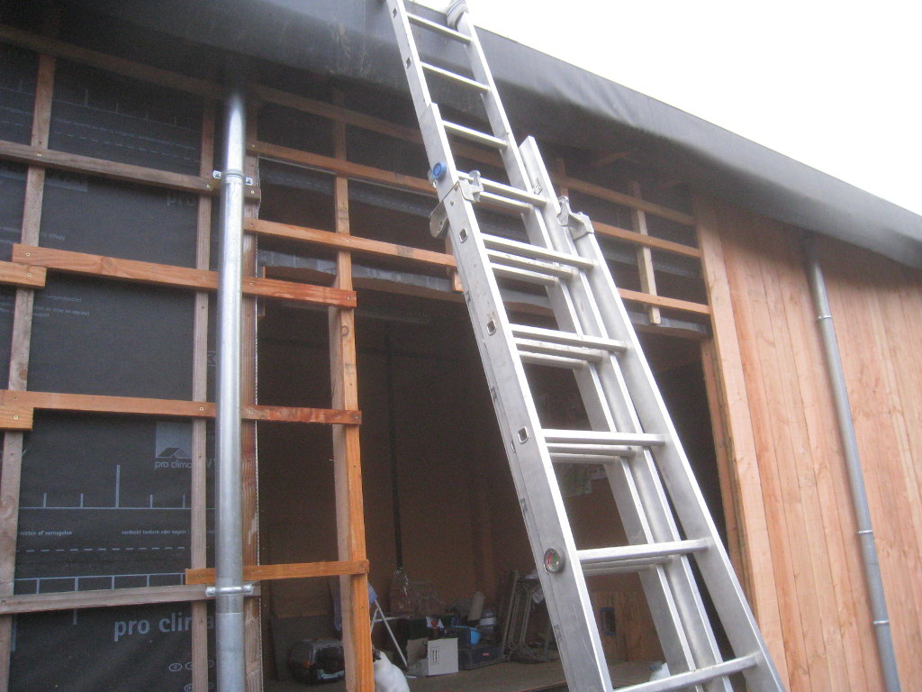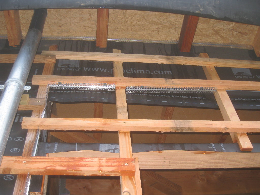En posant le bardage du côté Nord, j'aperçois, juste au dessus de l'entrée, des écoulements d'eau le long du parepluie qui protège (heureusement) l'enveloppe isolée, sur à peu près un mètre de large, soit trois chevrons :