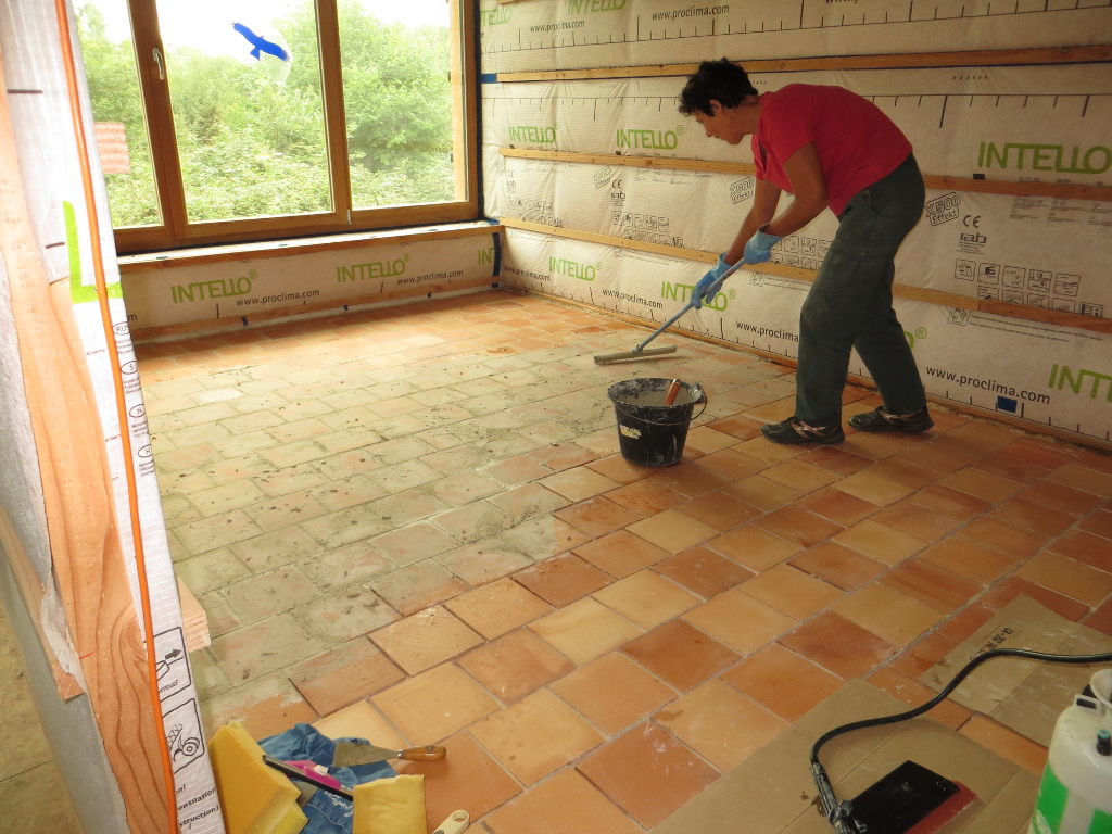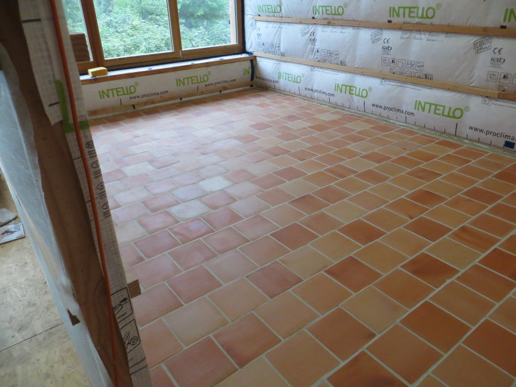 Pose de la chappe et des tomettes dans la grande salle (côté Sud de la travée n°4) :