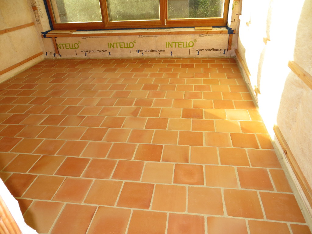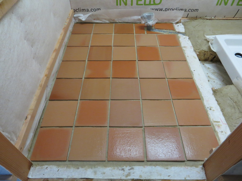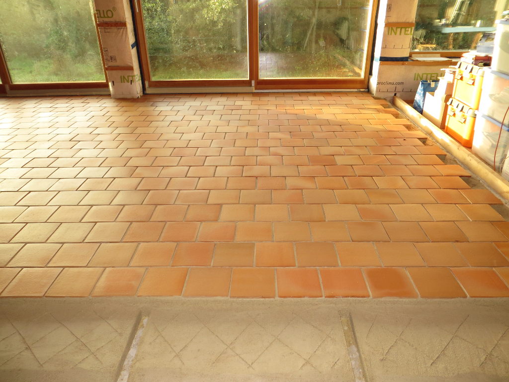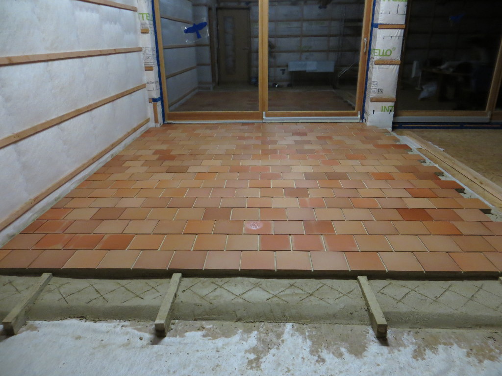 Pose de la chappe et des tomettes dans la grande salle (côté Sud de la travée n°3) :