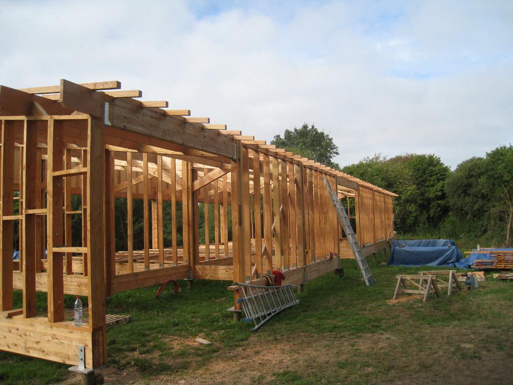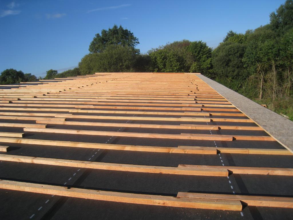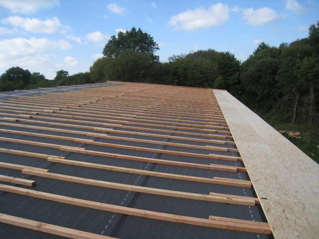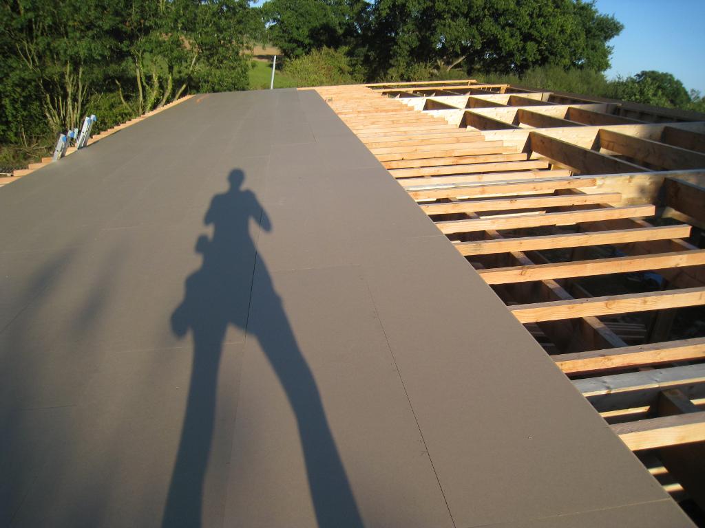 Nous commençons par le côté le plus bas de la toiture, et décidons de poser les chevrons et les panneaux de DFP au fur et à mesure.