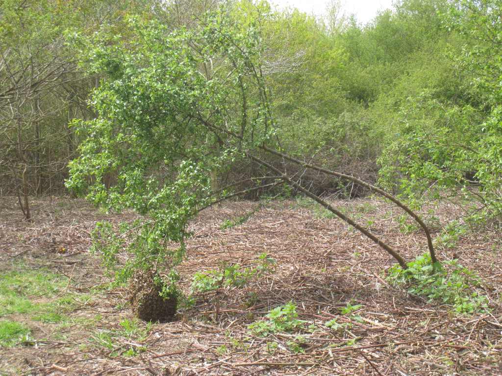 Mais à ma seconde visite un peu plus tard, je comprend mieux : c'est un essaim qui cherchait à se poser, et qui, finalement, s'est accroché à un petit prunelier qui ploie sous le poids :
