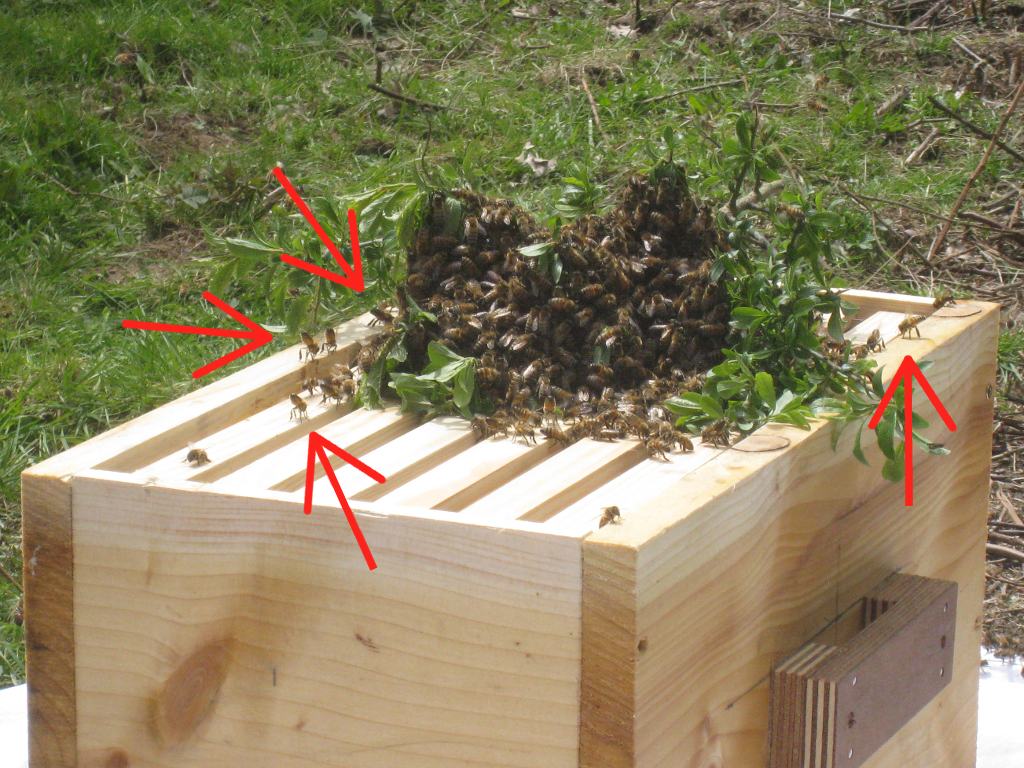 Voyez (flèches rouges) toutes ces abeilles les fesses en l'air et les ailes battantes : quand la reine est descendue dans la ruchette et a validé les lieux, ces abeilles envoient des phéromones tout autour pour battre le rappel des troupes :