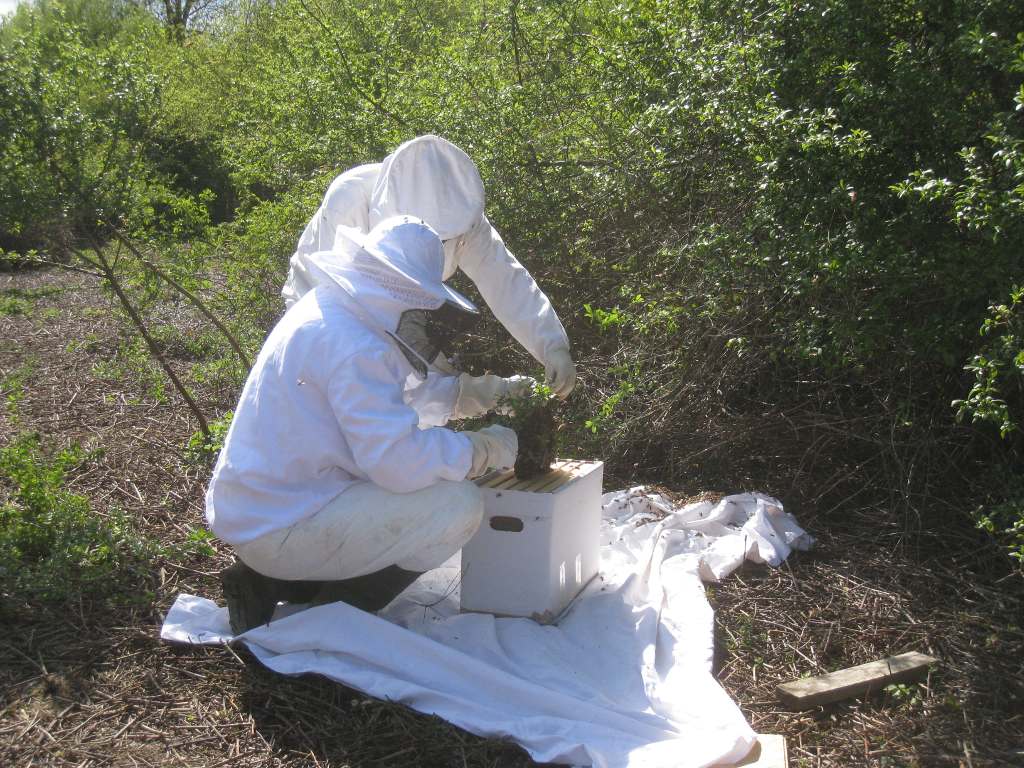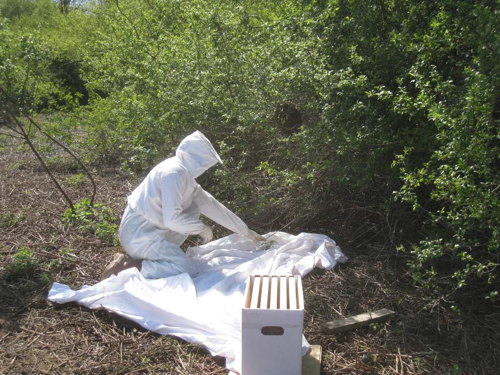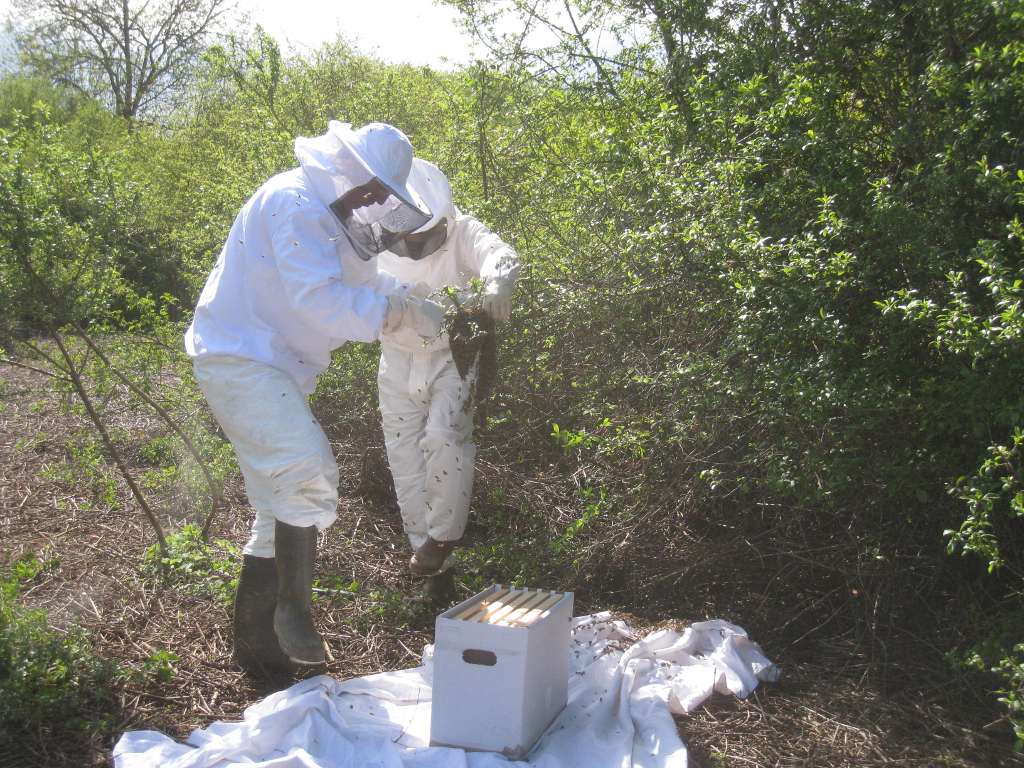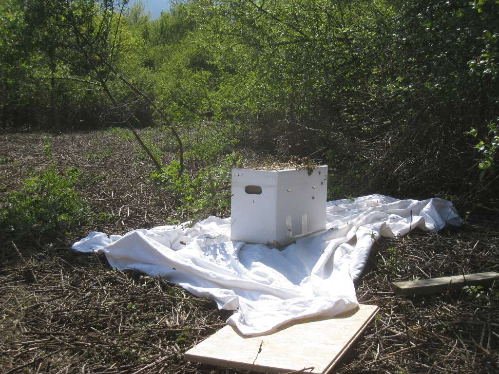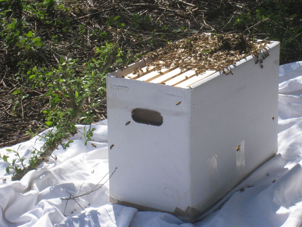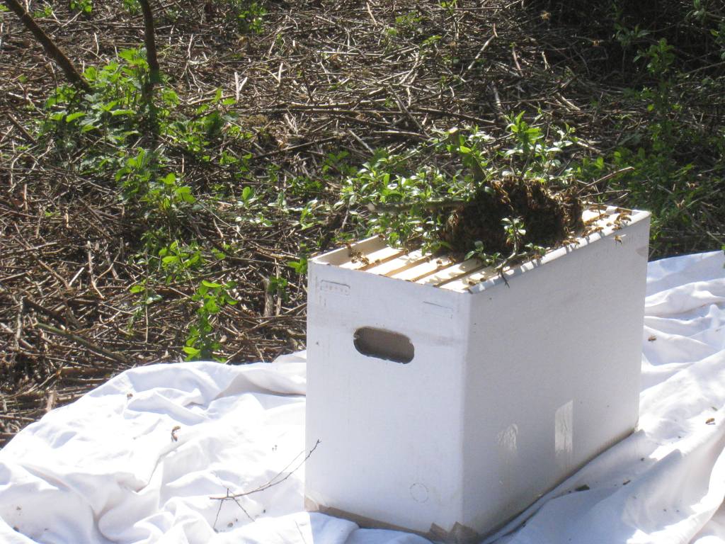 Après un peu d'élagage, l'essaim est déposé sur une ruchette :