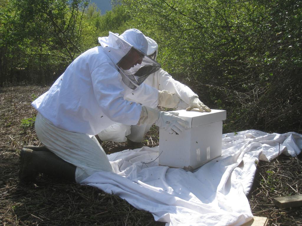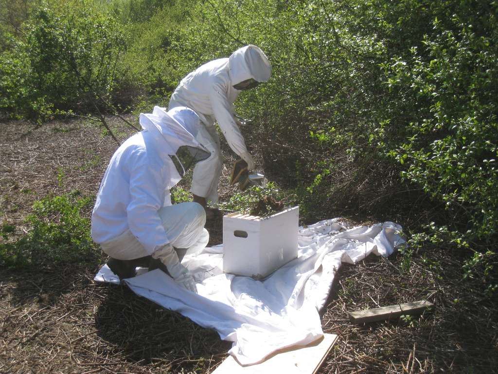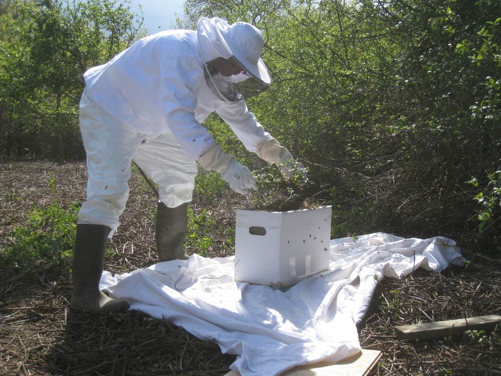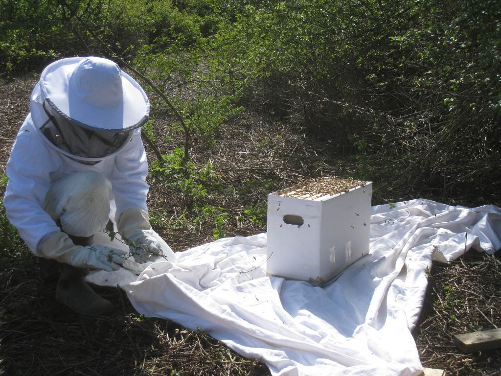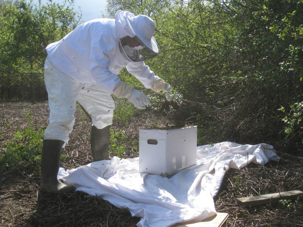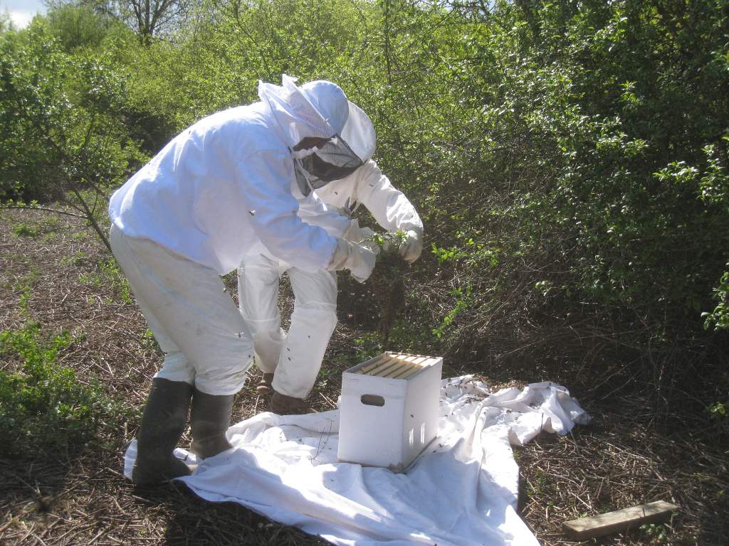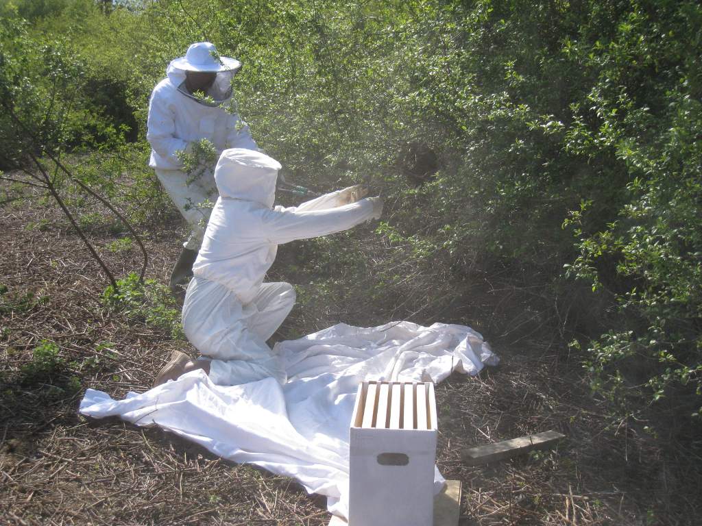 Après un peu d'élagage, l'essaim est déposé sur une ruchette :