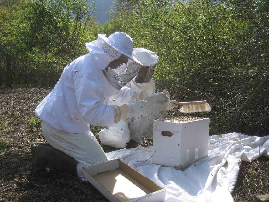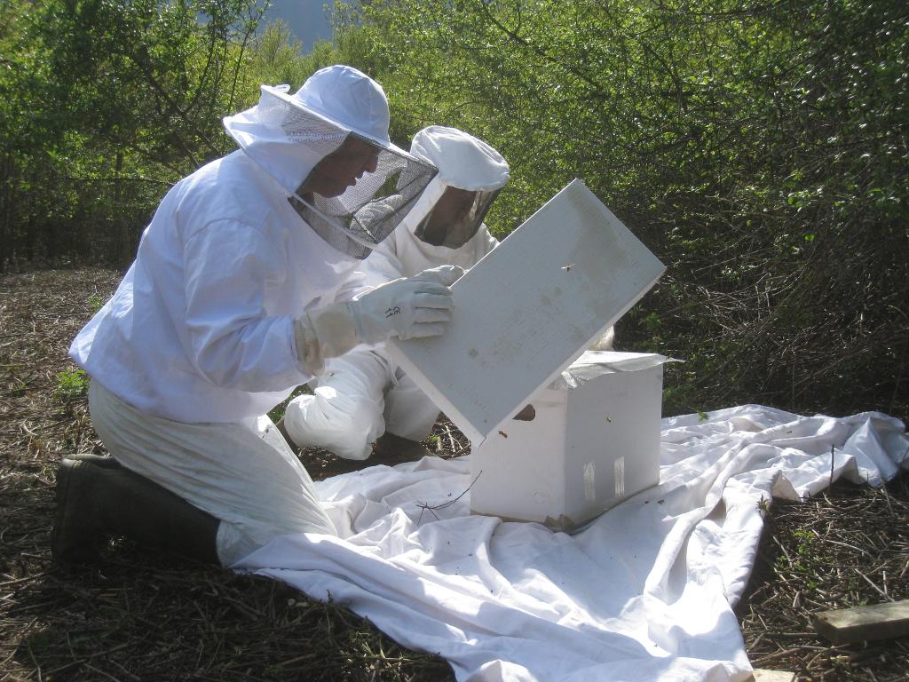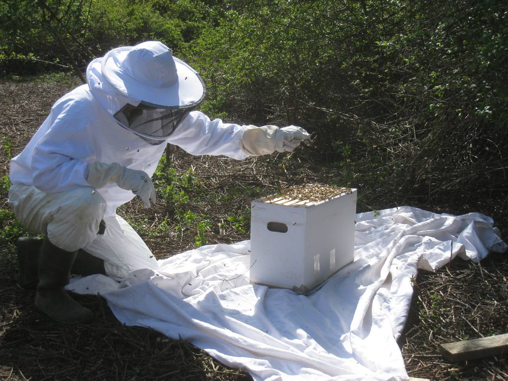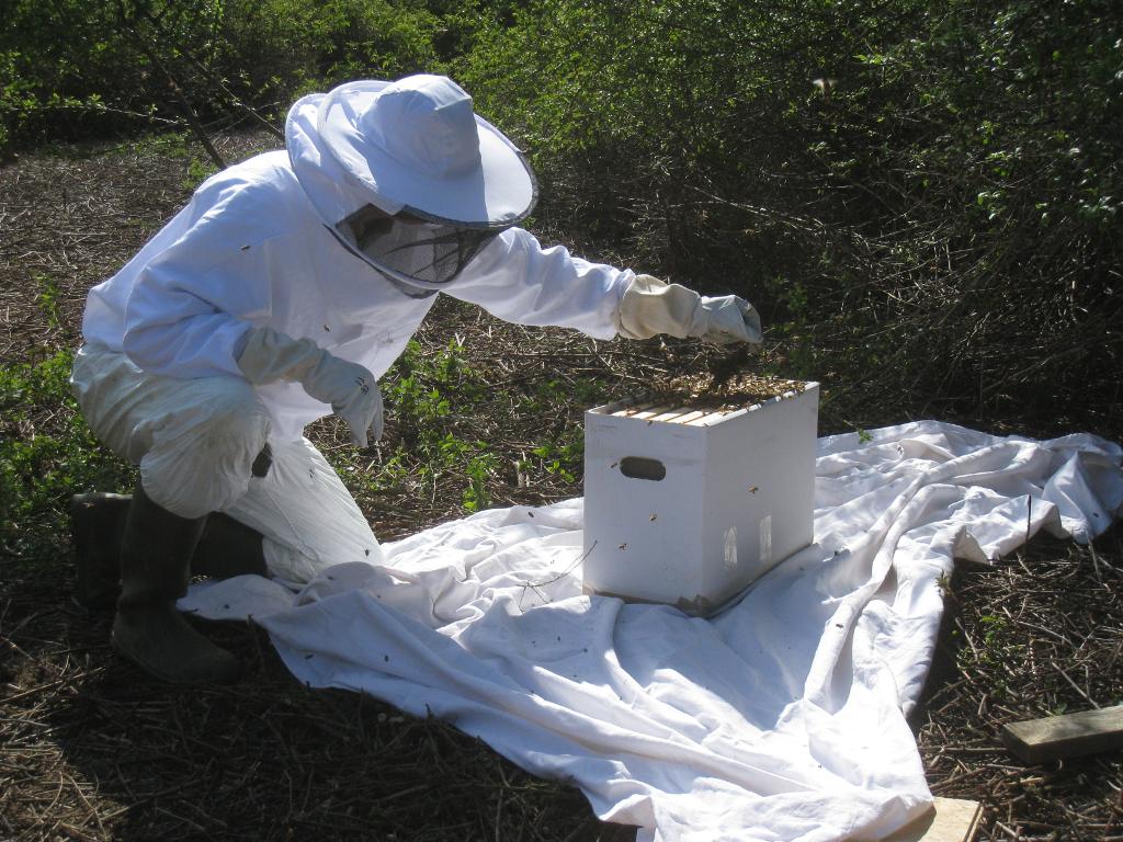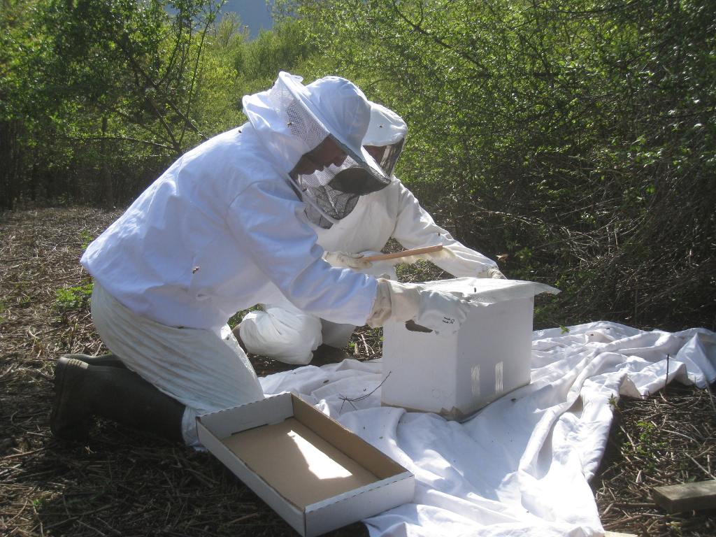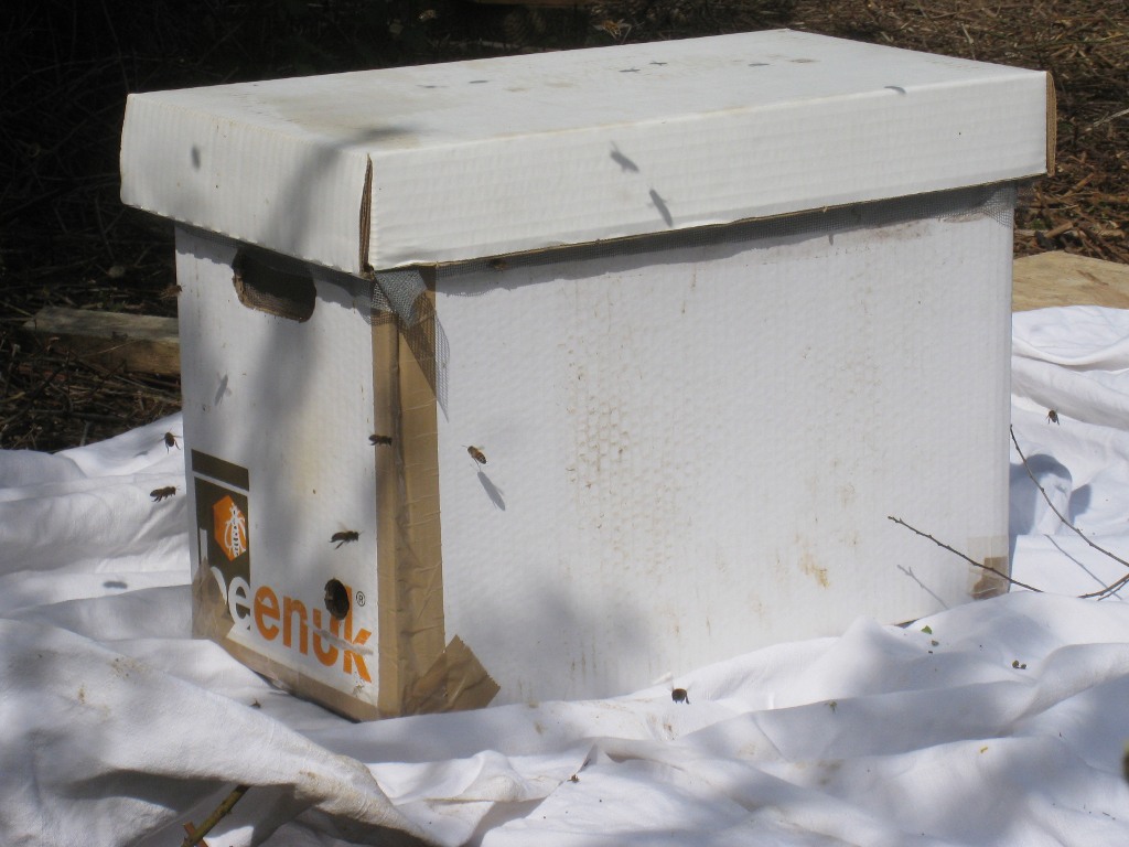 Après un peu d'élagage, l'essaim est déposé sur une ruchette :