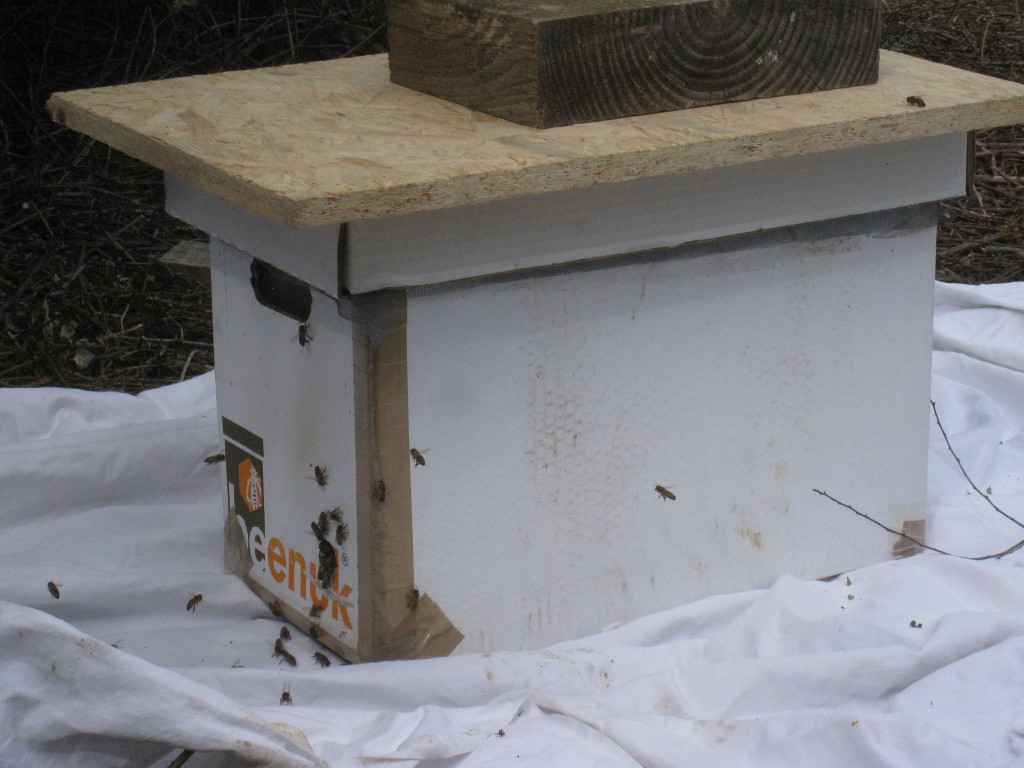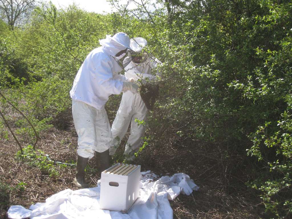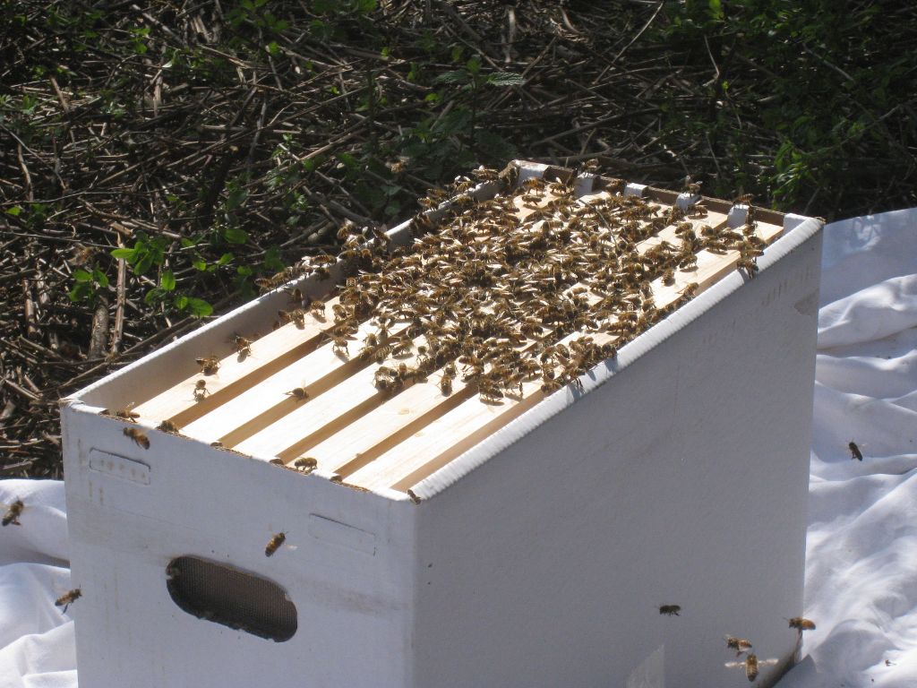 On prend ainsi le risque que l'essaim ressorte et se fasse la malle, mais d'un autre côté on récupère à peu près toutes les abeilles ...