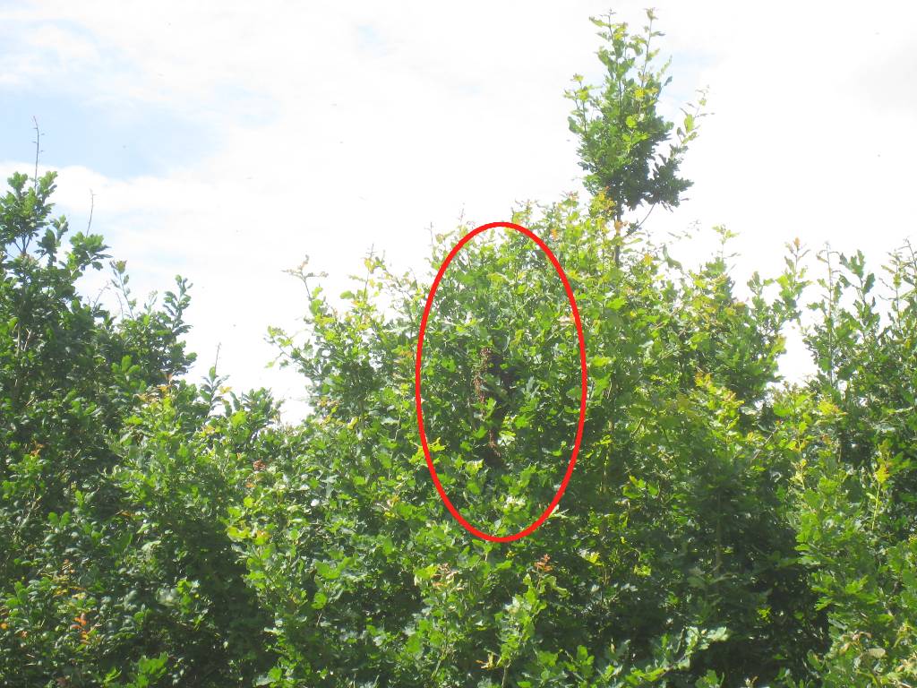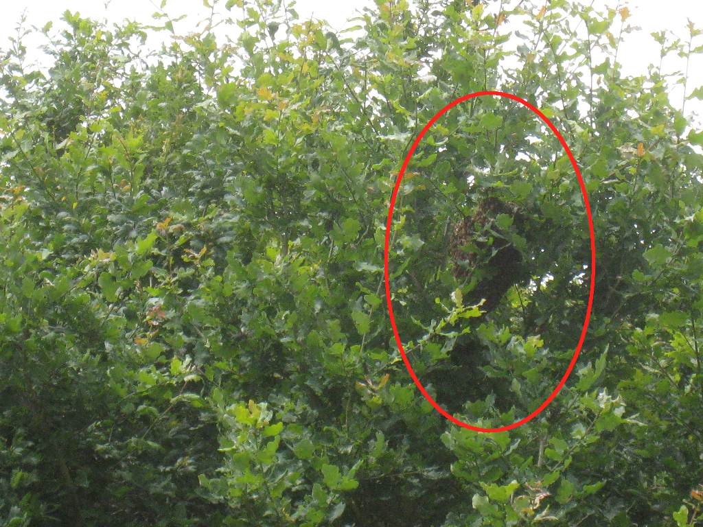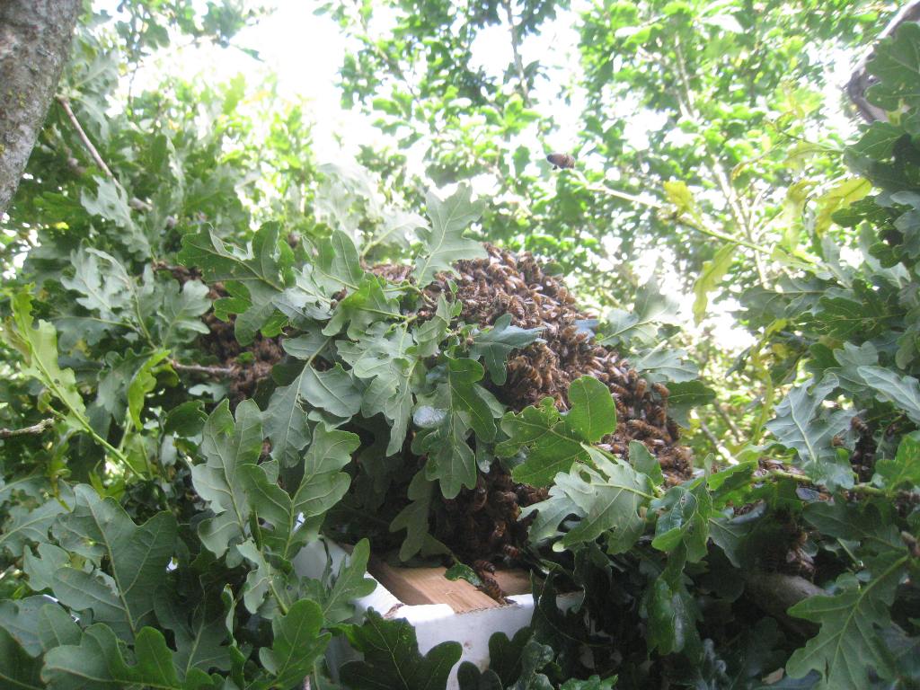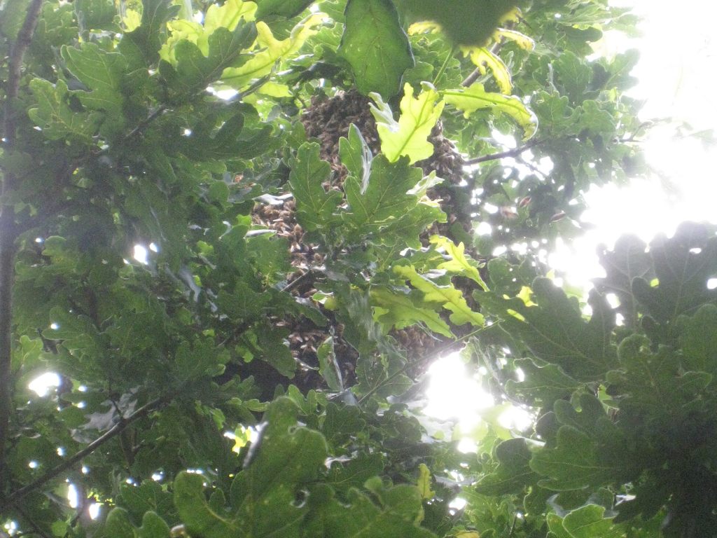 Entre temps, l'essaim me fait une petite frayeur : un instant j'ai cru qu'il était parti, mais il s'est heureusement contenté de se déplacer sur le chêne d'à côté.