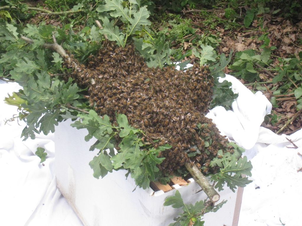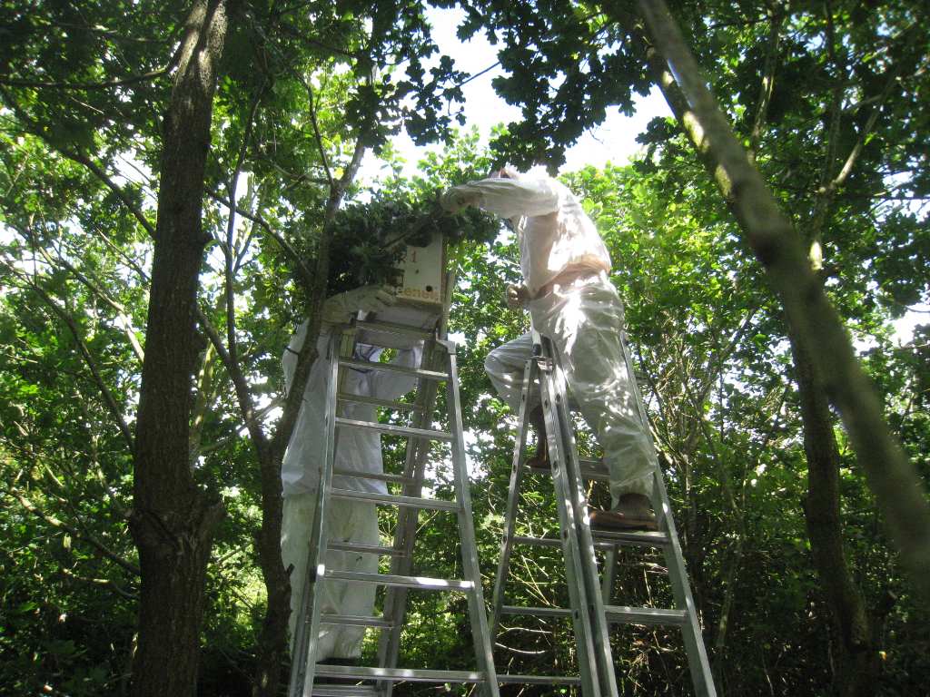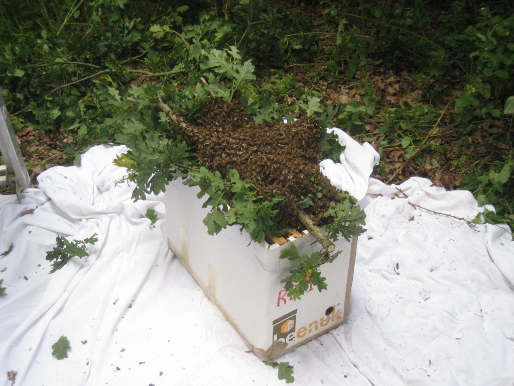 Une paire d'échelles montées en escabeau, un gars à tenir la branche, un autre à tenir la ruchette, le troisième avec le sécateur, et l'essaim se retrouve gentiment posé sur la ruchette.