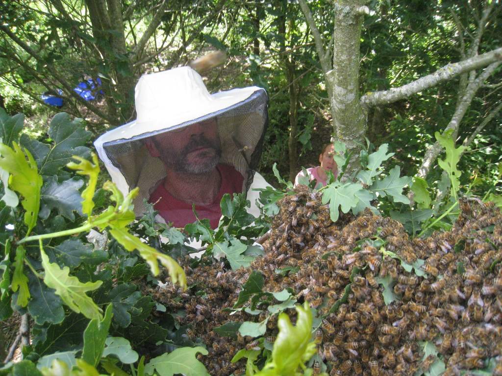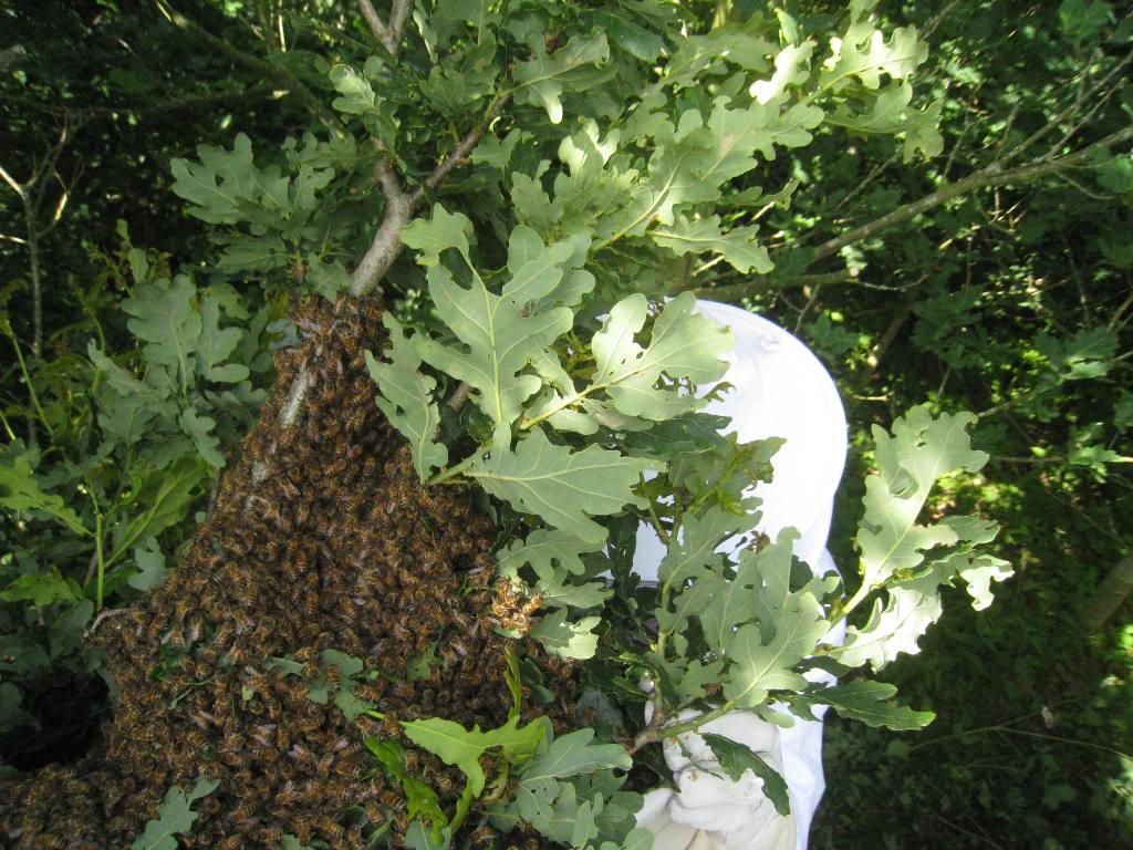 Ce dimanche midi, en allant visiter le rucher, mon attention est attirée par un bruissement désormais caractéristique. Et je ne me trompe pas : en haut d'un petit chêne, je distingue un essaim :