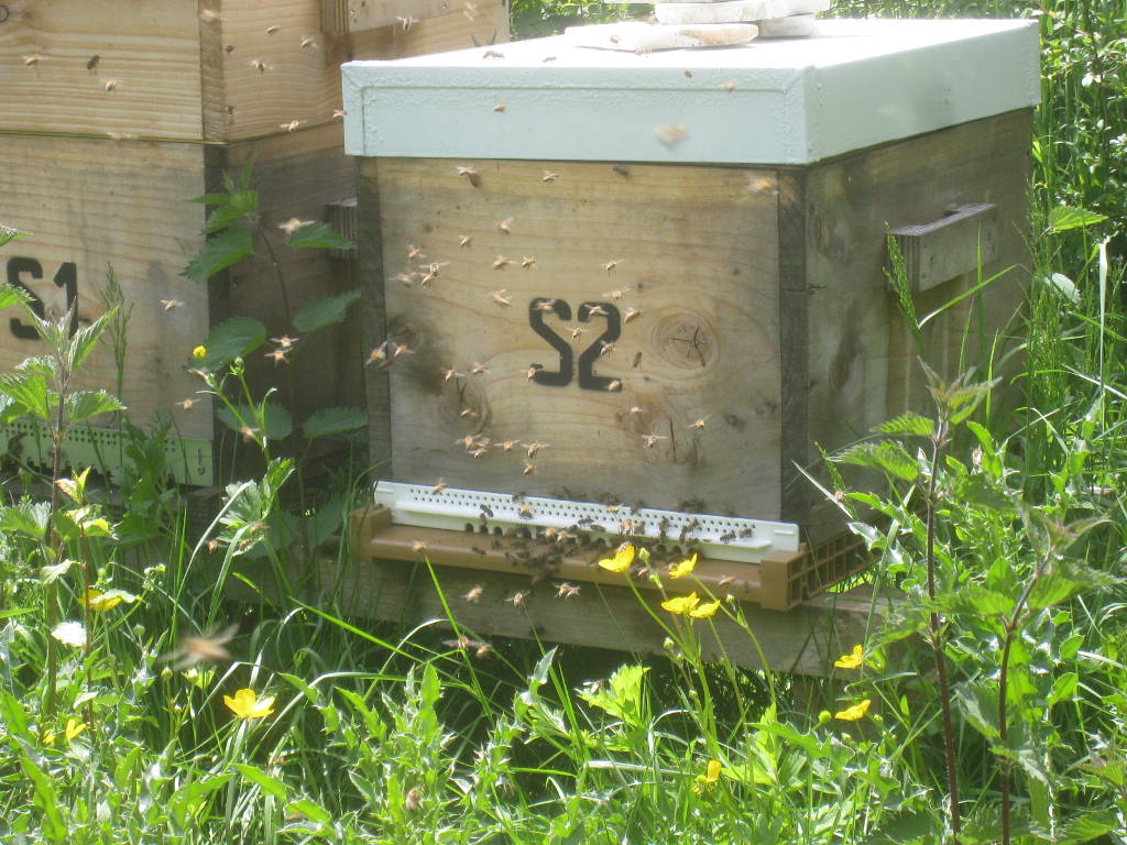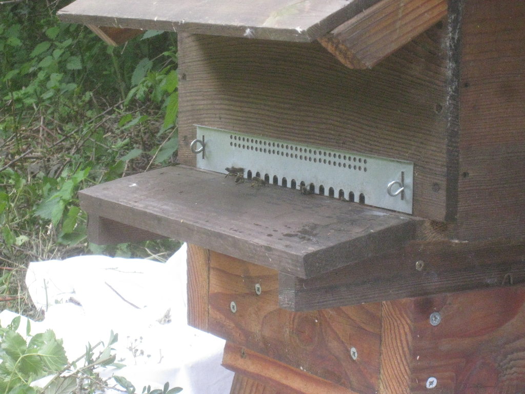 Petite visite au rucher, après le déjeuner. Sur la planche d'envol d'une ruche, une activité inhabituelle.