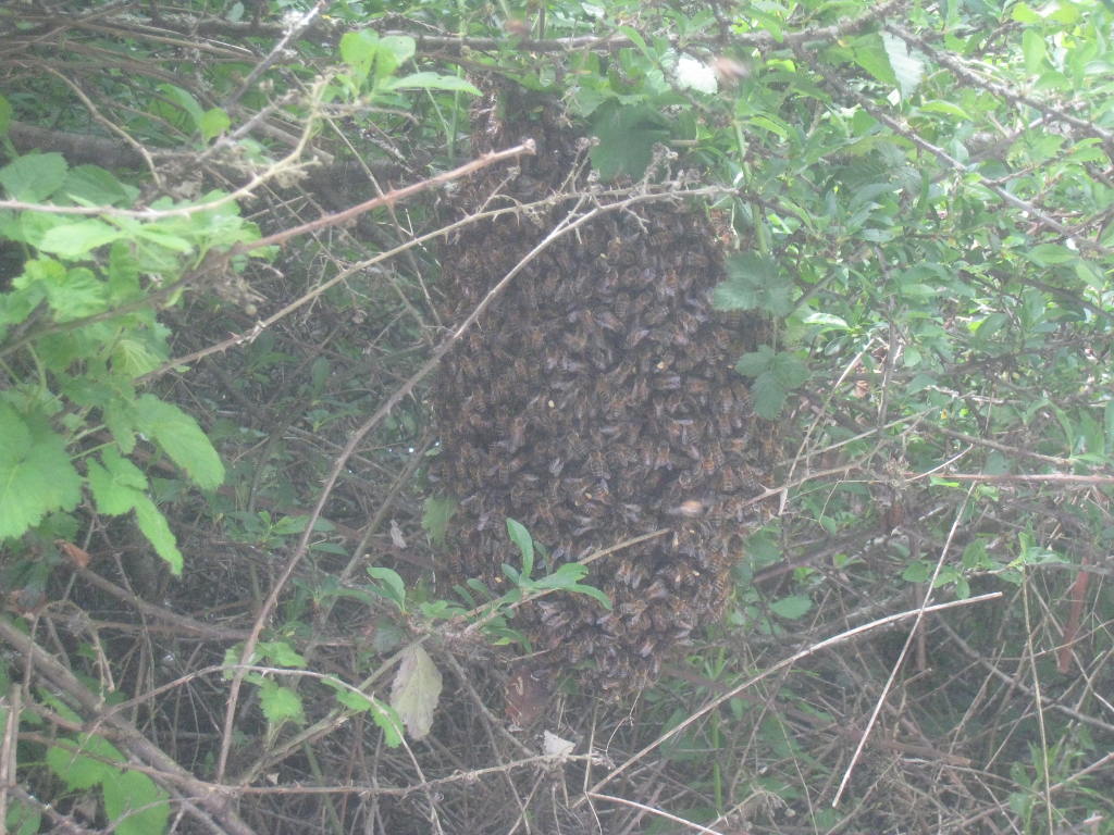 Je vais chercher mon appareil photo, et en revenant, je vois un essaim sortir de la ruche. Cela ne dure que quelques petites minutes.