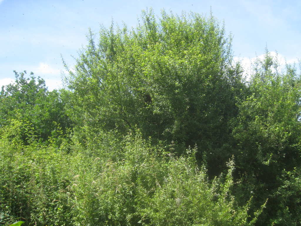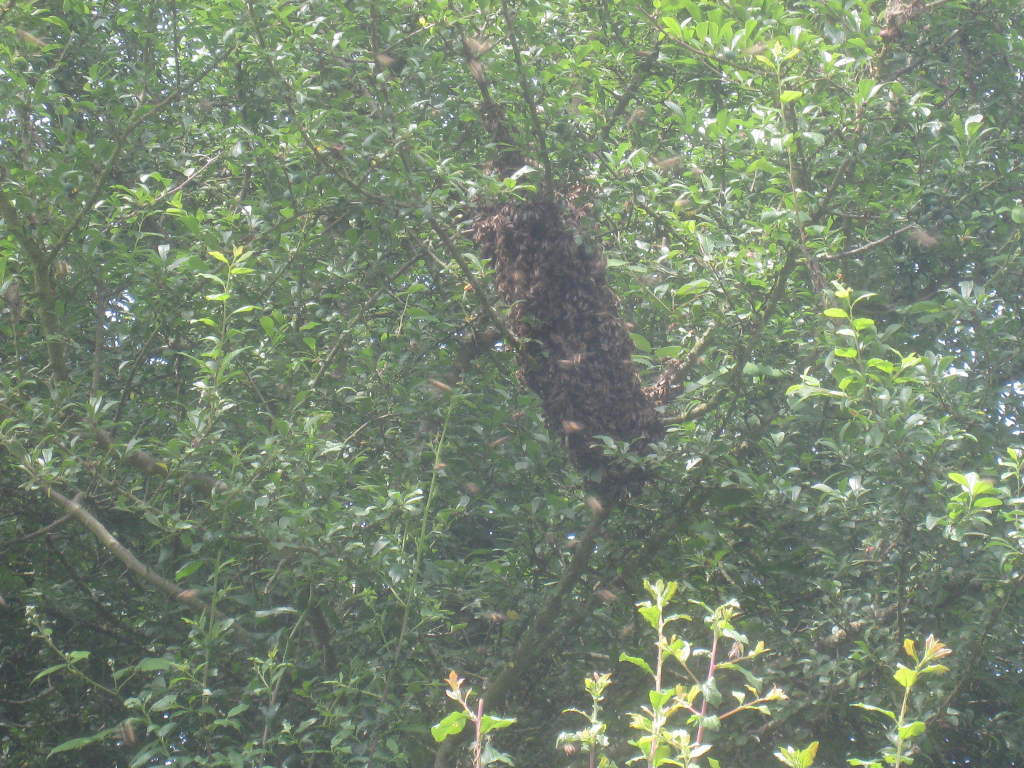 Lundi, en début d'après-midi, j'arrive au rucher cinq minutes trop tard pour voir de quelle ruche il sort, mais un nouvel essaim se pose sur un prunelier :