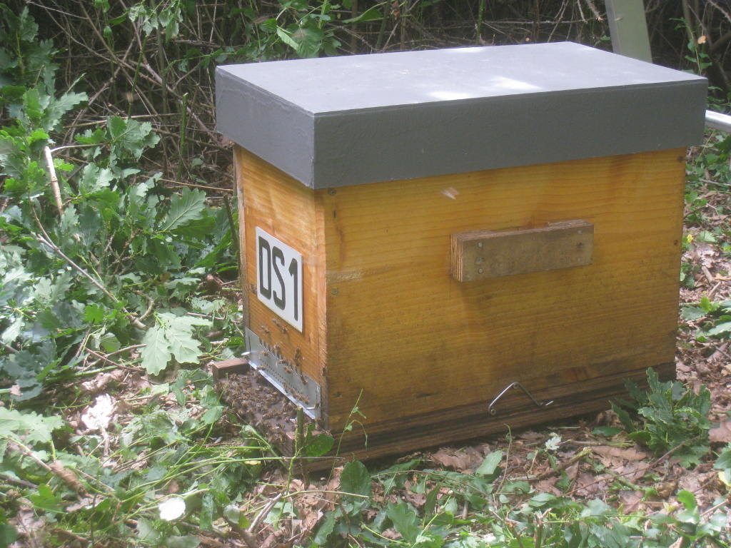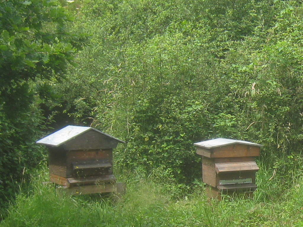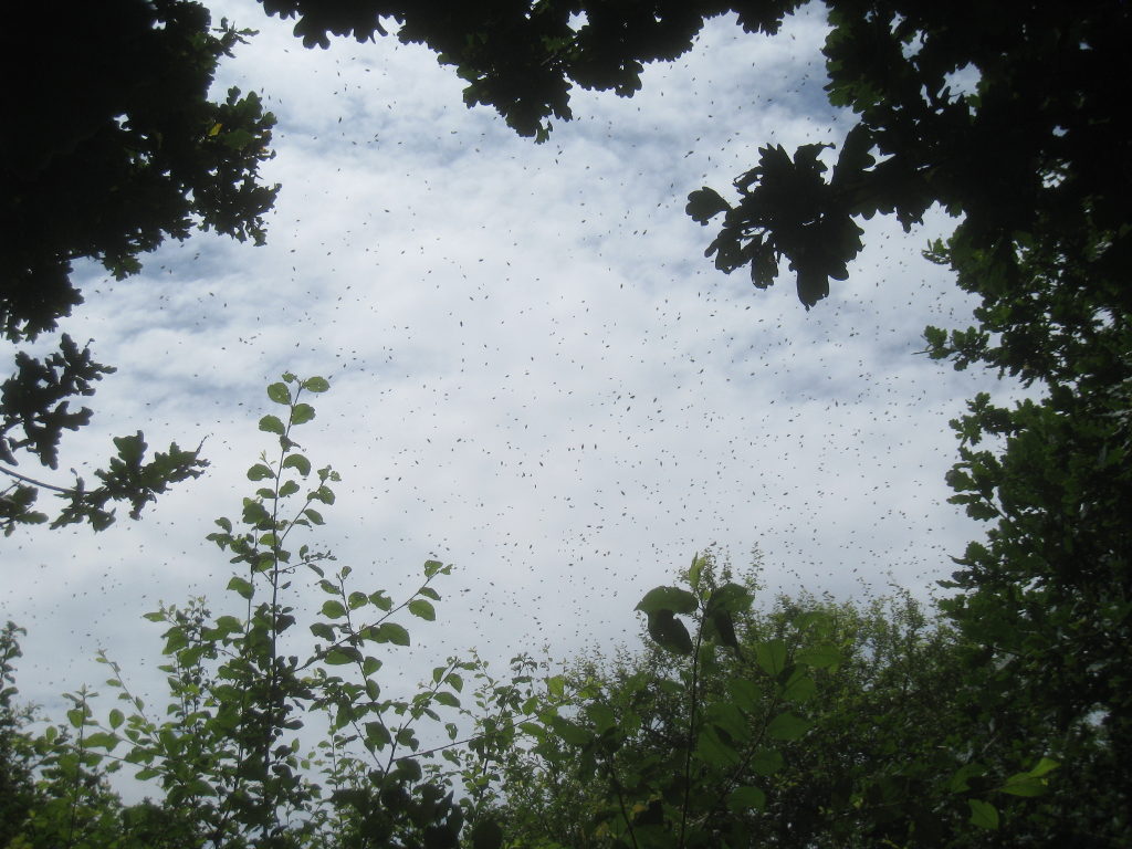 Au moment même où l'essaim capricieux revient sous la ruche S2 (voir article précédent), un autre essai sort de ma ruche P2 :