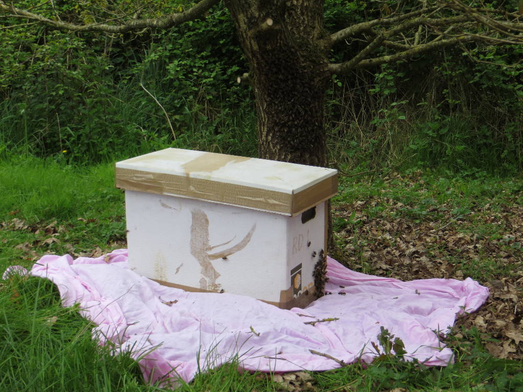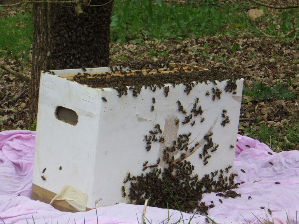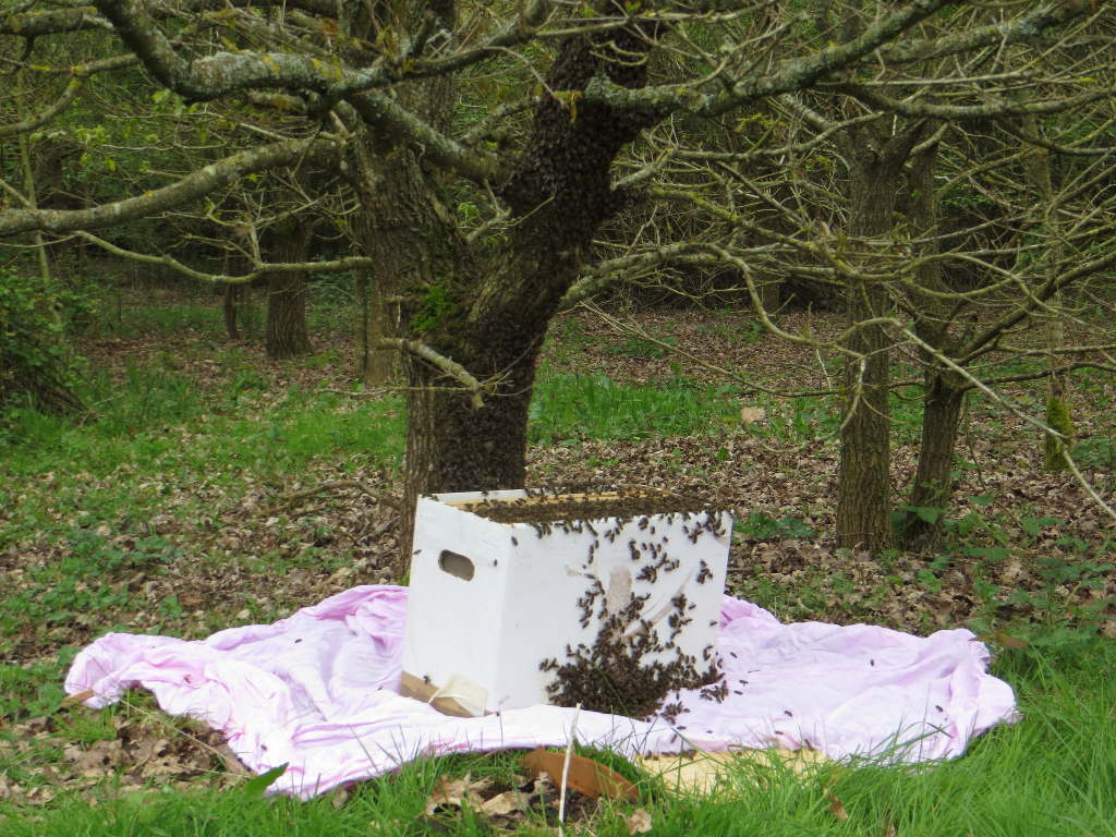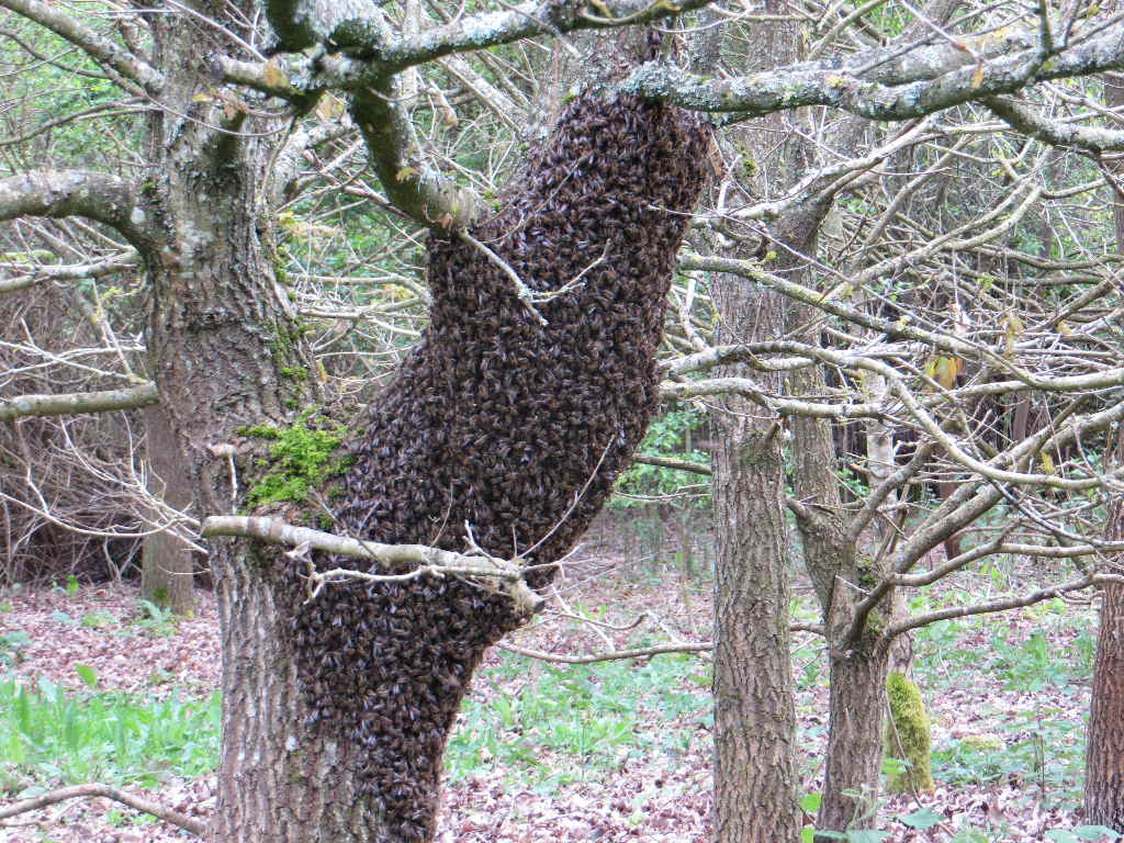 Nous commençons par un petit tour dans mes sentiers quand un fort bruissement nous interpelle. Pas de doute possible, c'est bien un essaim que nous voyons finir de décoller d'une ruche, puis se poser sur le tronc d'un chêne, près du sol.