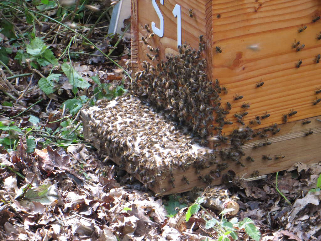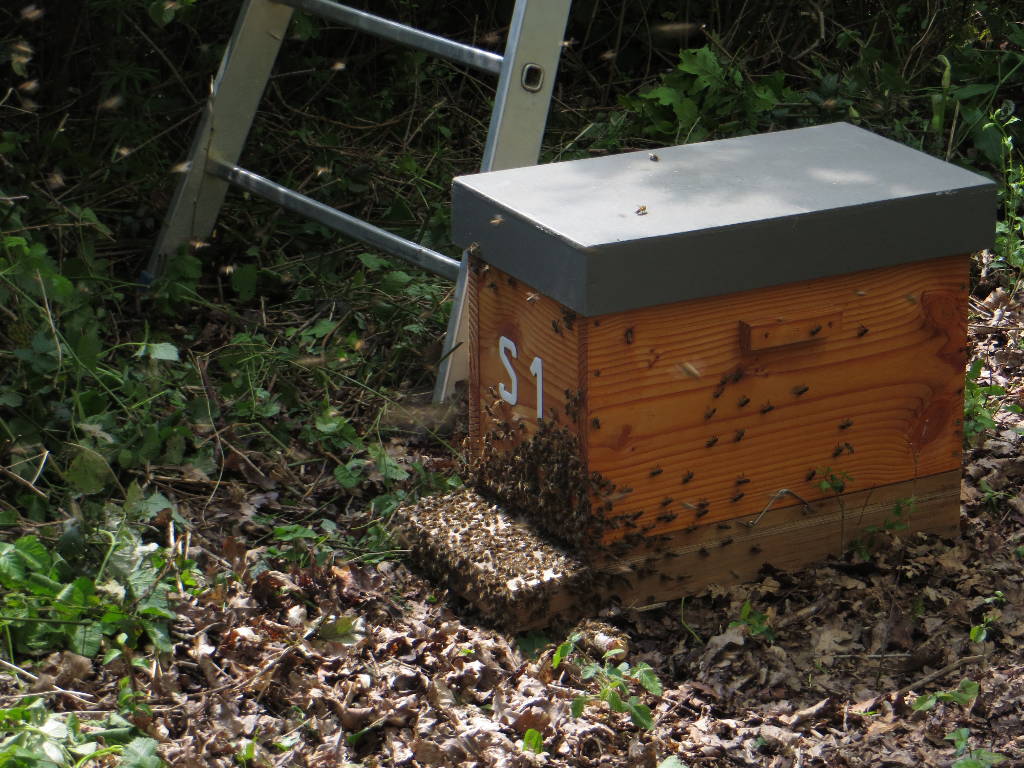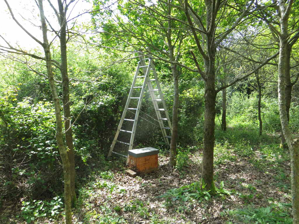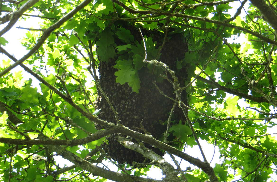 2014/04/30 : Essaim (3)Mis à jour : 13 février 2016 | Imprimer | Affichages : 1872Ce mercredi à 13h30, en visite au rucher, j'aperçois un essaim sur un chêne : Nous le récupérons sans soucis, c'est un très bel essaim : Note : L'essaim sort de la P2, la ruchette part chez Stephane. Précédent Suivant
