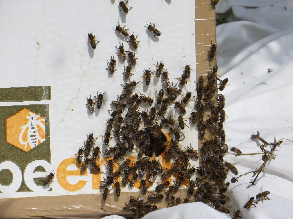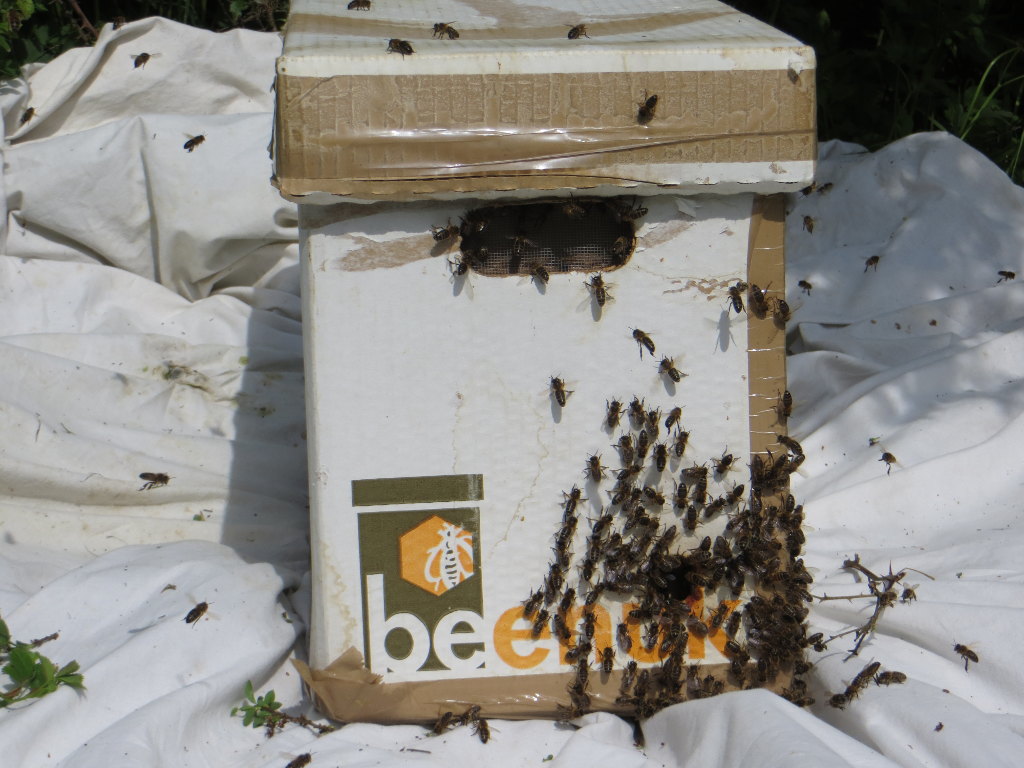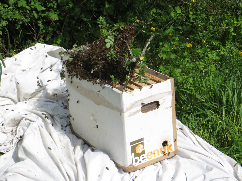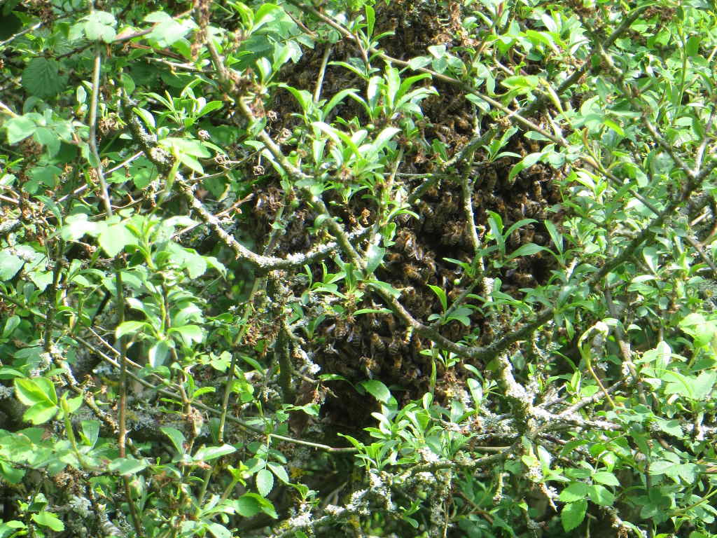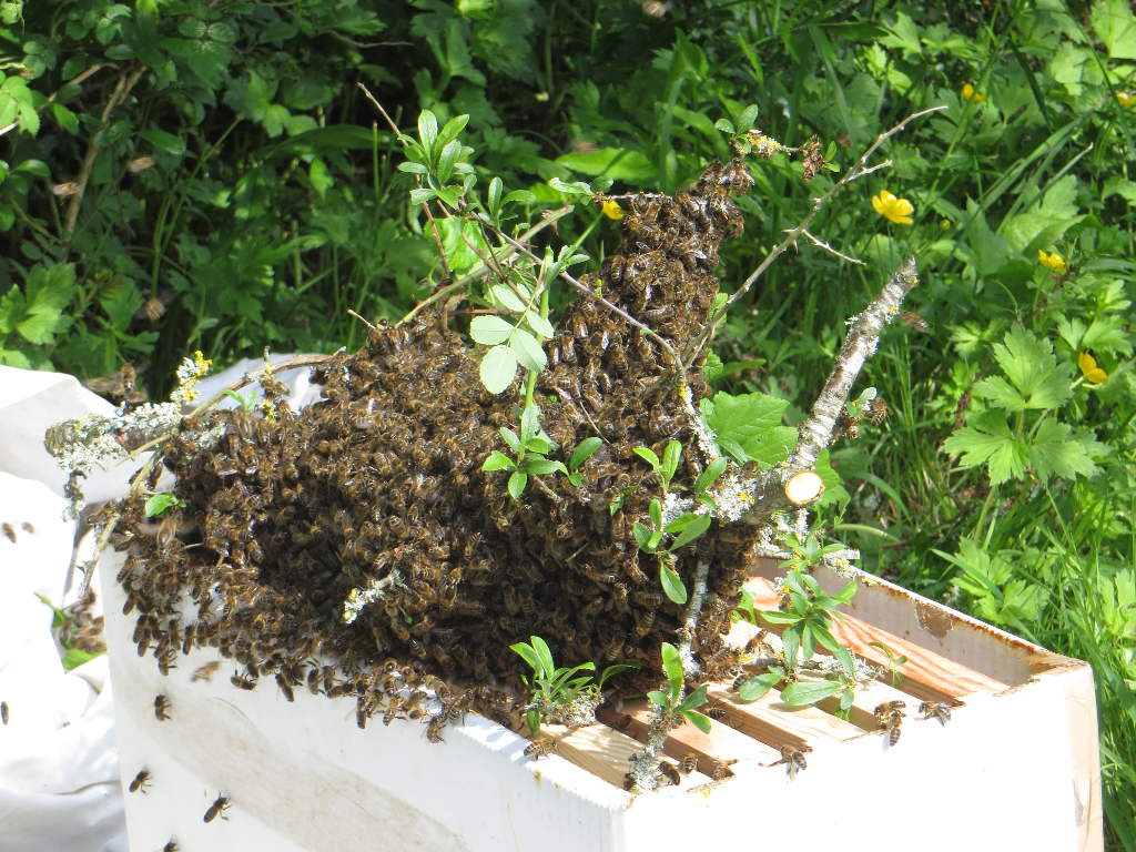 2014/05/04 : Essaim (8)Mis à jour : 13 février 2016 | Imprimer | Affichages : 1845Dimanche en fin de matinée, un nouvel essaim (S1) au rucher : Accessible, il est rapidement récupéré : Note : L'essaim sort de la S1 (2ème), j'avance 5 cadres, la ruchette est pour Stéphane (LC). Précédent Suivant