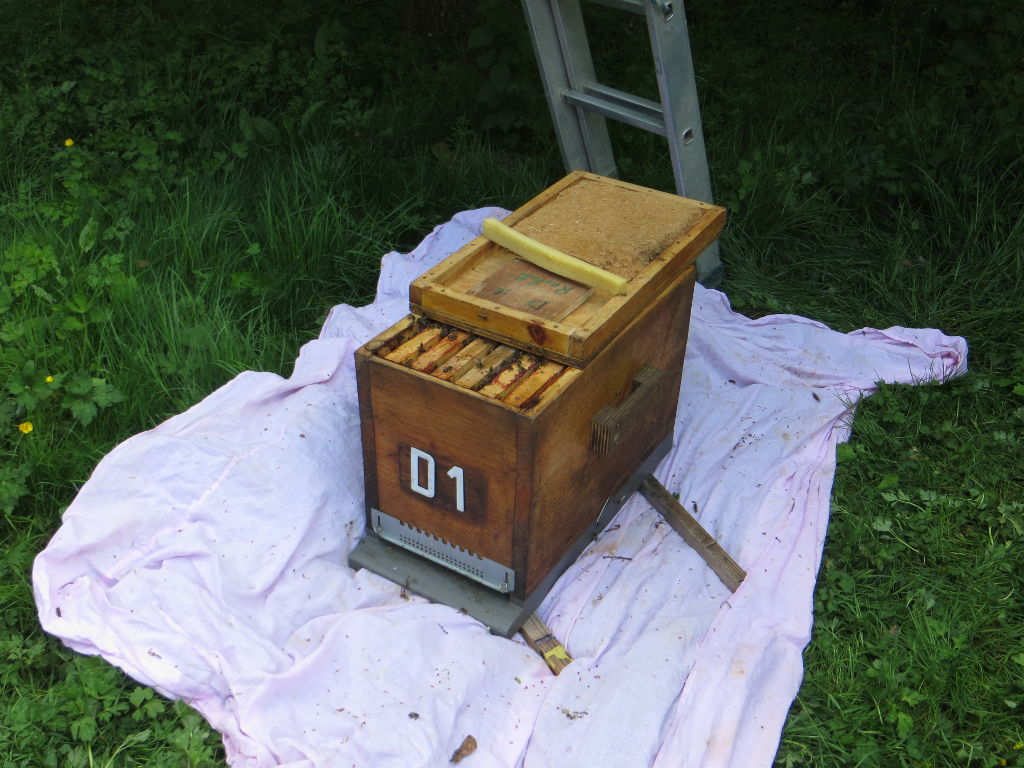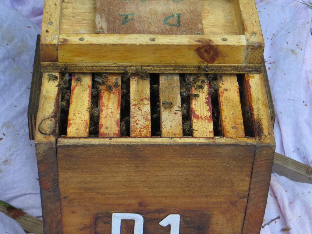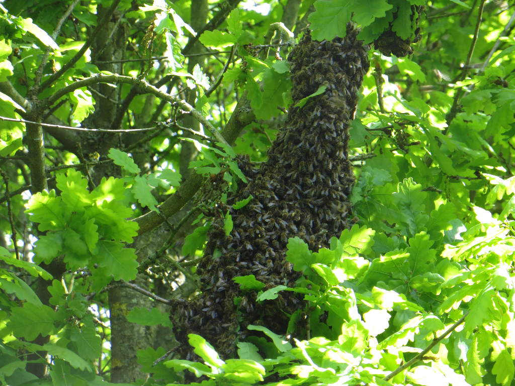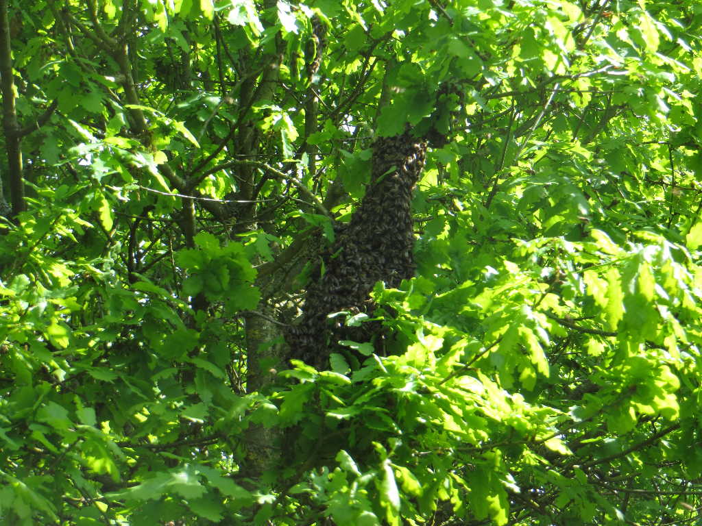 2015/04/27 : Essaim (3)Mis à jour : 1 novembre 2015 | Imprimer | Affichages : 1721 Chez moi, en début d'après-midi dans un chêne ... En détails : Cet essaim d'abeilles locales sort apparemment de ma ruche rouge. Il est placé dans la ruchette D1 (6 cadres à Dany), et je la transporte ce soir à LC. Précédent Suivant