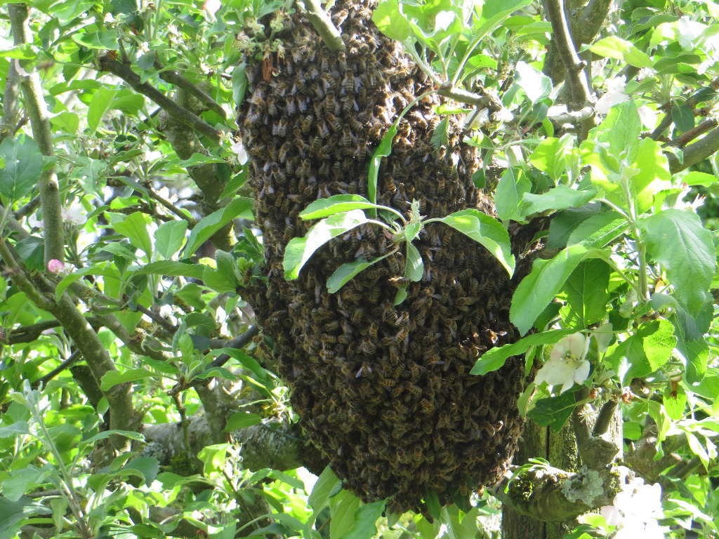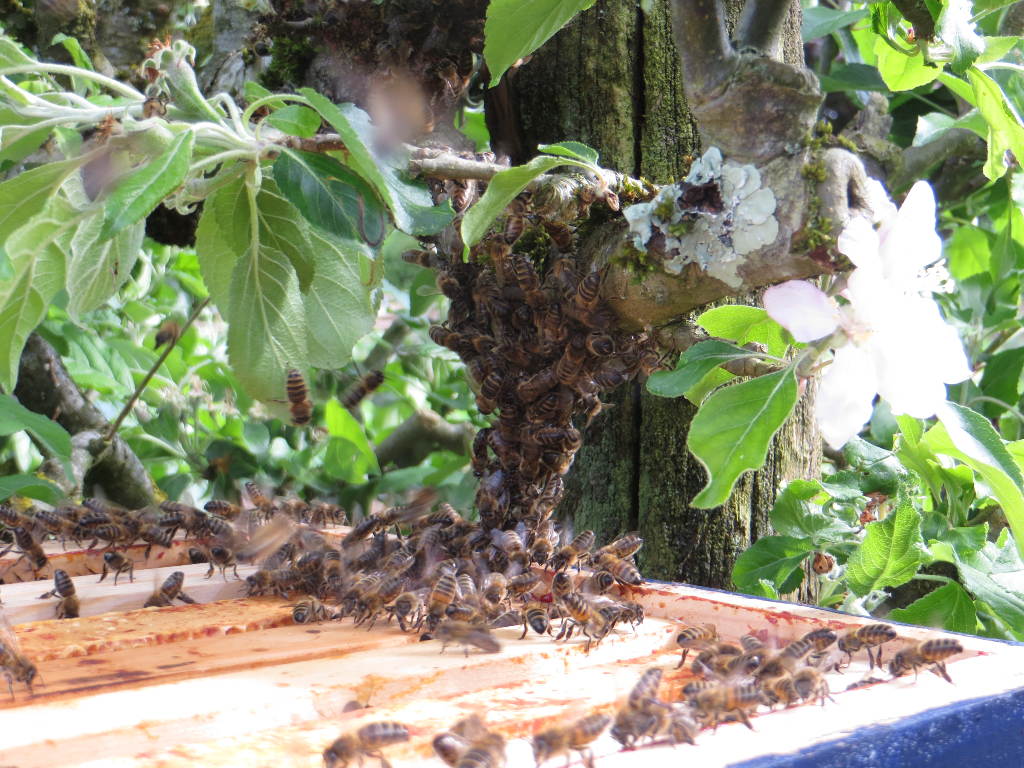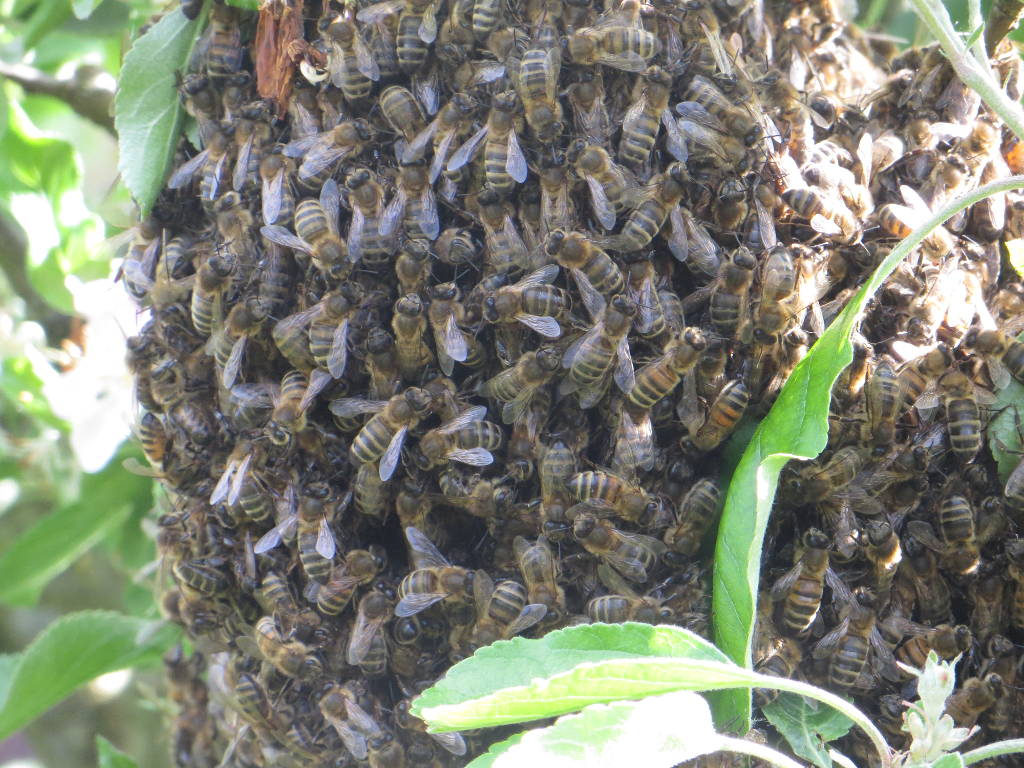 Il s'agit de l'essaim d'il y a deux jours, qu'on croyait avoir raté, mais qui s'était réfugié sous sa ruche d'origine. Il est reparti aujourd'hui pour se poser à quelques mètres.