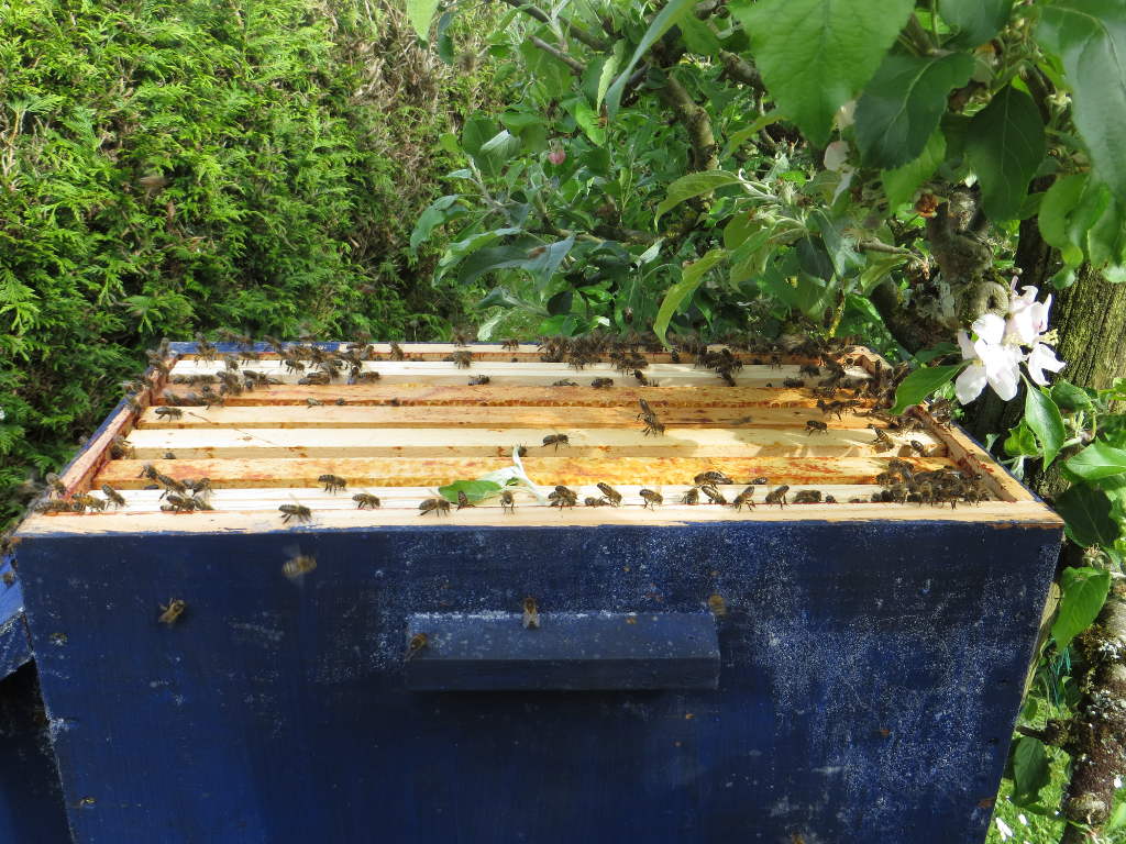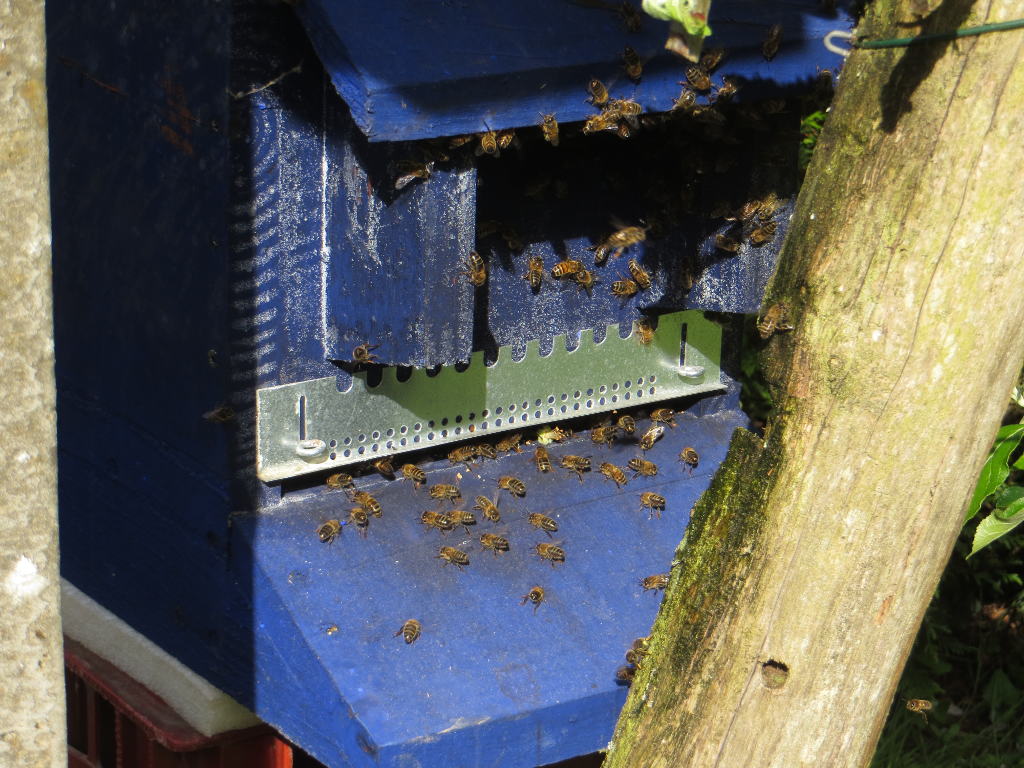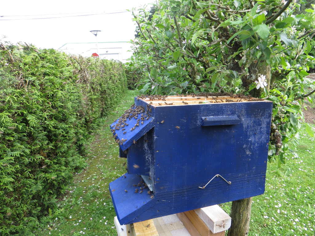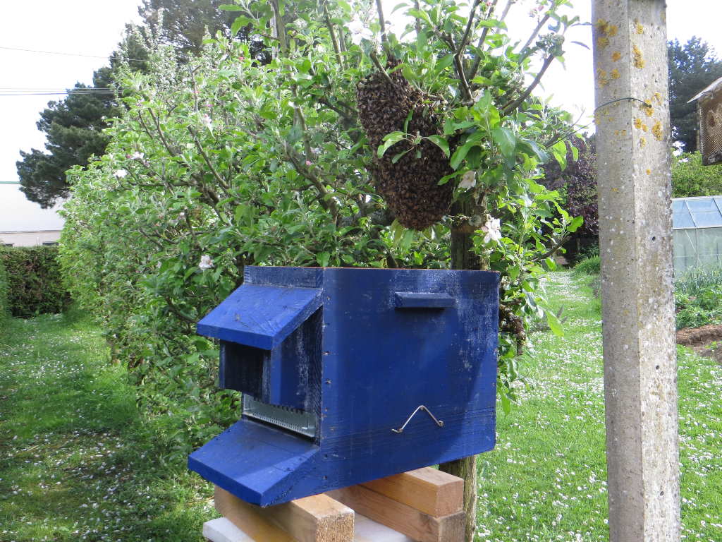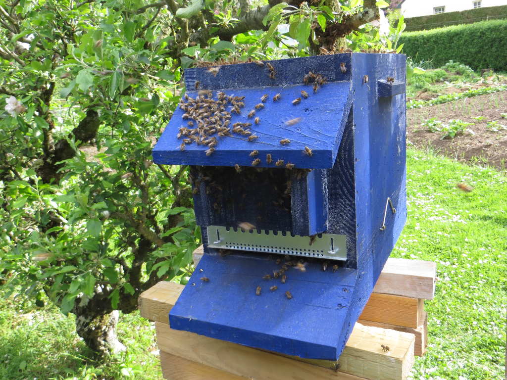 Il est placé dans ma ruchette en bois (6 cadres), que je récupère le soir même.