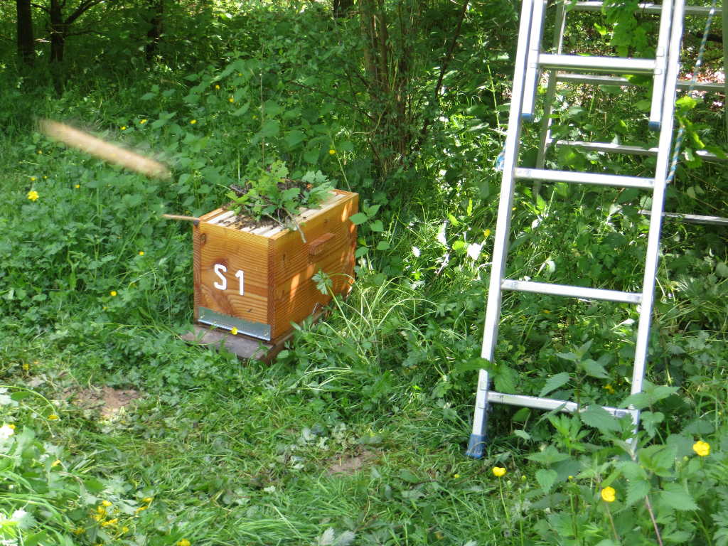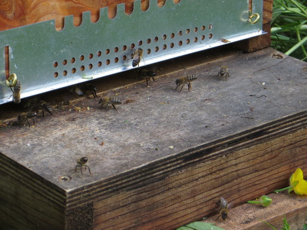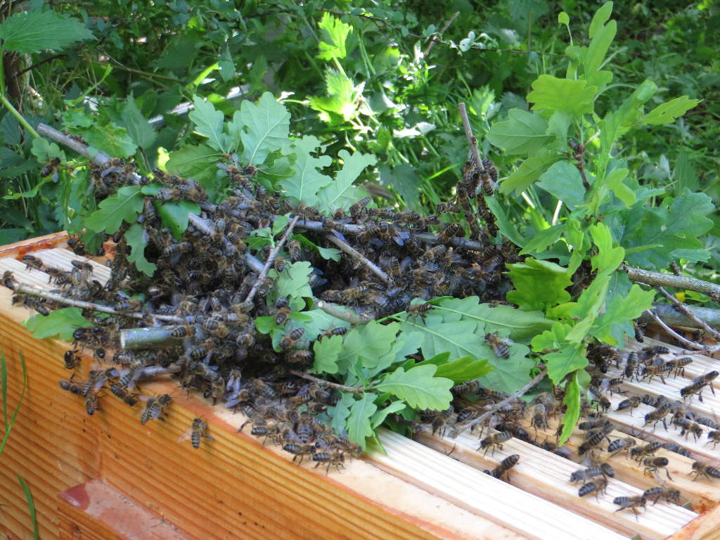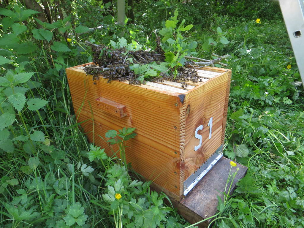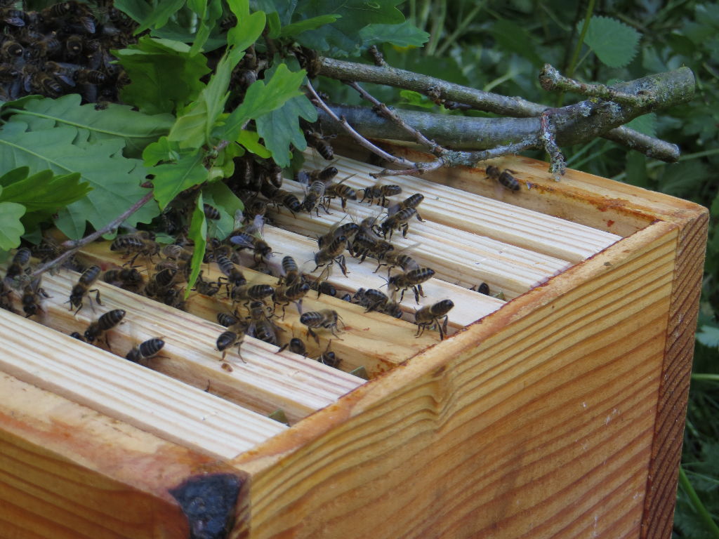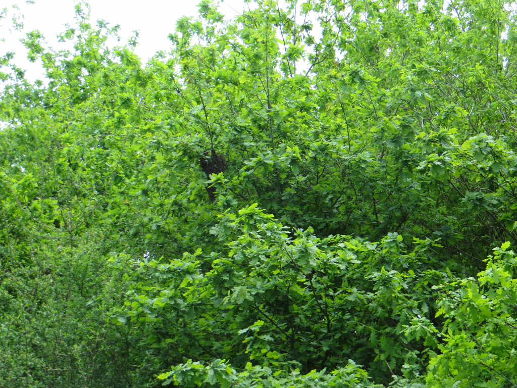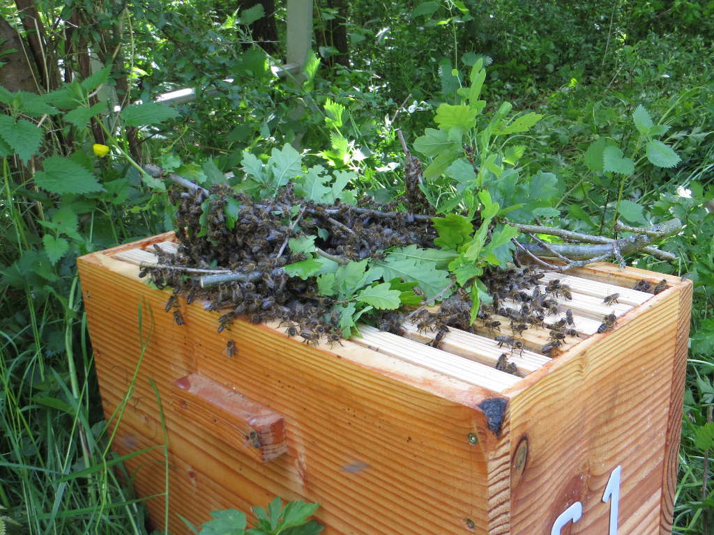 2015/05/03 : Essaim (7)Mis à jour : 1 novembre 2015 | Imprimer | Affichages : 1971 Chez moi, en ce début d'après-midi ... En détails : Il sort apparemment de la ruche rouge, dont c'est le secont essaim (essaim secondaire). Il est placé dans une ruchette en bois à Stéphane (6 de mes cadres), qu'il récupère le soir même.