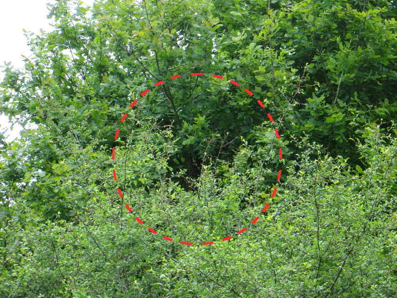 Je regarde un peu partout, sans voir d'essaim aux endroits habituels. En quittant le rucher je me retourne une dernière fois, et là, je l'apperçois, très peu visible à ma décharge.