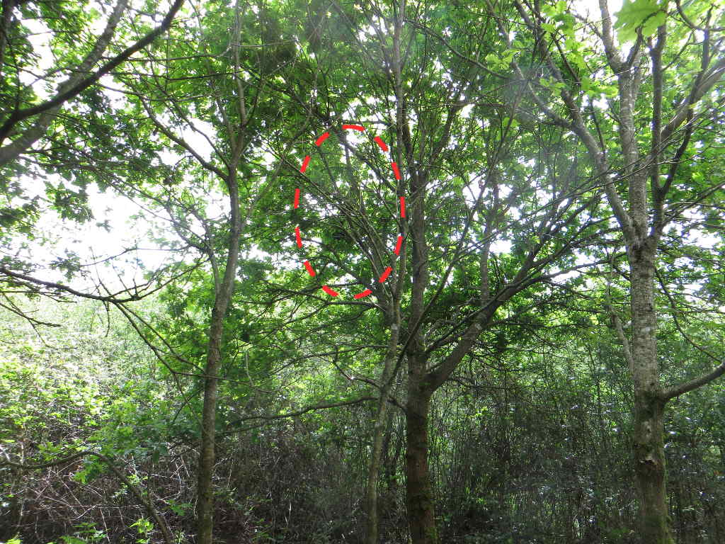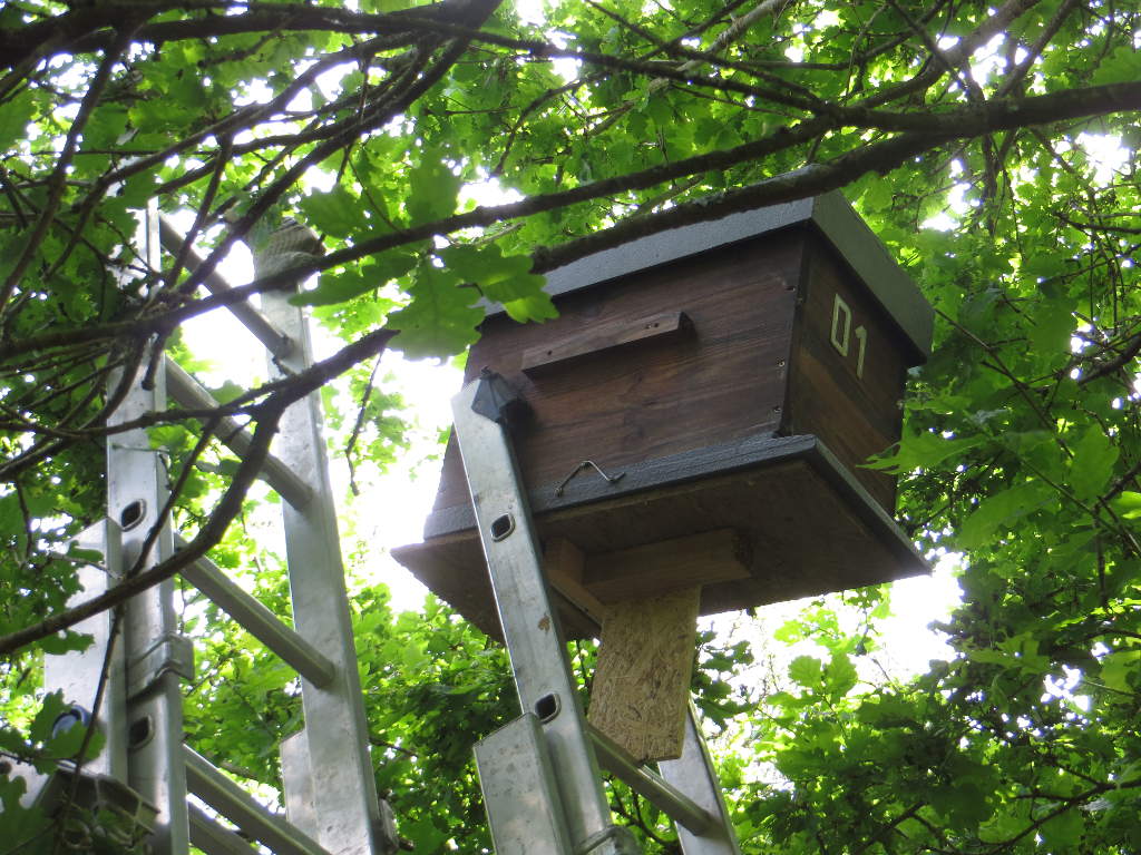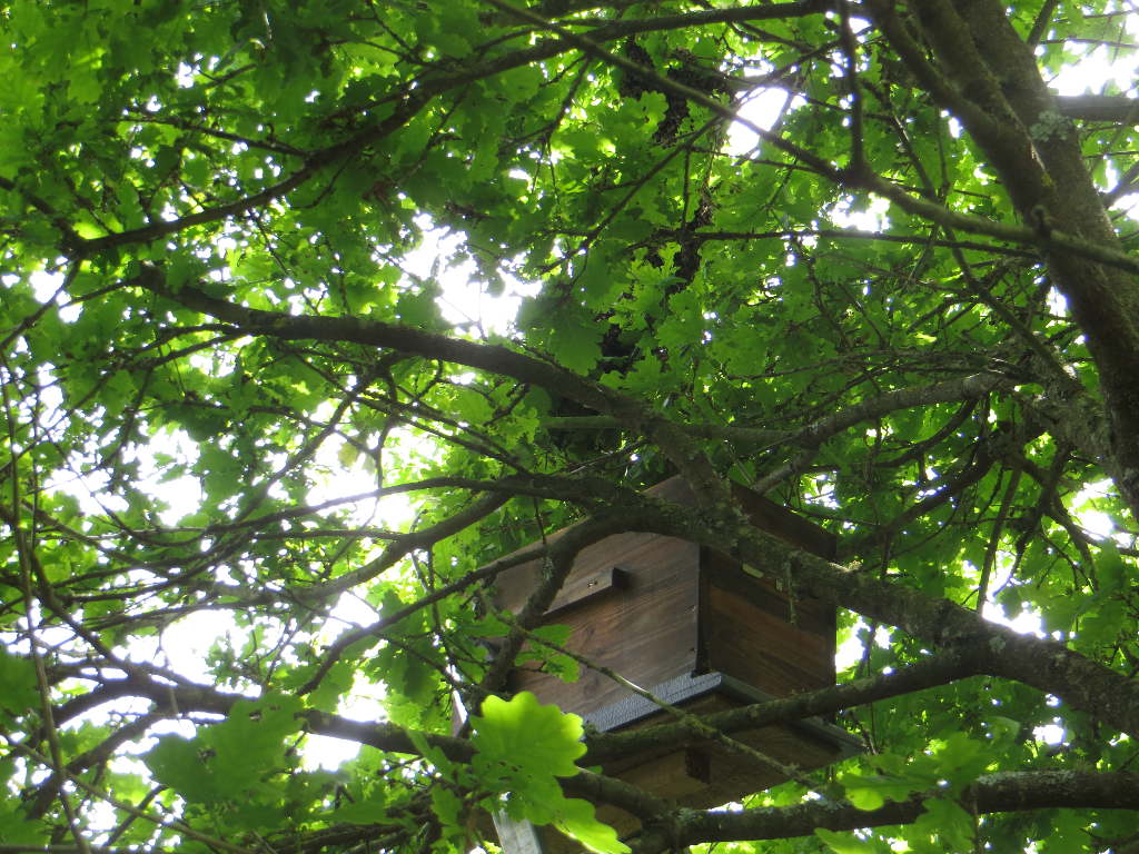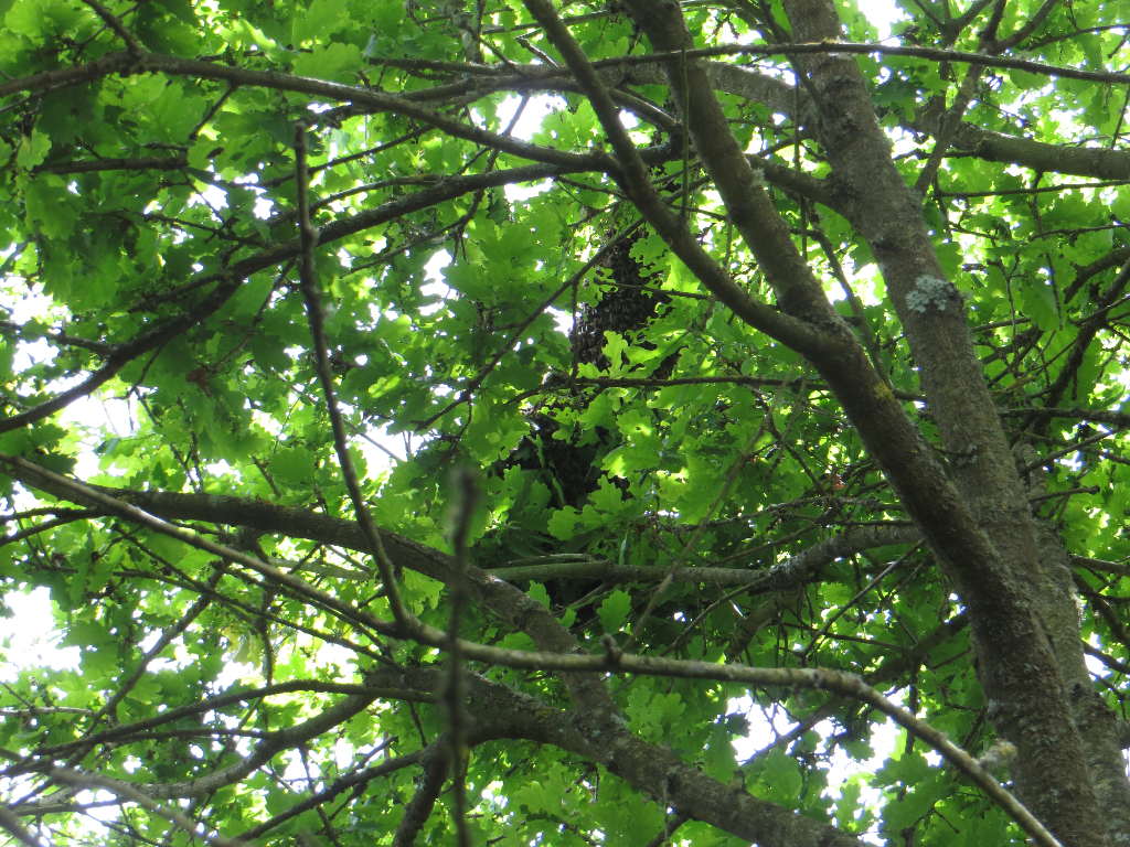 Assez haut dans les branchages, nous allons improviser (chose prévue depuis longtemps mais jamais réalisée) un support pour ruchette, à bloquer dans mes échelles, et la récupération va se passer tout en douceur :