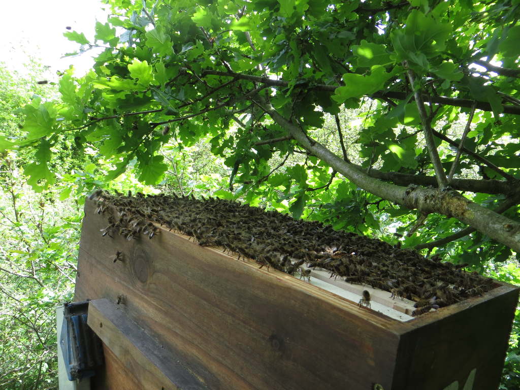 Je me dis que je rêve. À 14h, je retourne faire mon tour au rucher, et là, pas de doute : une des ruches est en train d'essaimer, soit de commencer, soit de terminer :