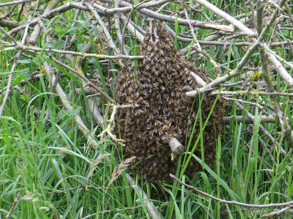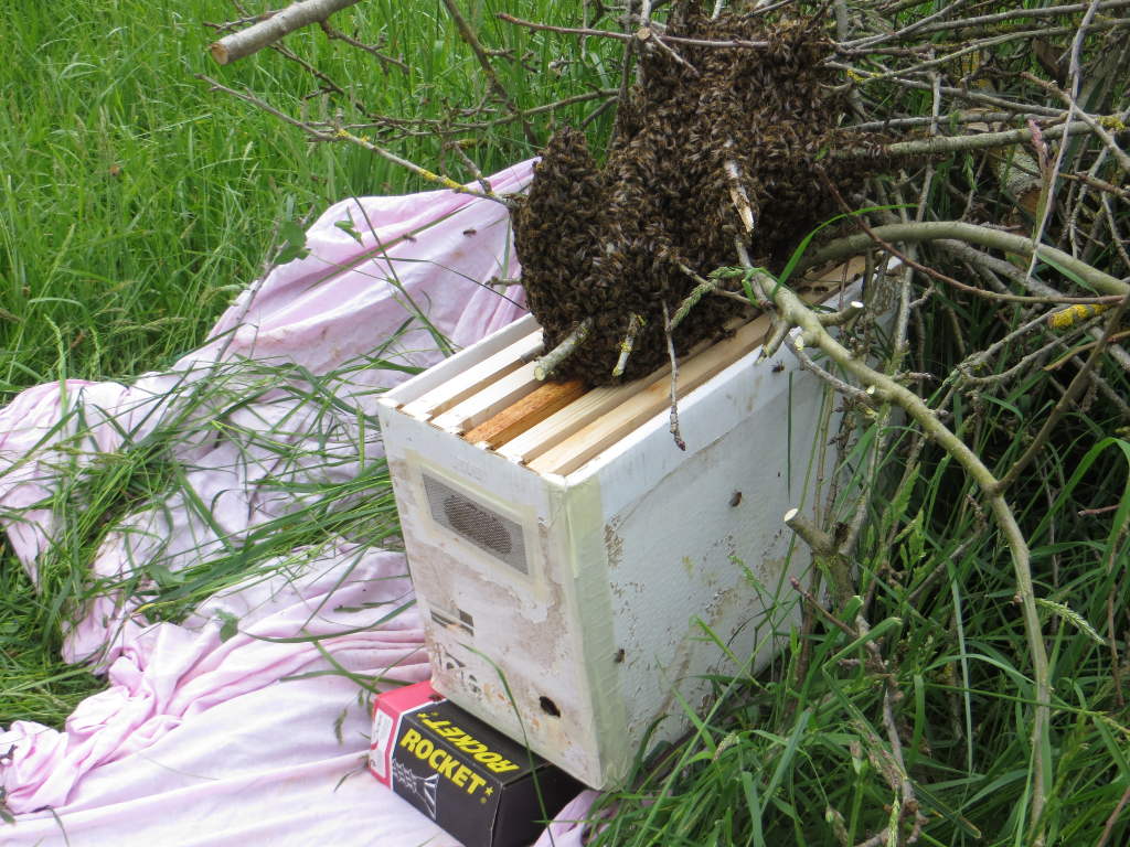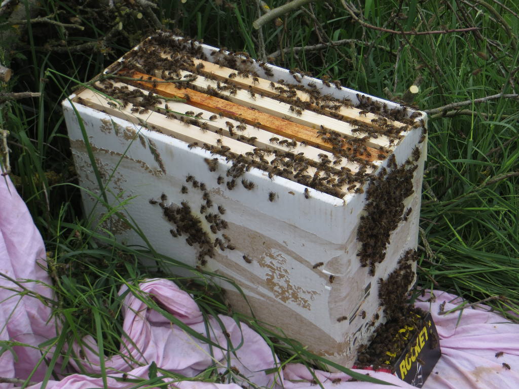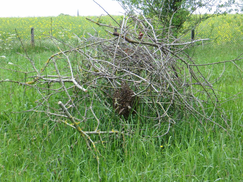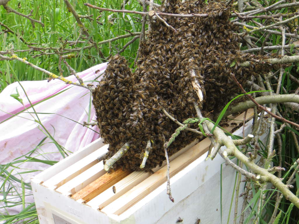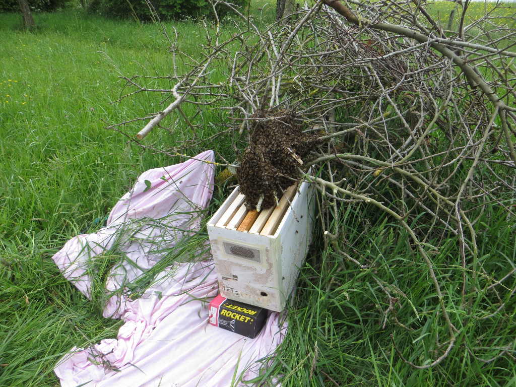2015/05/07 : Essaim (10)Mis à jour : 1 novembre 2015 | Imprimer | Affichages : 1660 Un essaim dans un de nos sites éloignés (MD) ... En détail : Il sort d'une des ruches à Dany. Il est placé dans une ruchette en carton à Dany, qu'il récupère immédiatement.