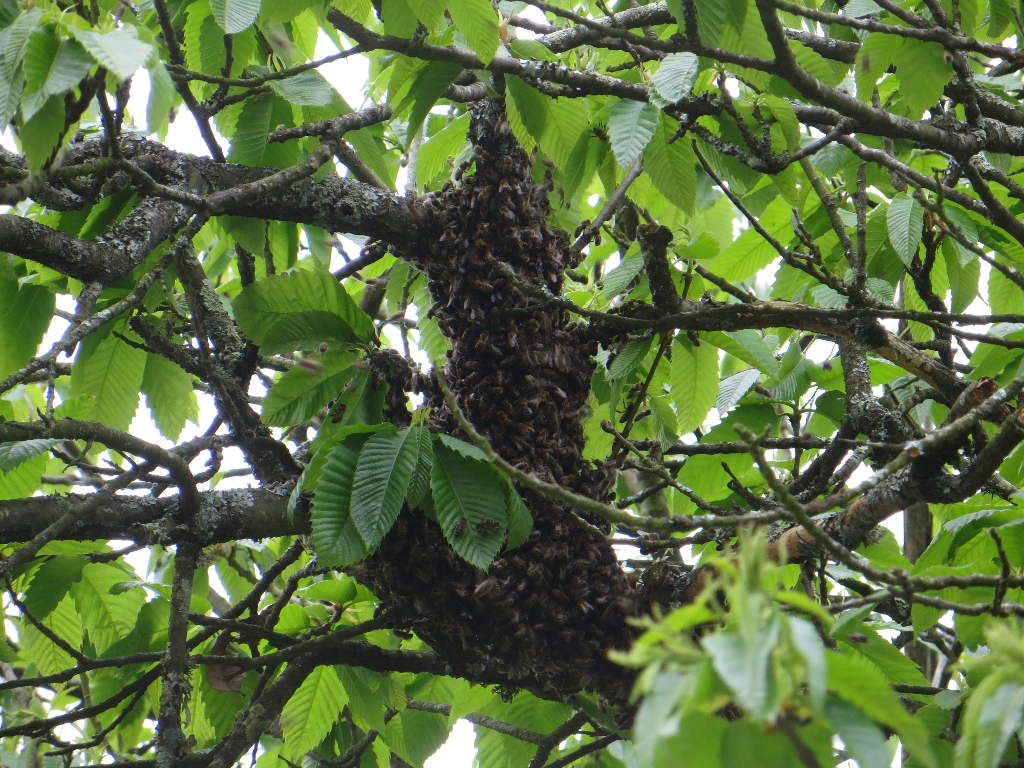2015/05/07 : Essaim (11)Mis à jour : 1 novembre 2015 | Imprimer | Affichages : 2513 En début d'après-midi chez Dany, un essai se pose sur un châtaignier ... Quand on arrive, il est en train de s'envoler : Finalement, il retourne sous la ruche qu'il avait quitté: À surveiller demain ... Finalement, il nous a fait faux bond : raté !