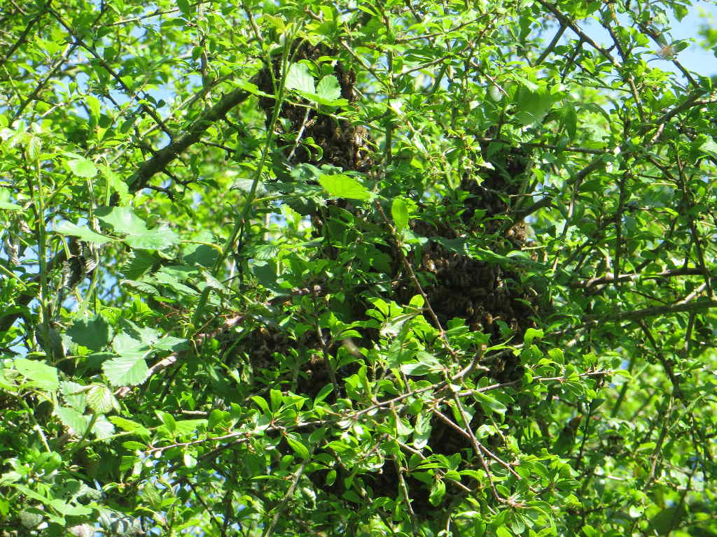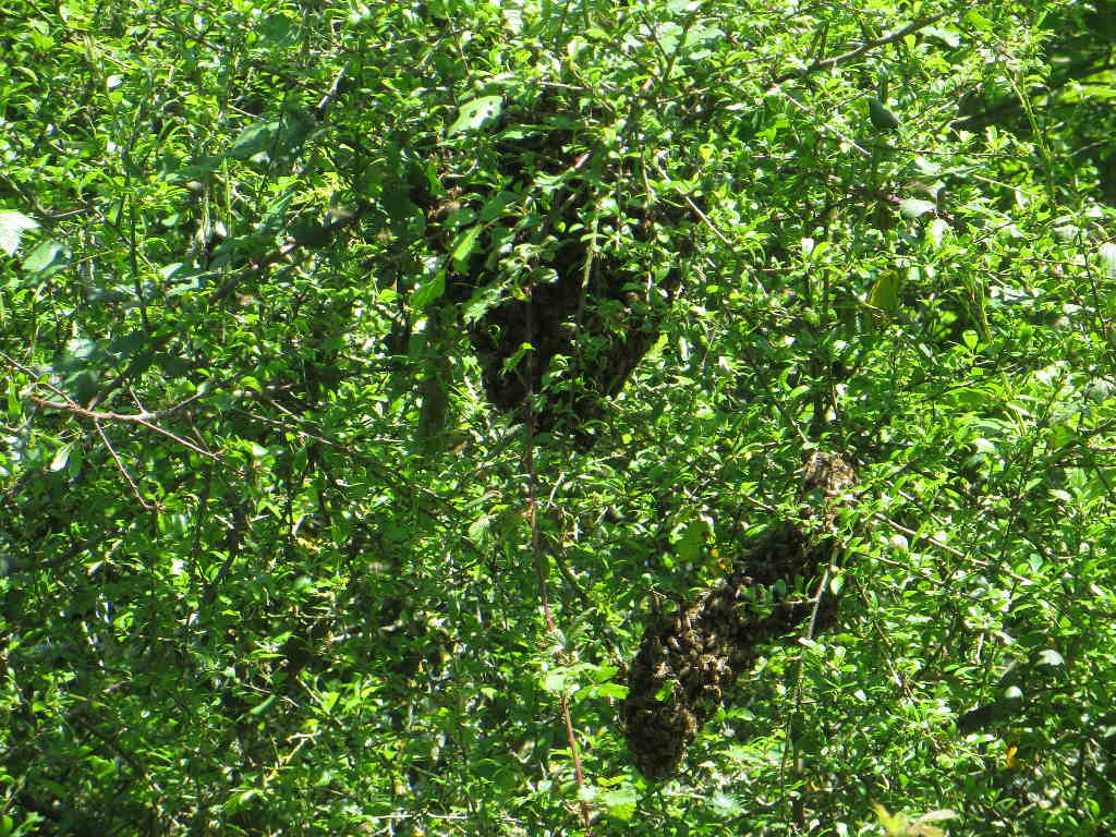 Bien lui en a pris, car à la pause de midi, je vois un nouvel essaim chez moi. Si à midi il se compose de deux grappes, en fin de journée elles se sont réunies :