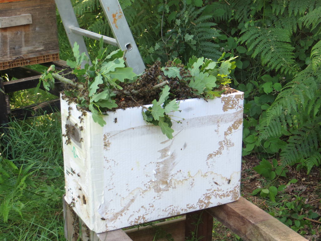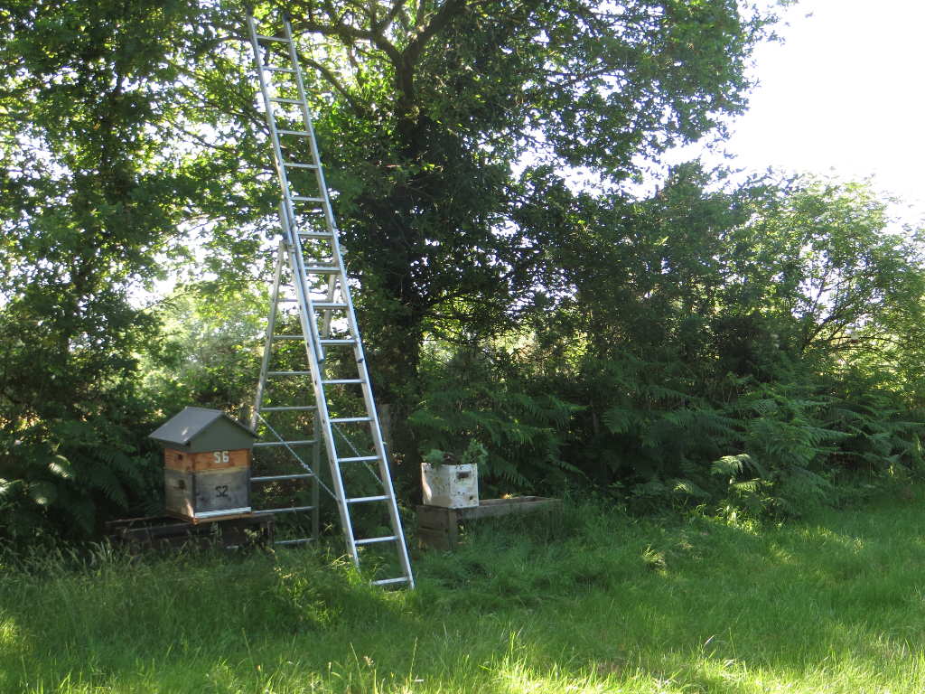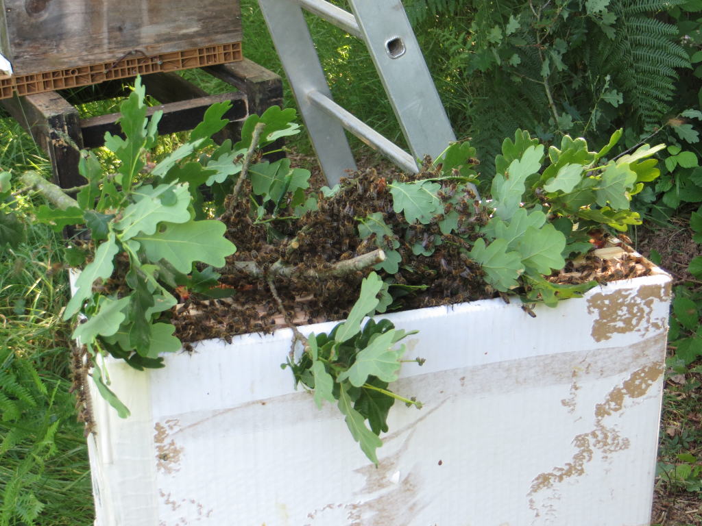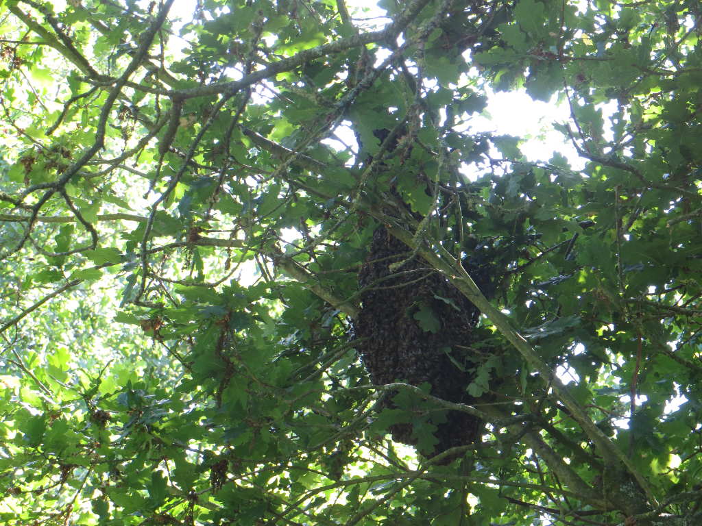 2015/06/03 : Essaim (17)Mis à jour : 1 novembre 2015 | Imprimer | Affichages : 1865 En début d'après-midi, un essaim sur notre site campagnard (LC) ... C'est un bel essaim, dans un chêne. Il faut sortir l'échelle : Il est placé dans la ruchette en carton de Dany, qui l'emmène dans la foulée. Précédent Suivant