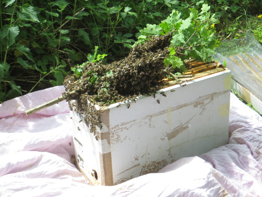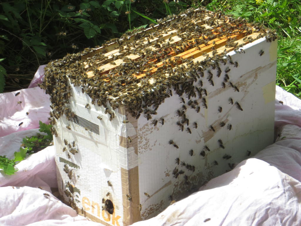Il est placé dans ma ruchette en carton, puis déplacé à LC, où nous le transvaserons dans une ruchette en bois à Dany (3 cadres à moi, 3 cadres à Dany).