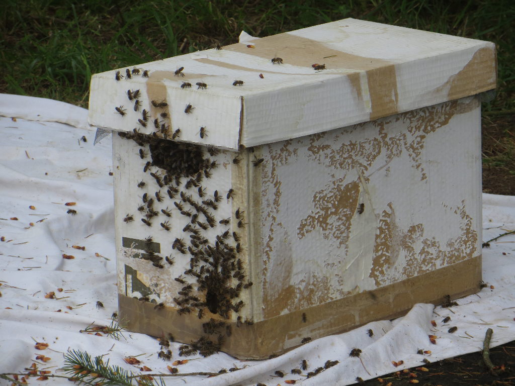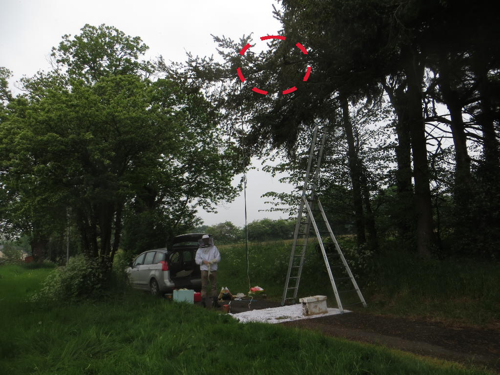 2016/05/13 : Essaim (10)Mis à jour : 13 mai 2016 | Imprimer | Affichages : 1628 En périphérie urbaine, en fin d'après-midi ... En détails : Nous sommes appellés pour un essaim installé depuis plusieurs jours sur une branche d'arbre. Il est placé dans la ruchette en carton à Stéphane, puis déplacé chez moi. Précédent Suivant