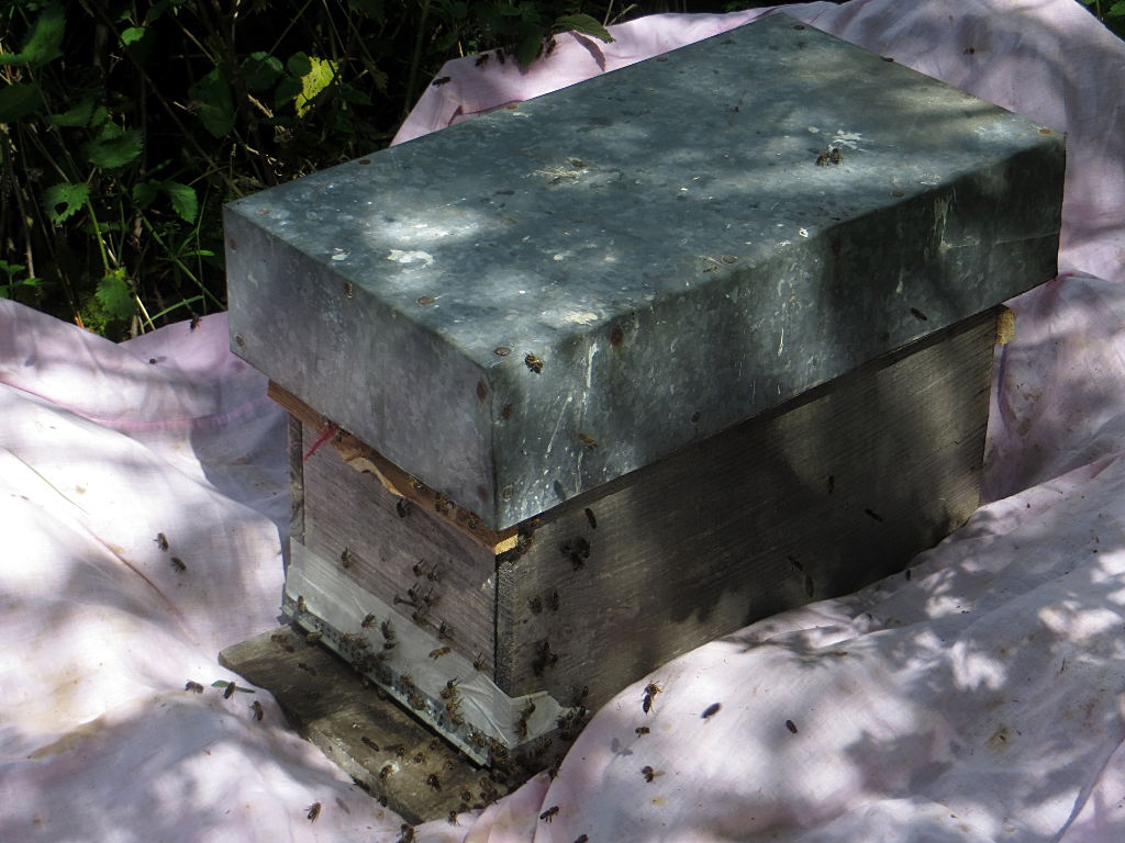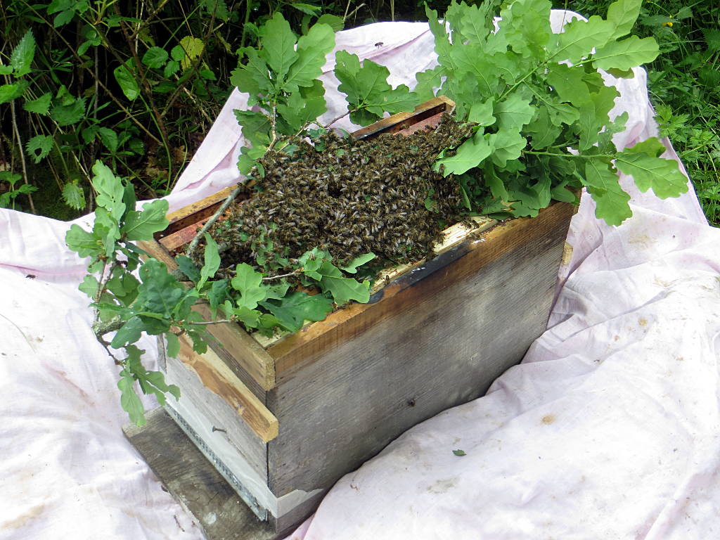 2016/05/23 : Essaim (16)Mis à jour : 25 mai 2016 | Imprimer | Affichages : 1595 Chez moi, en début d'après midi ... En détails : Il sort de ma ruche P4 (Bleue), dont ce serait le second essaim (essaim secondaire). Il est placé dans une ruchette en bois externe et sera livré à son propriétaire. Précédent Suivant