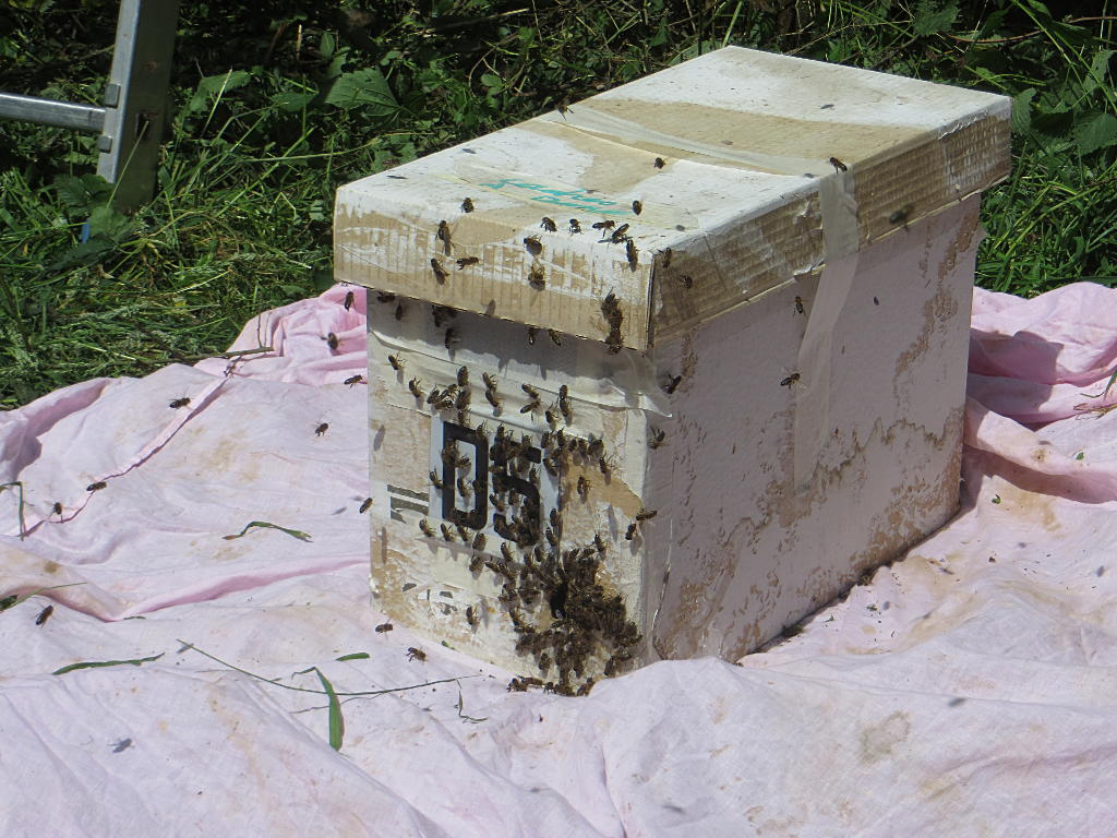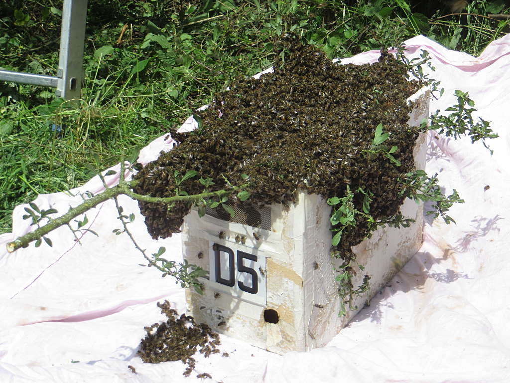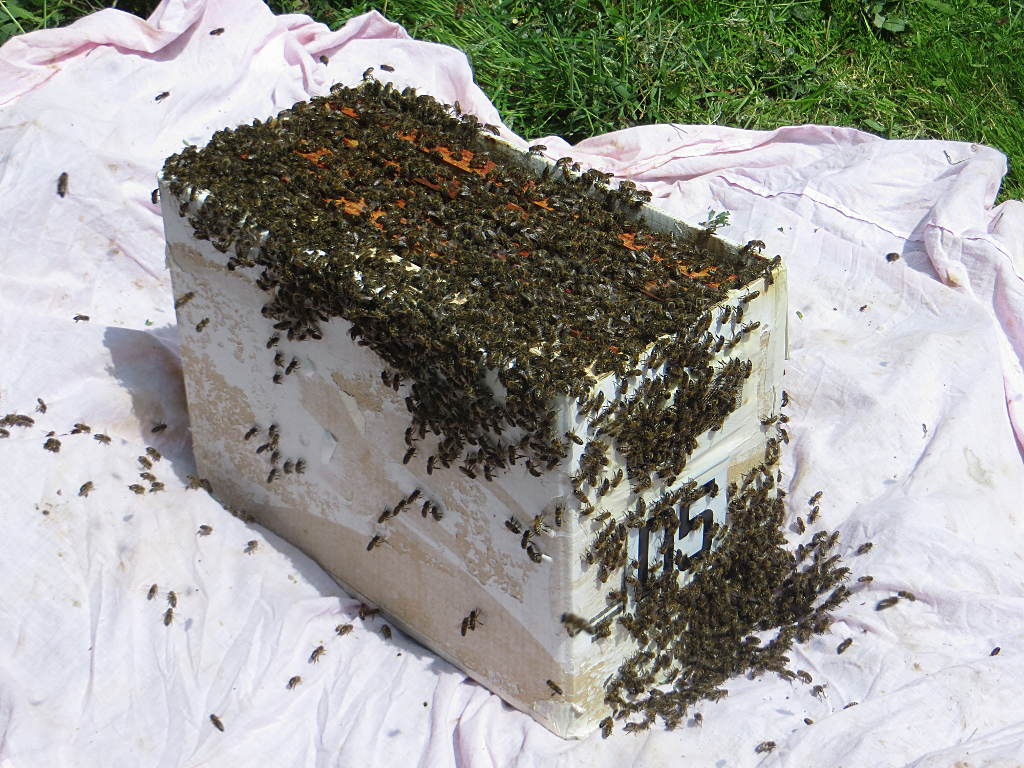 2016/06/07 : Essaim (20)Mis à jour : 8 juin 2016 | Imprimer | Affichages : 1633 Chez moi, en début d'après-midi ... En détails : Je ne sais pas de quelle ruche il sort, mais c'est au moins un essaim secondaire. Il est placé dans une ruchette en carton à Dany (avec ses cadres),et Dany l'emmène chez lui.