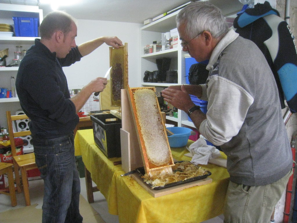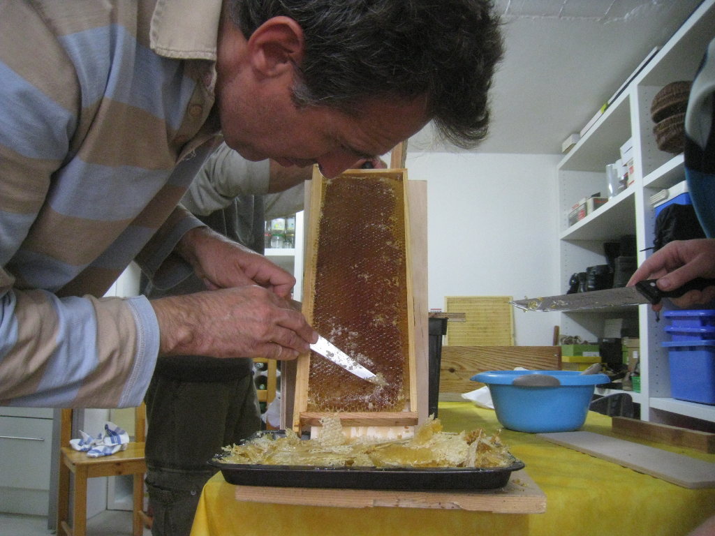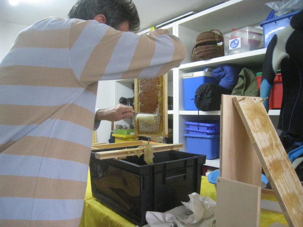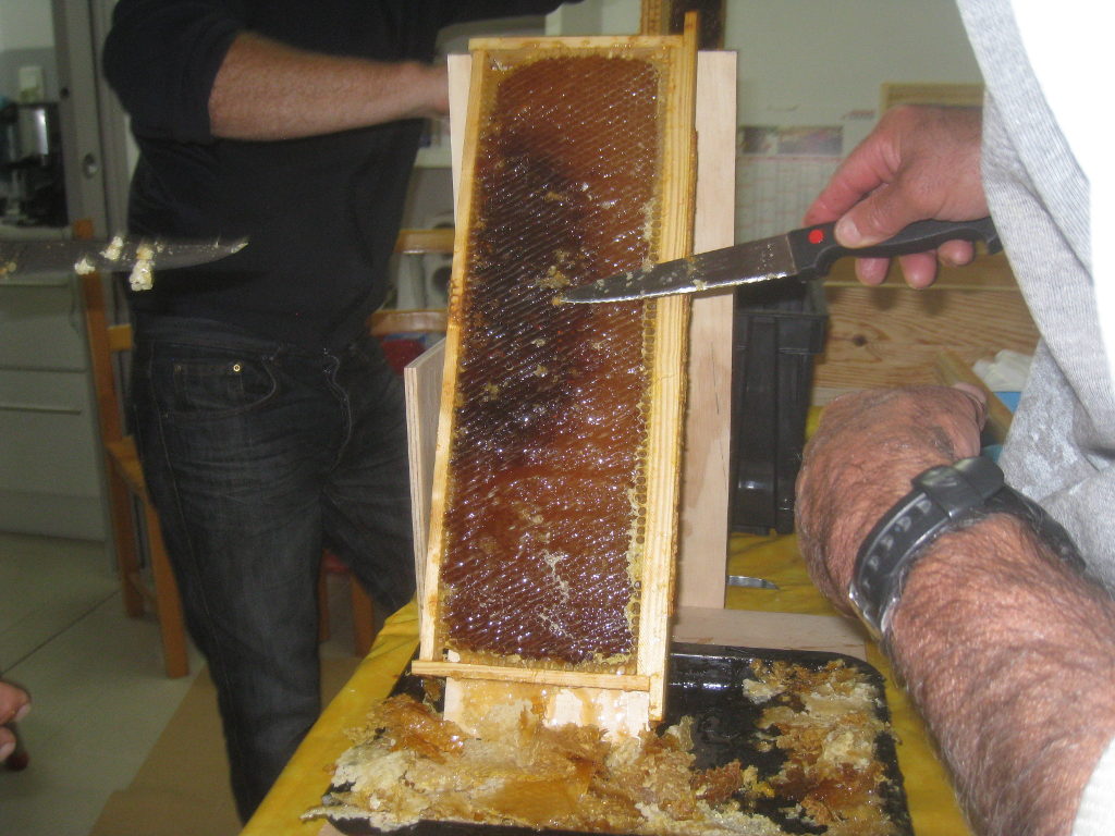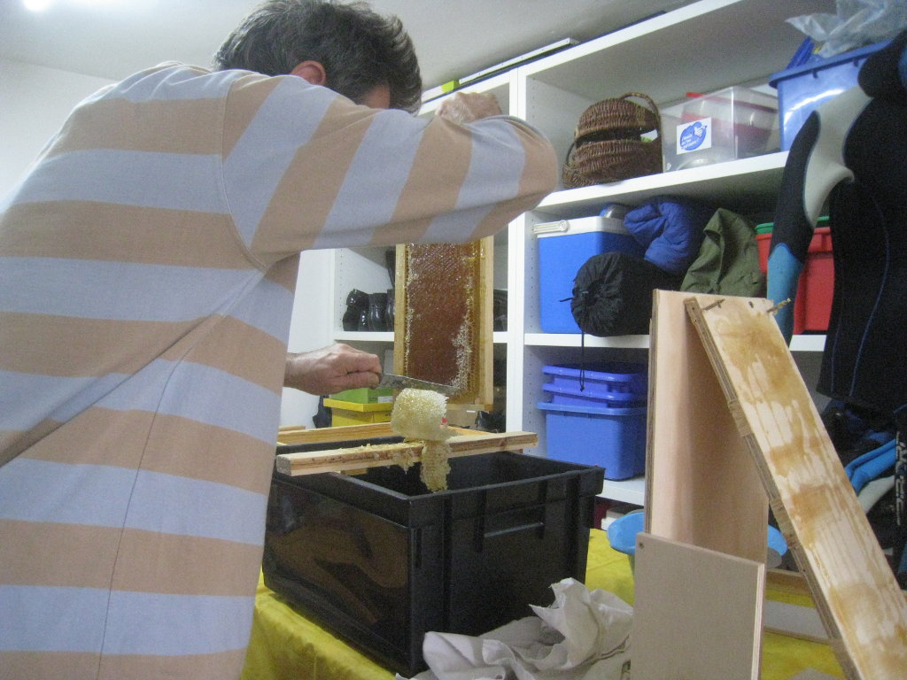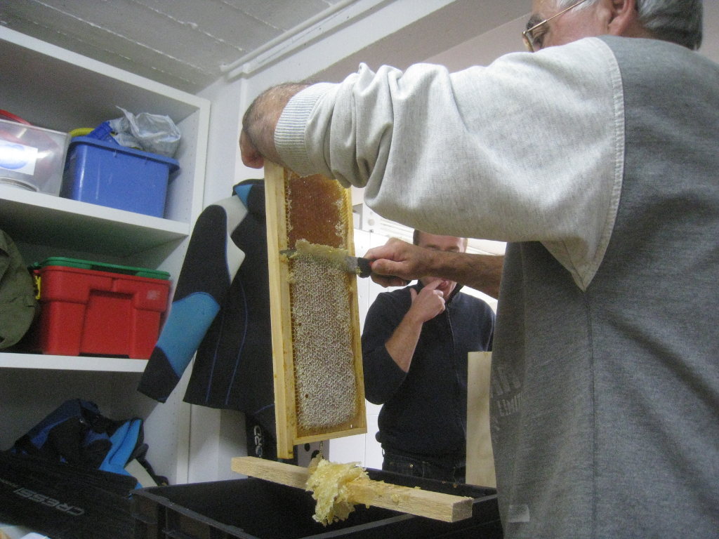 Cette étape consiste à retirer la fine couche de cire que les abeilles ont placé devant chaque alvéole pour protéger le miel.