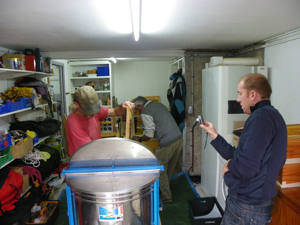 On nous a prêté un extracteur électrique d'une capacité de 20 cadres (un grand merci à Patrick P.), ce qui nous facilite énormément le travail :