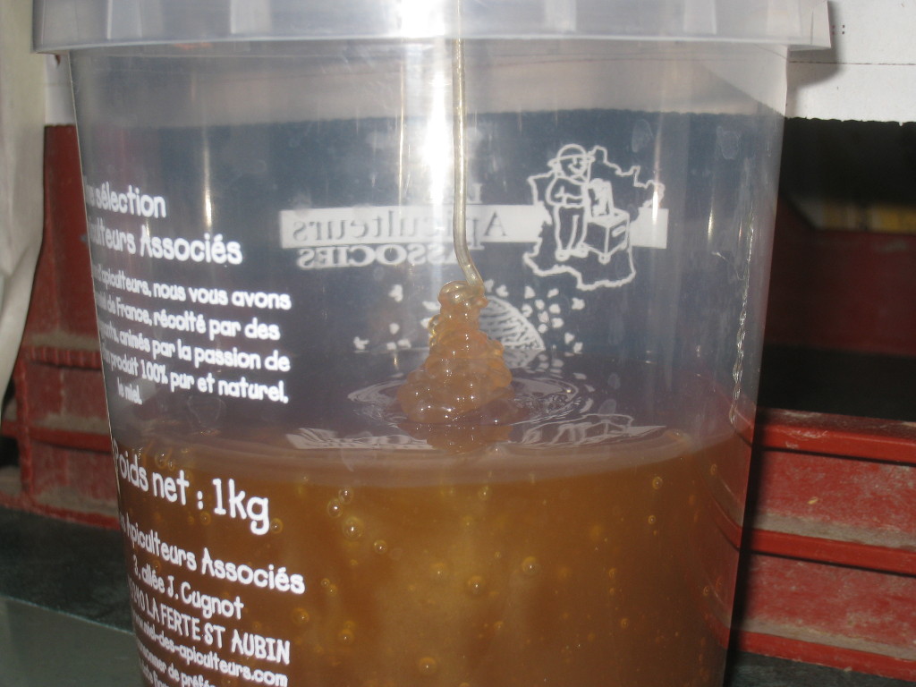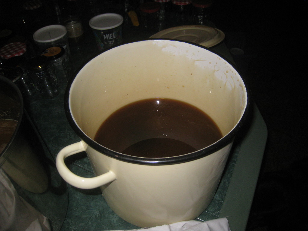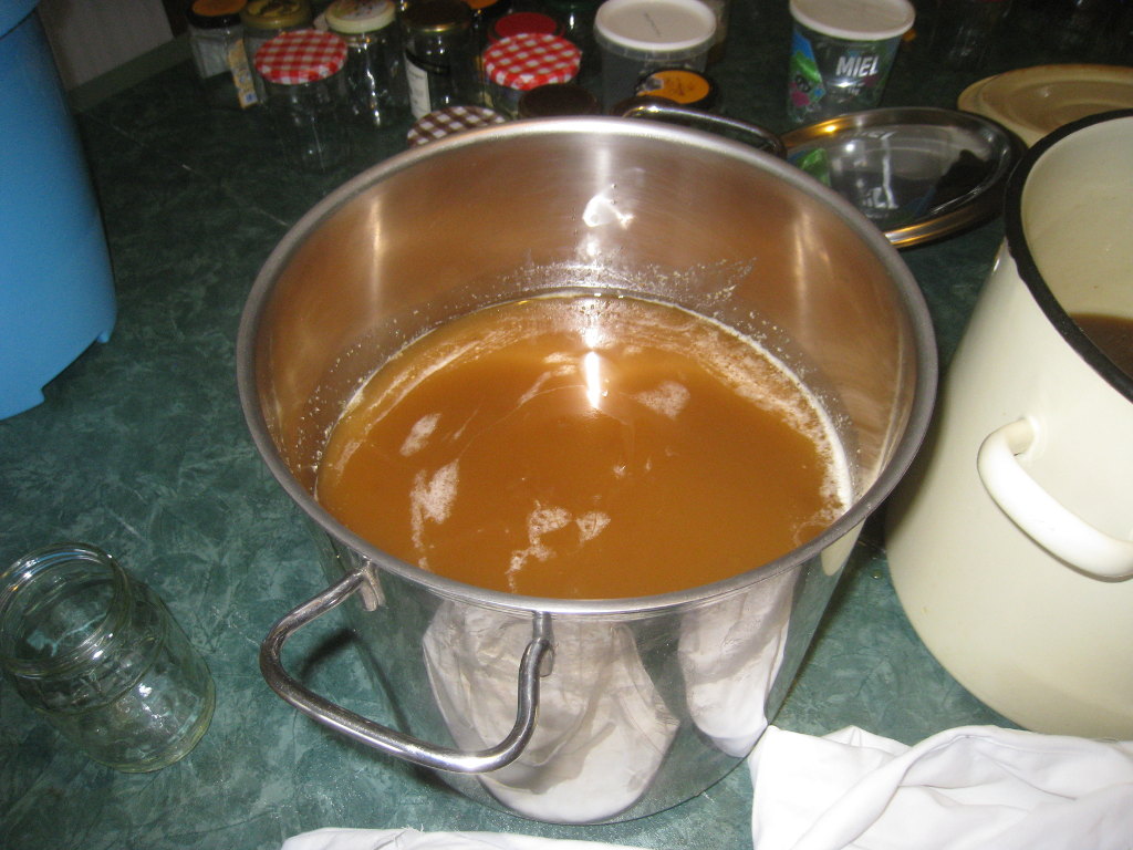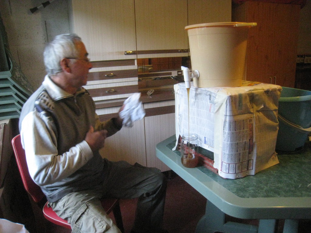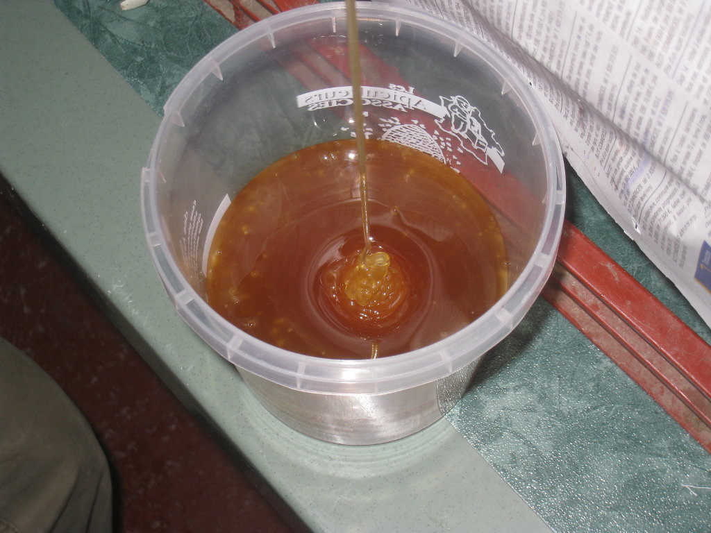 Sur la troisème photo, on remarque que le miel a une couleur différente : dans ce seau, le miel a été brassé durant la semaine pour le rendre plus crémeux :