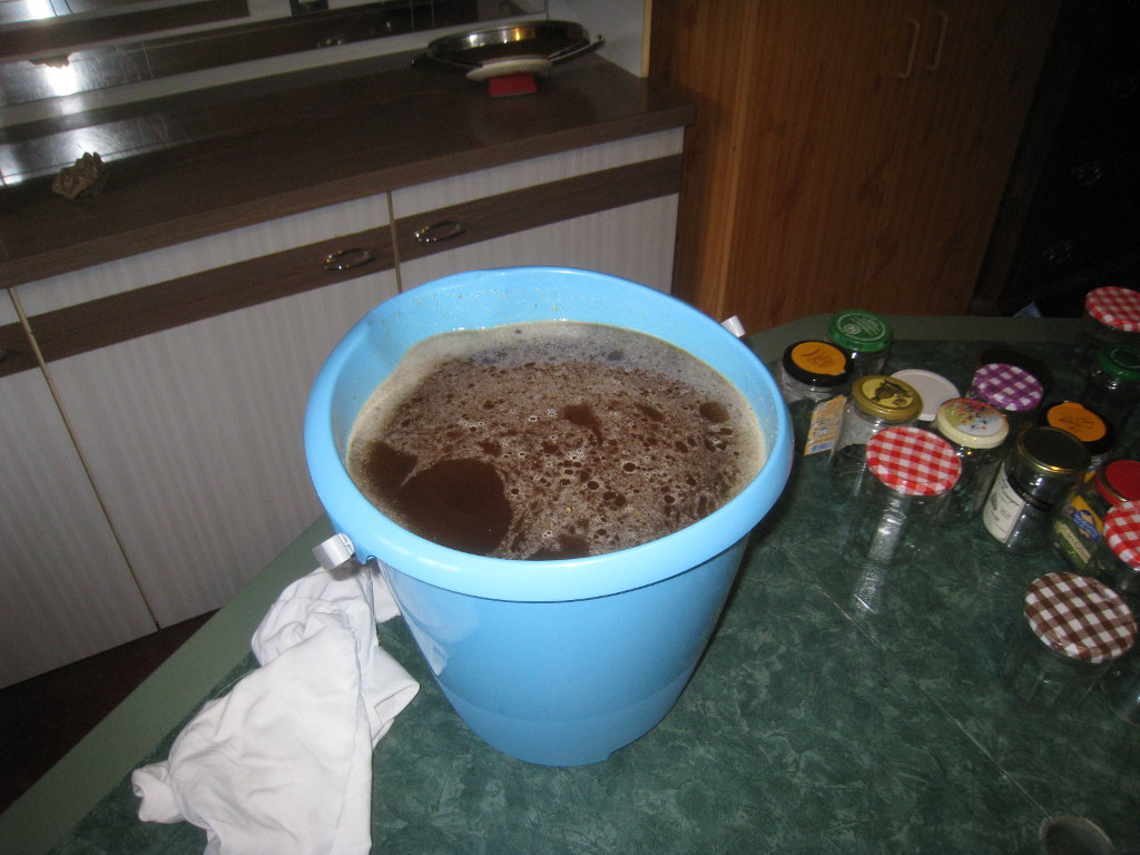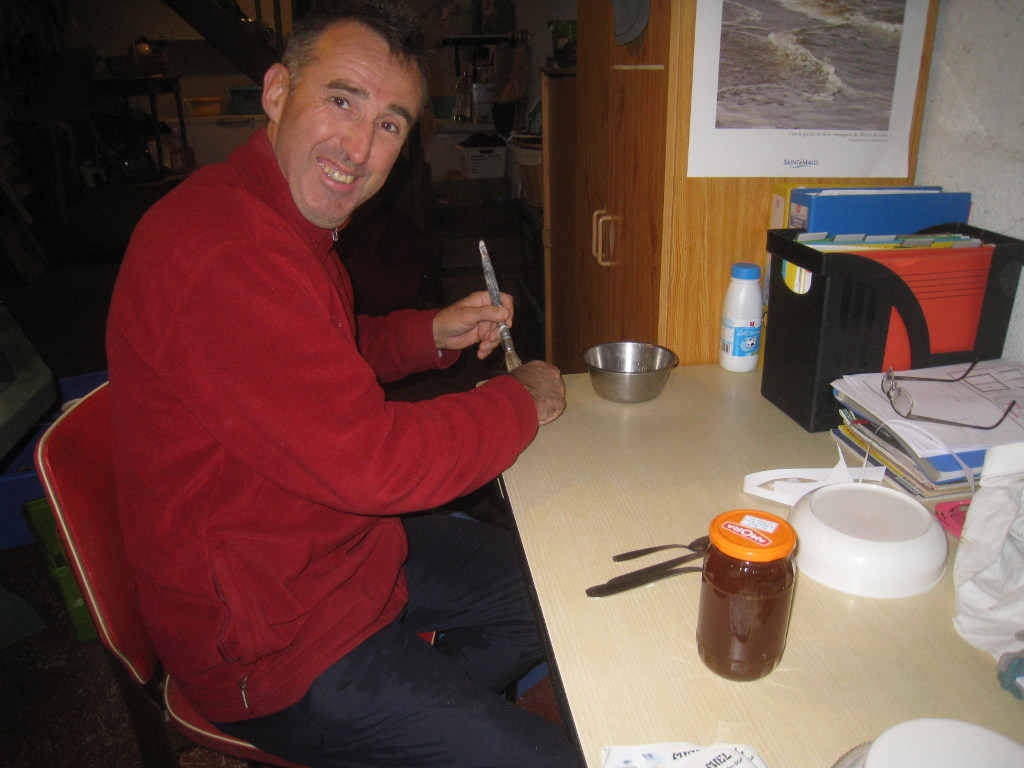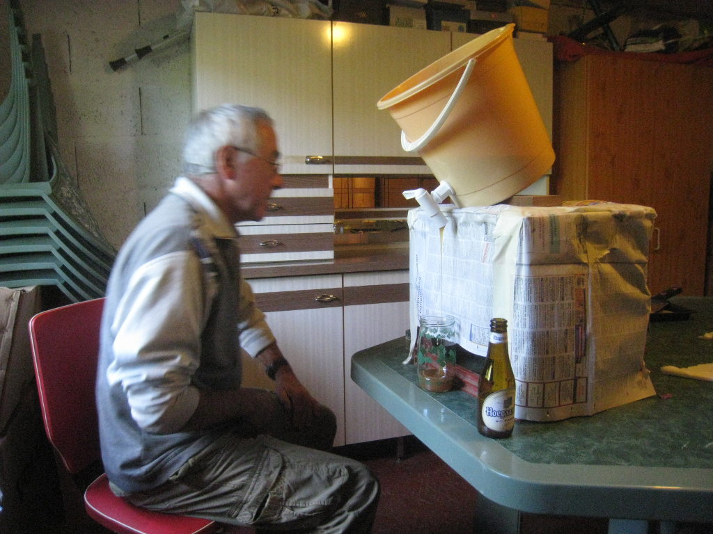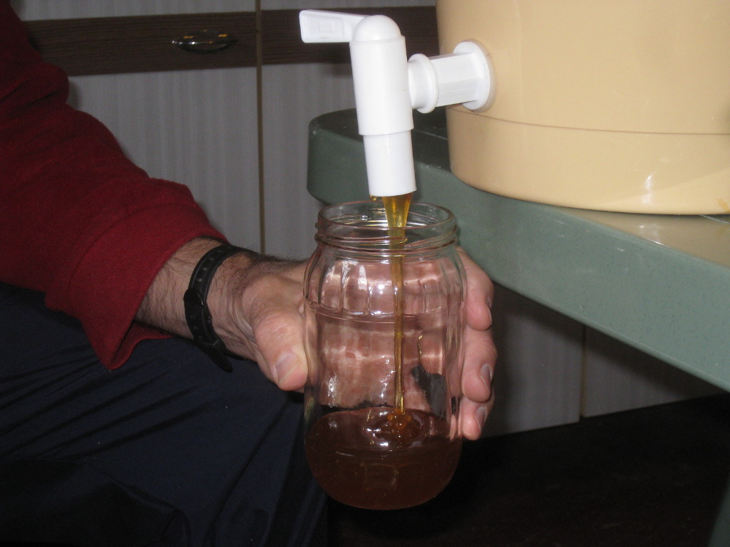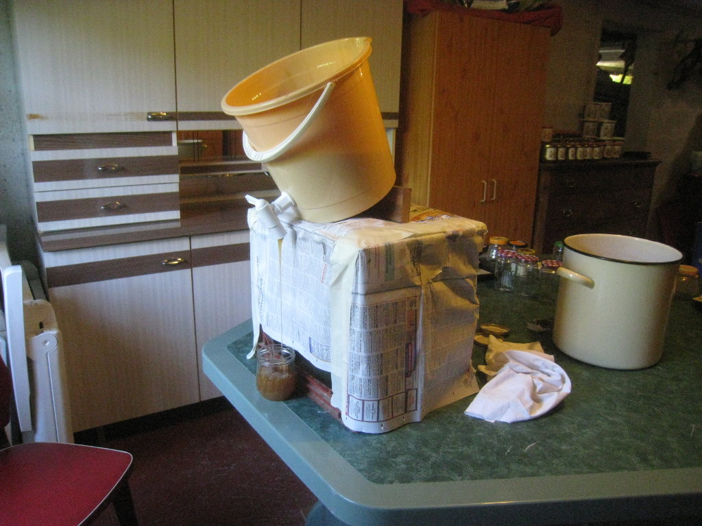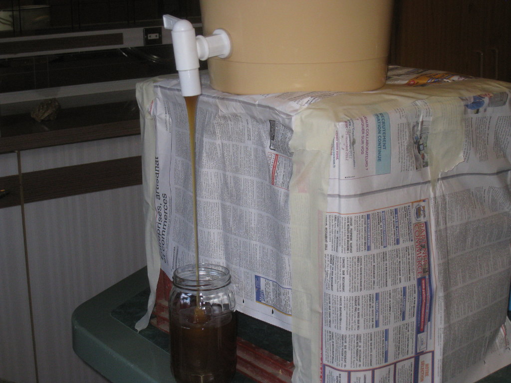Sur la troisème photo, on remarque que le miel a une couleur différente : dans ce seau, le miel a été brassé durant la semaine pour le rendre plus crémeux :