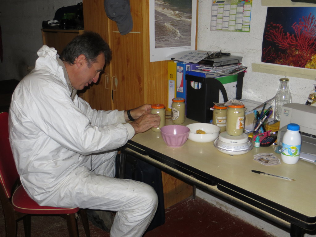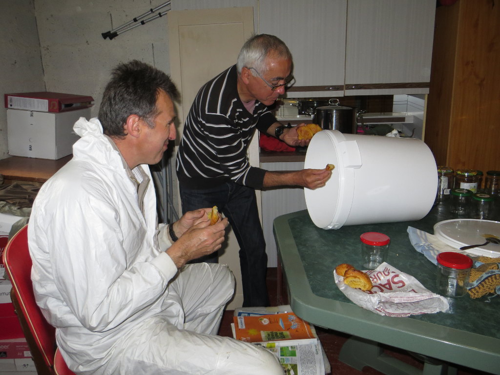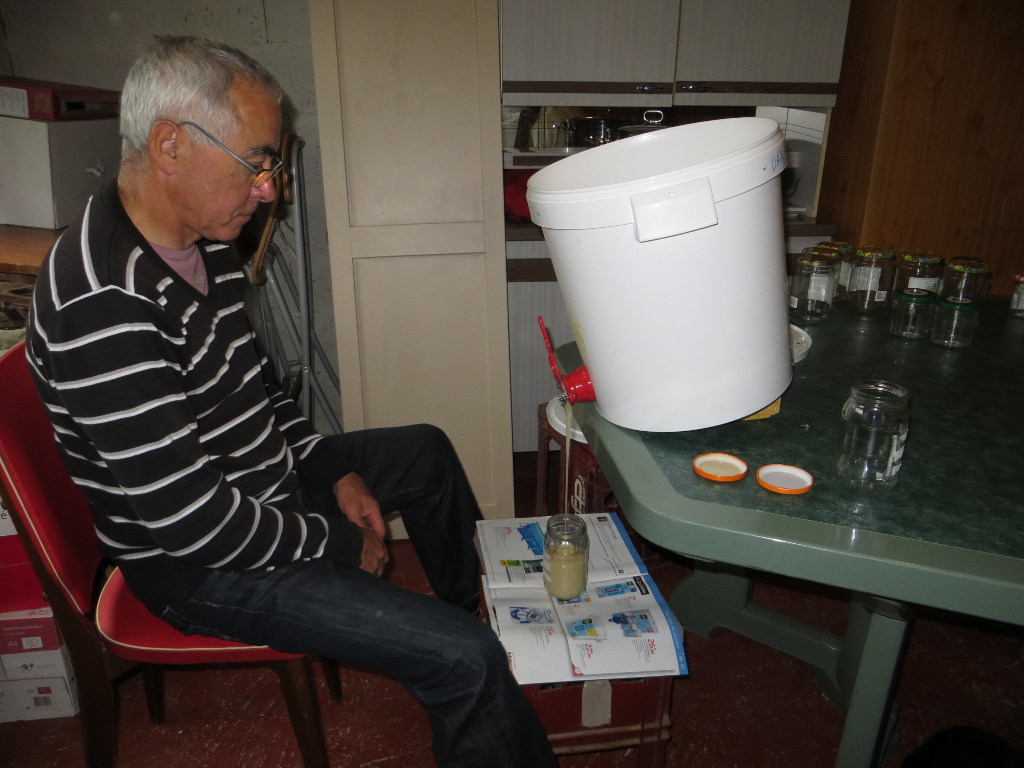 Lors de la décantation, le miel a figé et il nous faudra le réchauffer légèrement pour le fluidifier. À part ça, tout se passe bien :