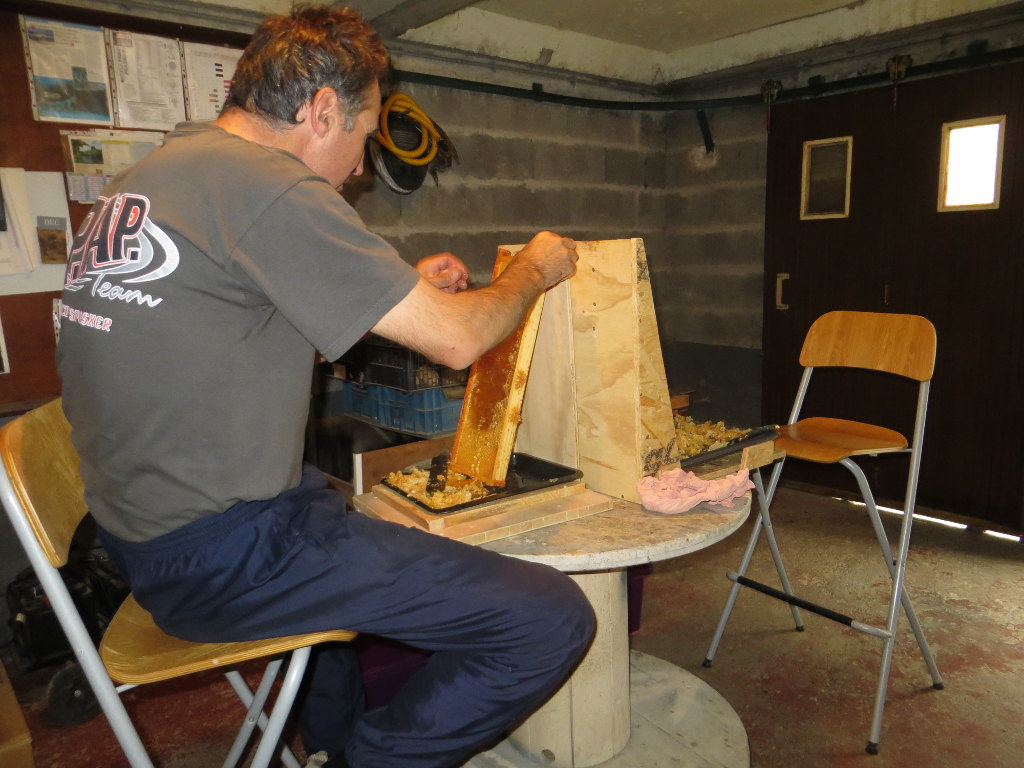 2014/09/21 : Extraction d'étéMis à jour : 30 octobre 2016 | Imprimer | Affichages : 2141Nous prenons soin de ne pas mélanger le miel de nos différents sites : En images : Estimations à la louche : LC : environ 40 kg ; LO : environ 35 kg ; CD : environ 30 kg ; LF : environ 10 kg ; MD : environ 20 kg ; Précédent Suivant