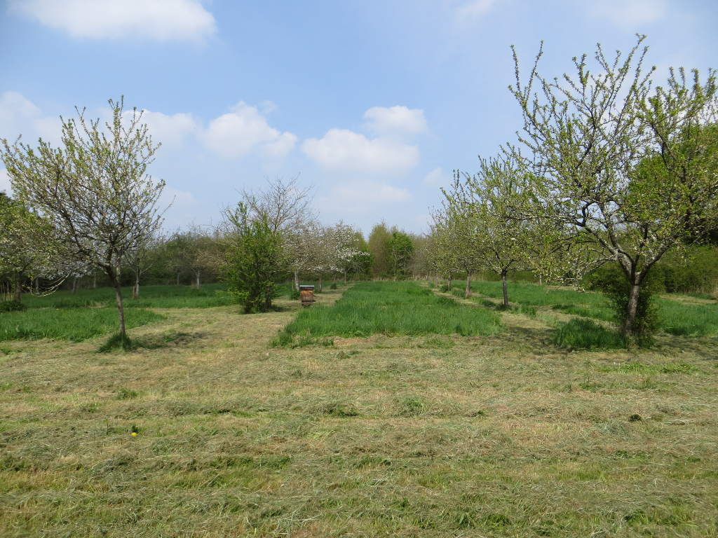 Nous avons aussi Jeudi soir déplacé quelques ruches, en particulier une des miennes, transportée comme l'an passé dans un verger de pommiers. Il était grand temps, car avec cette absence d'hivers, les premières fleurs des pommiers commencent déjà à s'ouvrir :