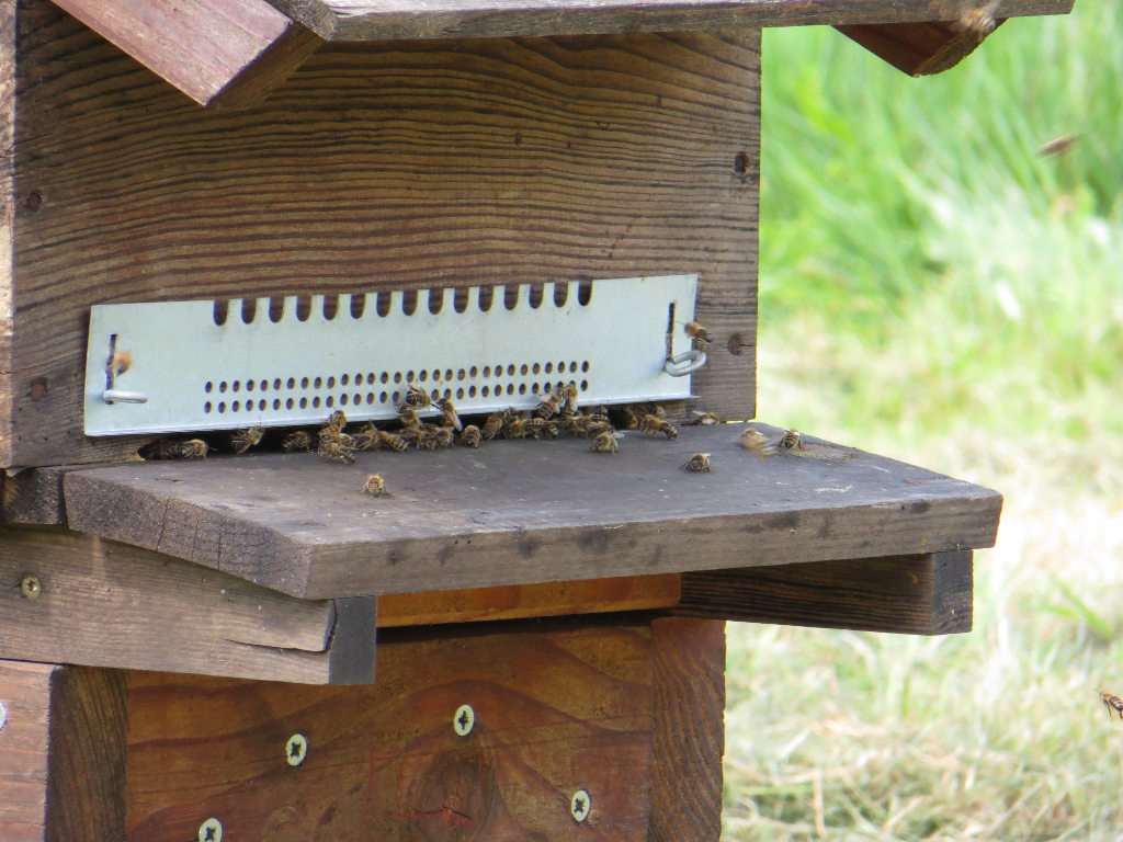 Tous les cadres sont d'ailleurs tellement remplis qu'on a posé les hausses dans la foulée, pour que les abeilles aient à la fois de quoi construire de nouvelles alvéoles de cire (c'est le travail des cirières, les jeunes abeilles), et aussi de quoi stocker.