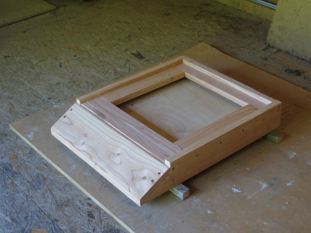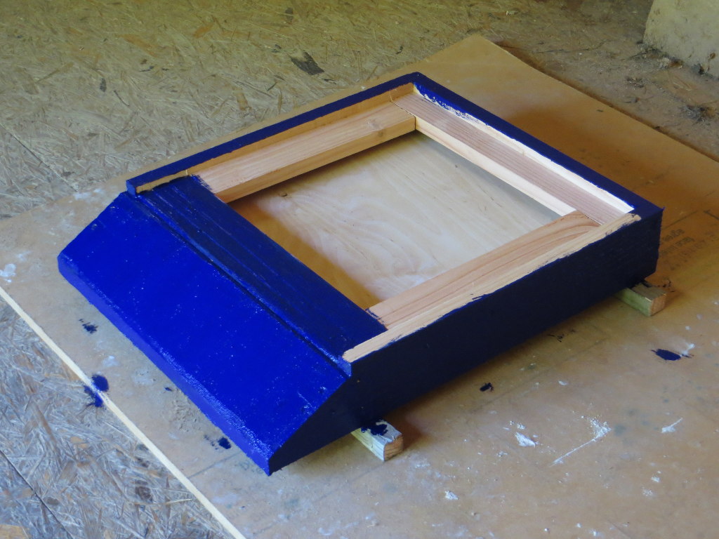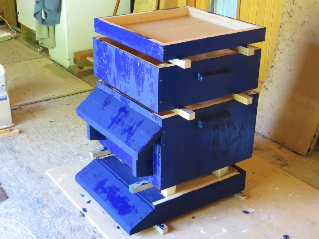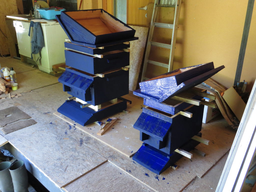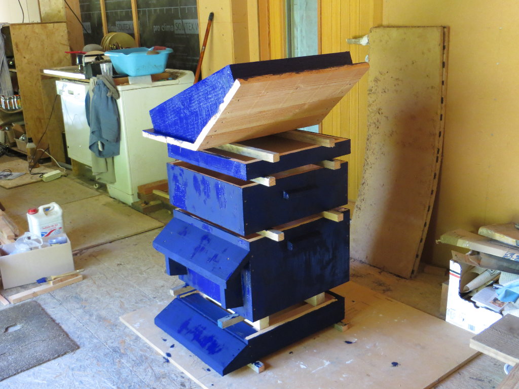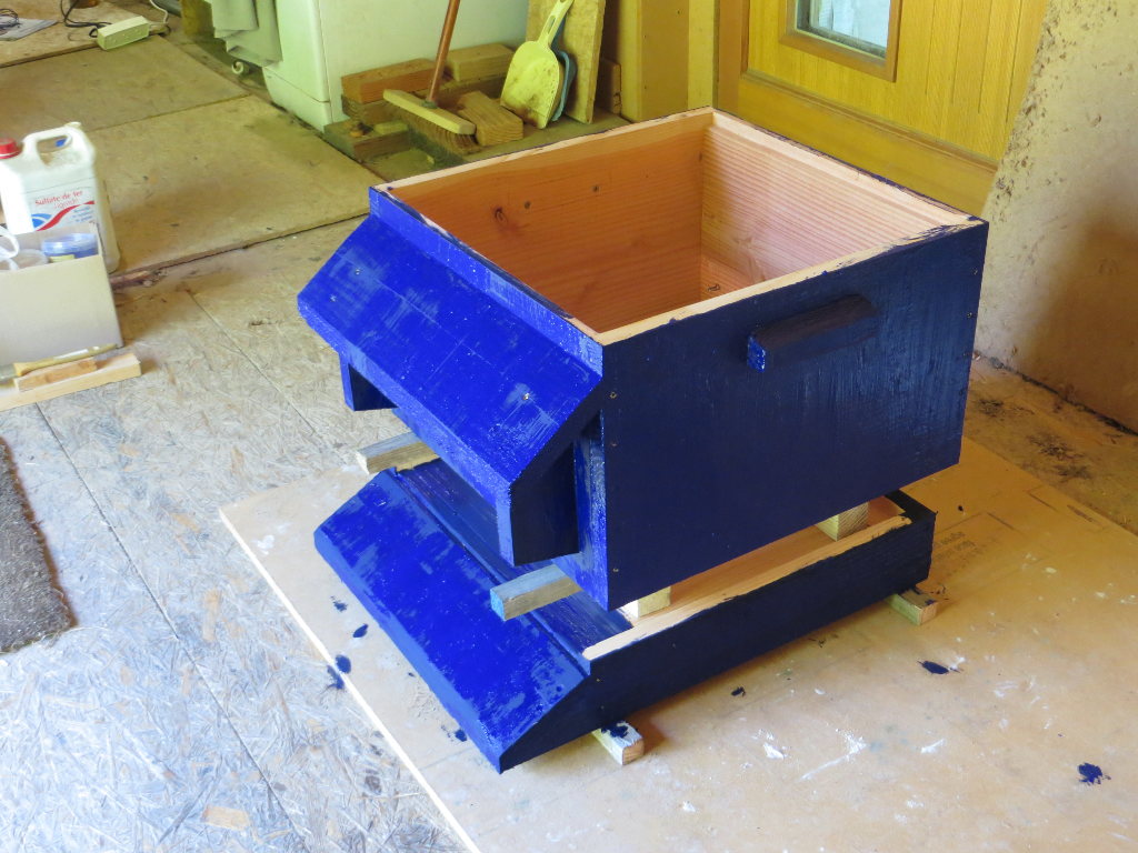 2014/05/16 : Construction (4)Mis à jour : 13 février 2016 | Imprimer | Affichages : 2243Peinture à l'ocre de la première ruche et de la ruchette : La peinture : L'avancée du travail :