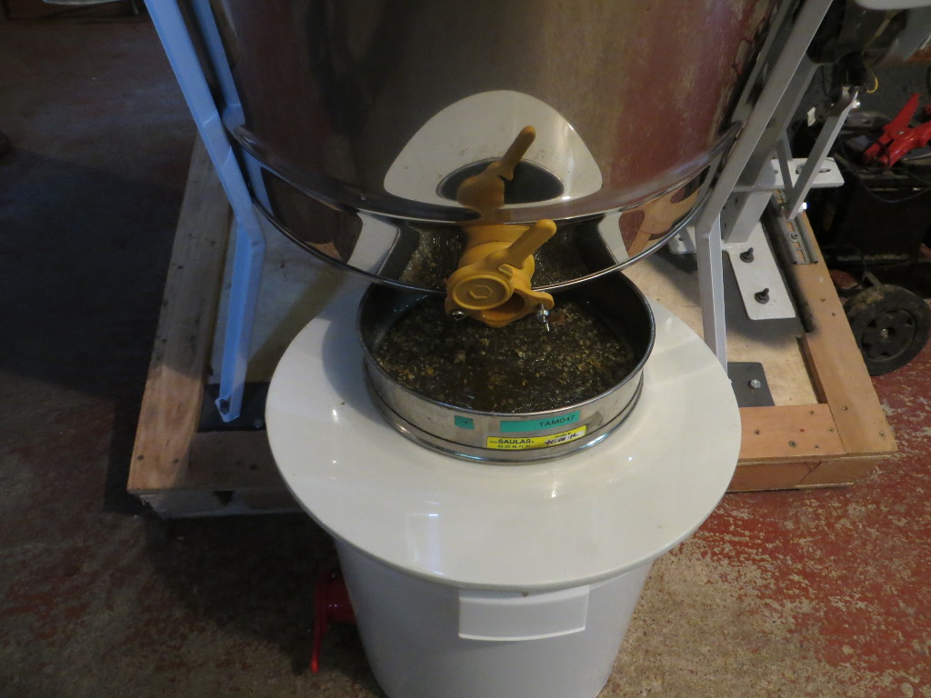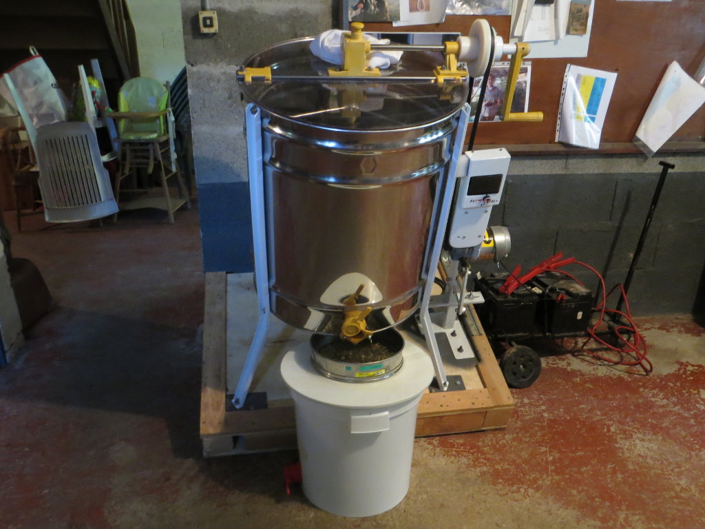 2015/05/12 : Extraction de printemps (1-bis)Mis à jour : 30 octobre 2016 | Imprimer | Affichages : 1699 Ce mardi, récolte et extraction de la ruche à Dany ... Gros plan sur l'extracteur : Le miel semble plus sombre sur sur nos précédents sites. Production à vue de nez : 1 hausse (9/10c) de CD : une dizaine de kg ; À vérifier à la mise en pots ... Précédent Suivant