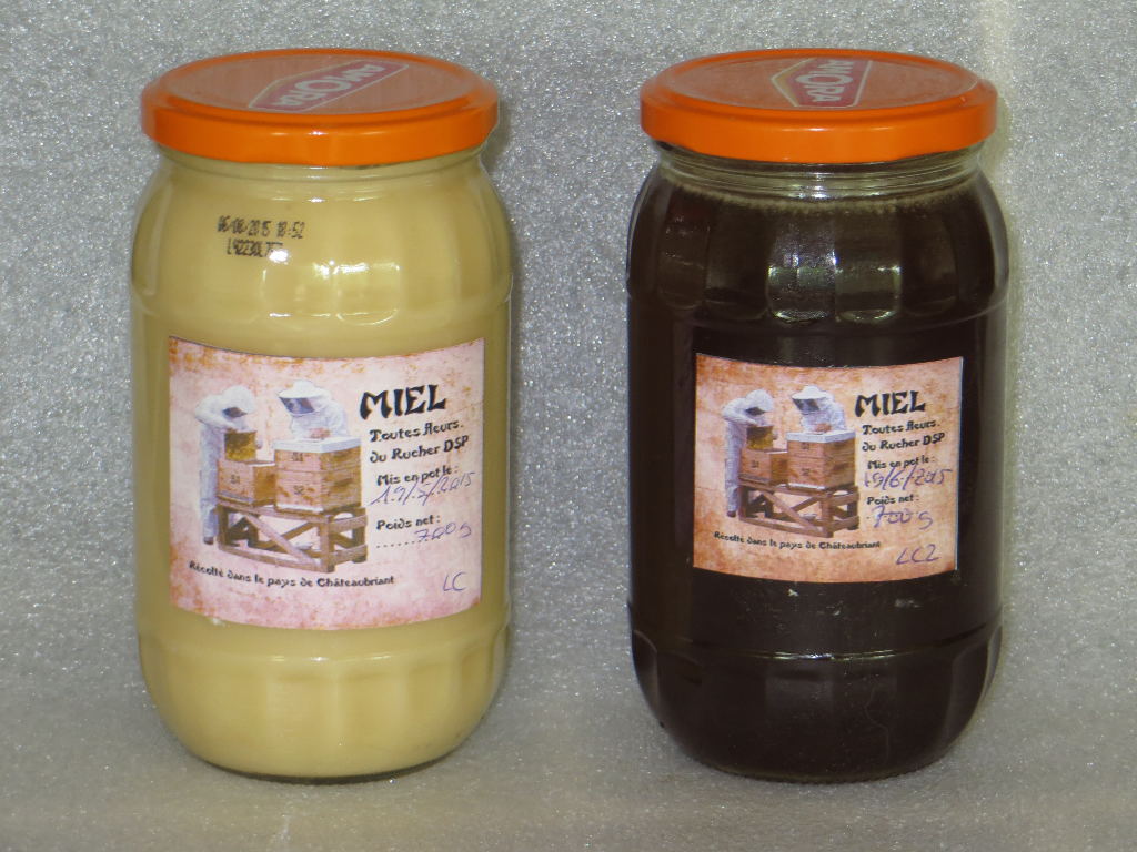 À gauche, le miel mis en pot il y a un mois, à droite celui de ce jour :