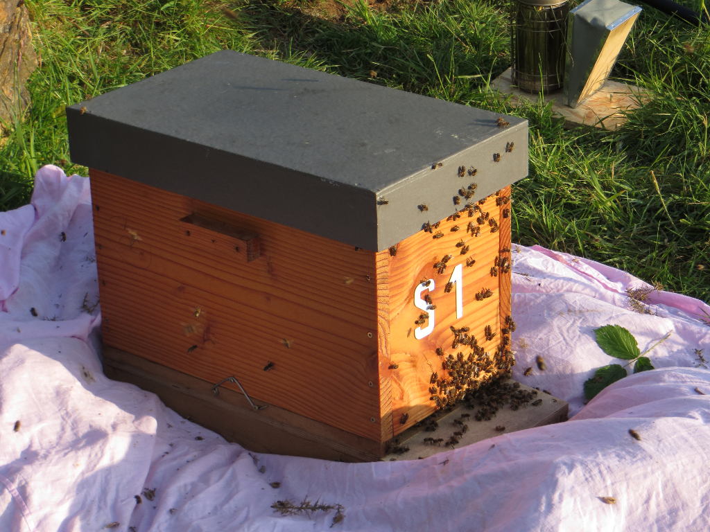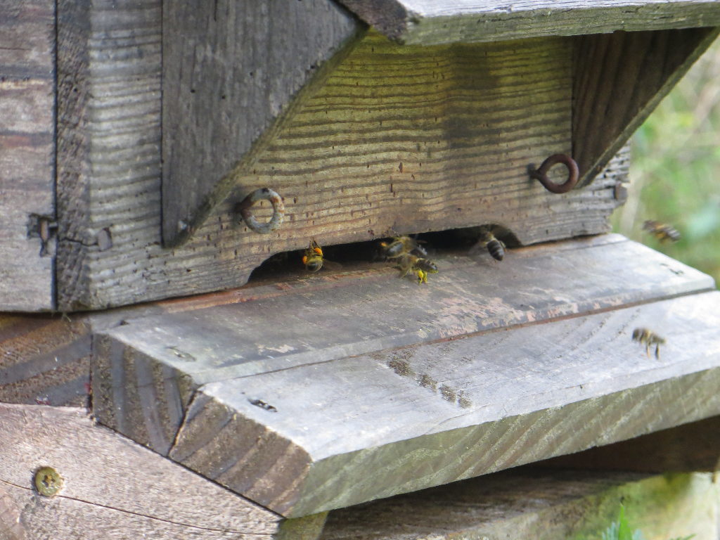 Sous la ruchette abritant un des derniers essaims, un attroupement :