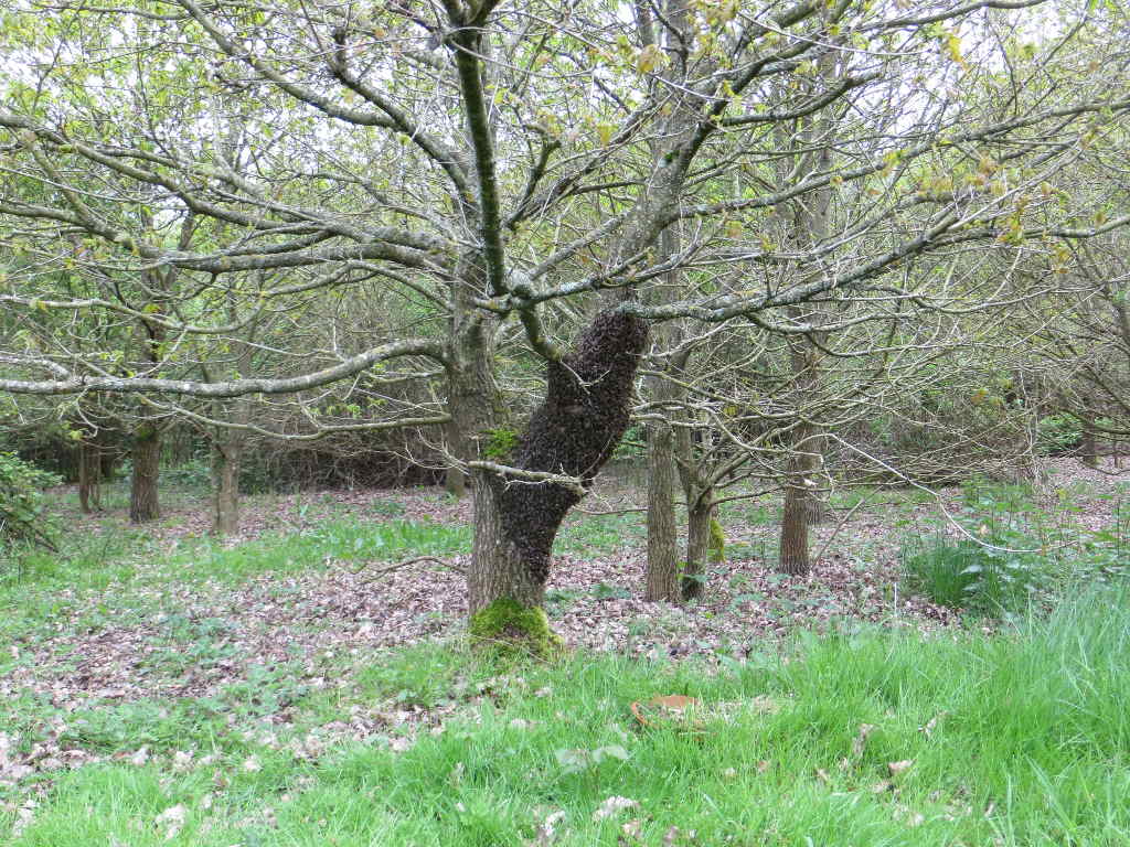 Nous allons cette fois chercher un essaim sauvage, posé sur un arbre le long d'une petite route de campagne -pas de photos, hélas).